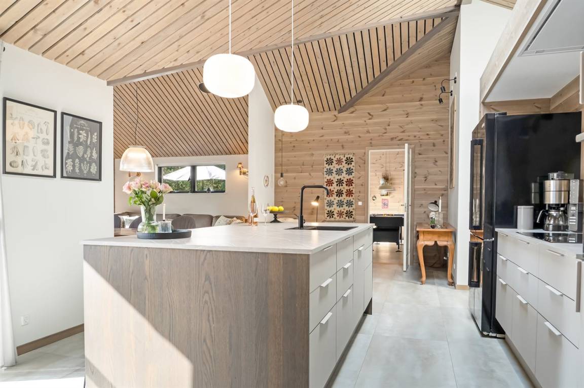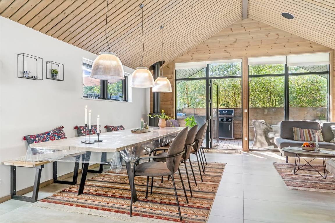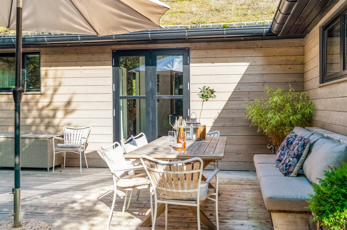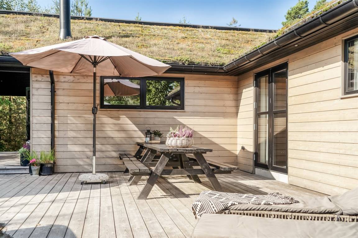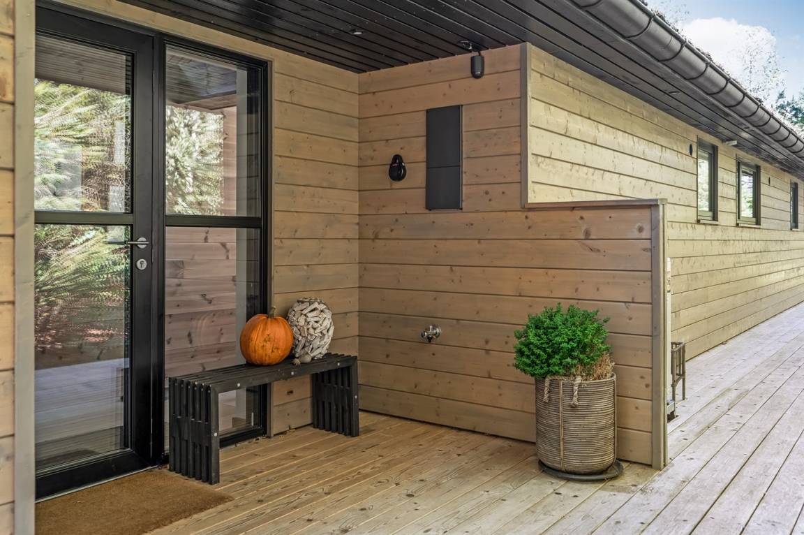 DraußenDie Ferienunterkunft liegt auf einem 1250 m² großen Naturgrundstück. Die Entfernung zum Meer beträgt 380 m. Die Entfernung zum Fjord beträgt 2050 m. Die nächste Einkaufsmöglichkeit liegt 2170 m entfernt. In einem Abstand von 1300 m gibt es einen Golfplatz. Es steht ein offenes Terrassenareal zur Verfügung. Außerdem gibt es überdachte Terrasse. Außendusche. Es beteht die Möglichkeit das Essen in der Außenküche zuzubereiten. Es steht ein Grill zur Verfügung. Es ist ein Ladestecker für Elektroautos installiert. Ladestecker Typ 2. Mit einer Ladeleistung von 11 kW. Parkplatz auf dem Grundstück.