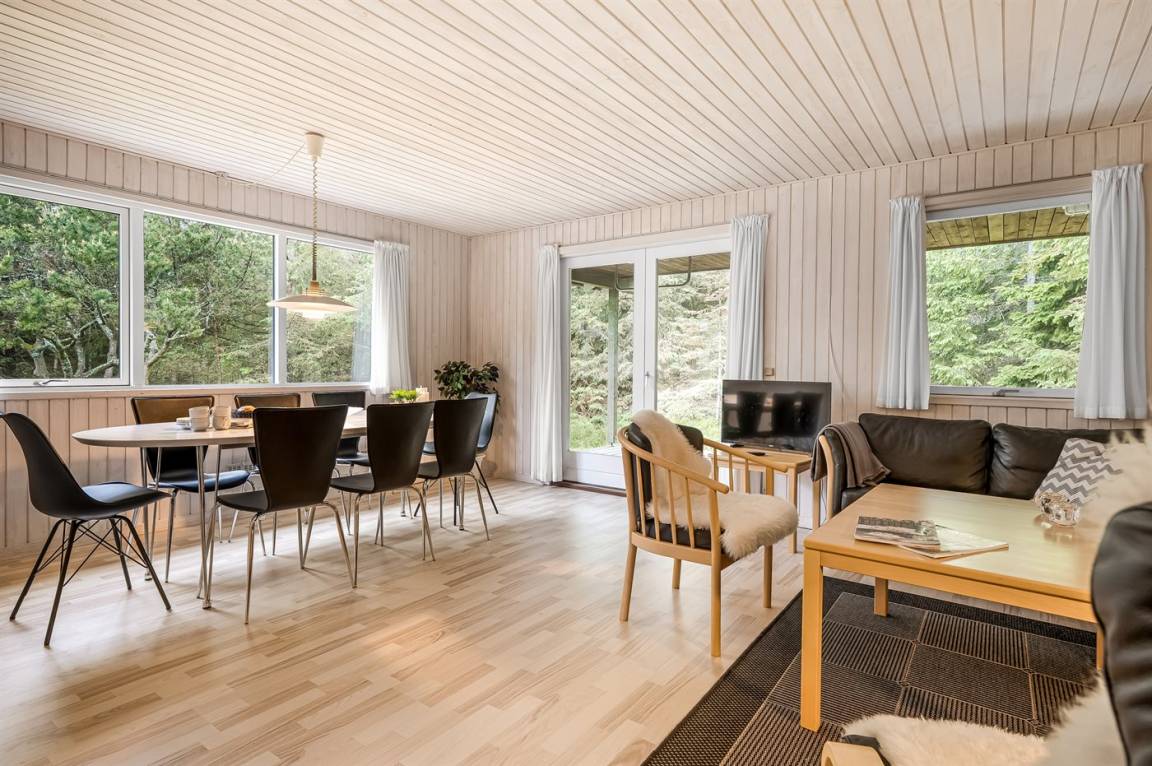 DraußenDie Ferienunterkunft liegt auf einem 1279 m² großen Naturgrundstück. Die Entfernung zum Meer beträgt 370 m. Die Entfernung zum Fjord beträgt 2100 m. Die nächste Einkaufsmöglichkeit liegt 2200 m entfernt. In einem Abstand von 1600 m gibt es einen Golfplatz. Es steht ein offenes Terrassenareal zur Verfügung. Außerdem gibt es überdachte Terrasse. Es steht ein Grill zur Verfügung. Parkplatz auf dem Grundstück.