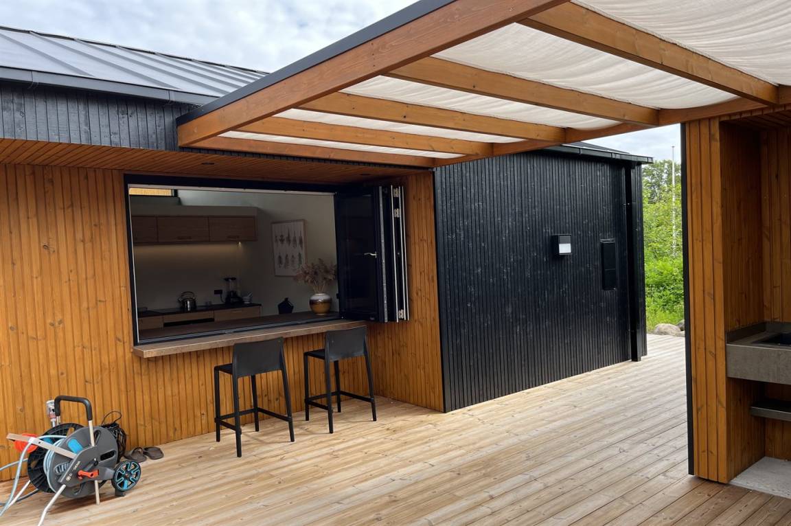Darüber hinaus gibt es eine überdachte Terrasse mit Außenküche, die etwa 40 m² misst, sodass du die Möglichkeit hast, das Essen auf der großartigen Terrasse zuzubereiten und zu genießen, ohne nass zu werden. Die überdachte Terrasse ist mit einer eingebauten Elektroheizung in der Decke ausgestattet, sodass die Abende verlängert werden können.