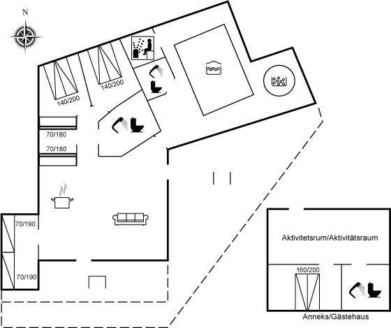 Es gibt ein neues Gästehaus, das mit einem Aktivitätsraum mit Darts, Mini-Airhockey, Mini-Poolbillard und TV ausgestattet ist, sowie ein Schlafzimmer mit Doppelbett und ein Badezimmer.