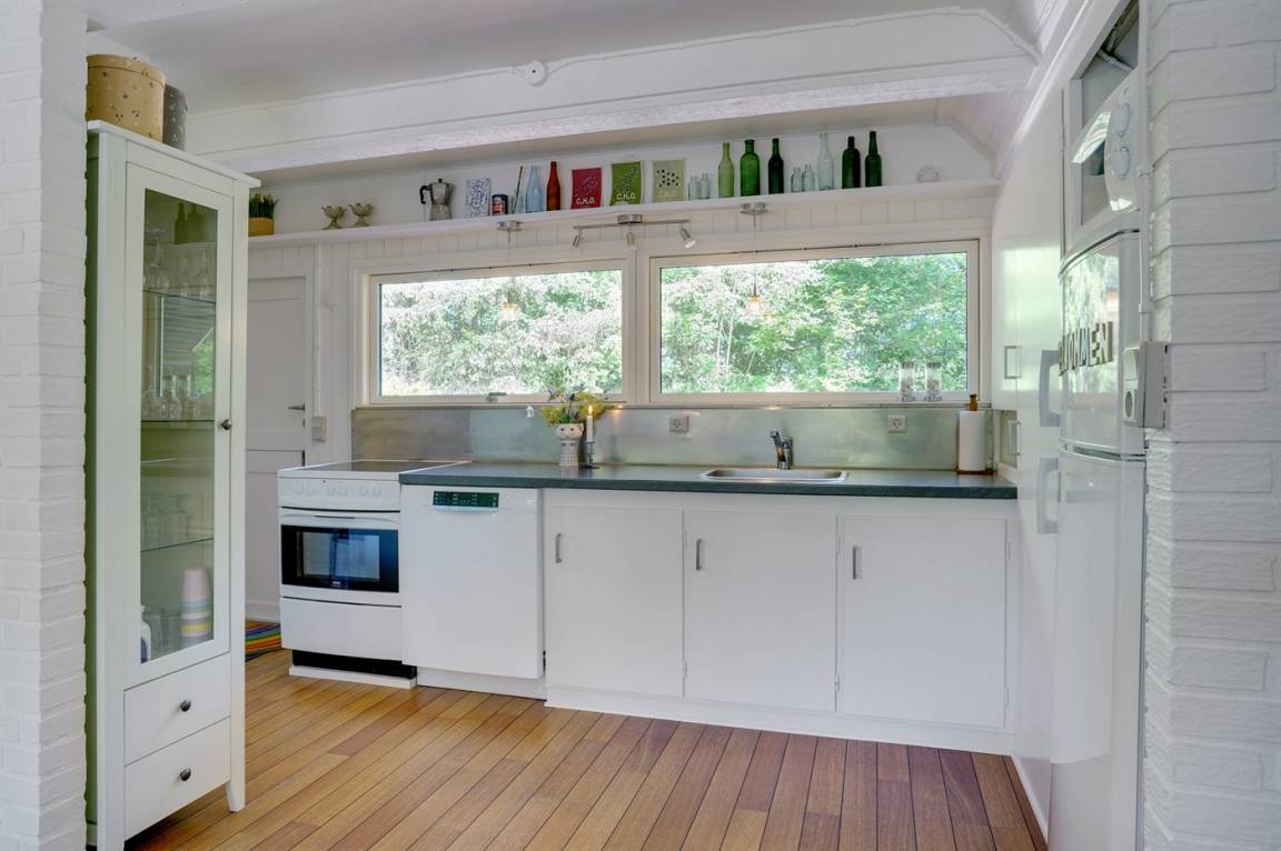 Die Küche mit 1 Kühlschrank (mit 40-l-Gefrierfach), 4 Keramikkochfeldern, Backofen, Mikrowelle und Spülmaschine befindet sich im Erdgeschoss – genau wie das relativ neue Badezimmer mit Fußbodenheizung, Duschnische und Toilette.