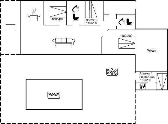 DraußenDie Ferienunterkunft liegt auf einem 1289 m² großen Gartengrundstück. Die Entfernung zum Meer beträgt 1500 m. Die nächste Einkaufsmöglichkeit liegt 1200 m entfernt. In einem Abstand von 7000 m gibt es einen Golfplatz. Es steht eine geschlossene Terrassenfläche zur Verfügung, von der 15 m² überdacht sind. Fußballtor. Außendusche. Es beteht die Möglichkeit das Essen in der Außenküche zuzubereiten. Es steht ein Grill zur Verfügung. Parkplatz auf dem Grundstück.