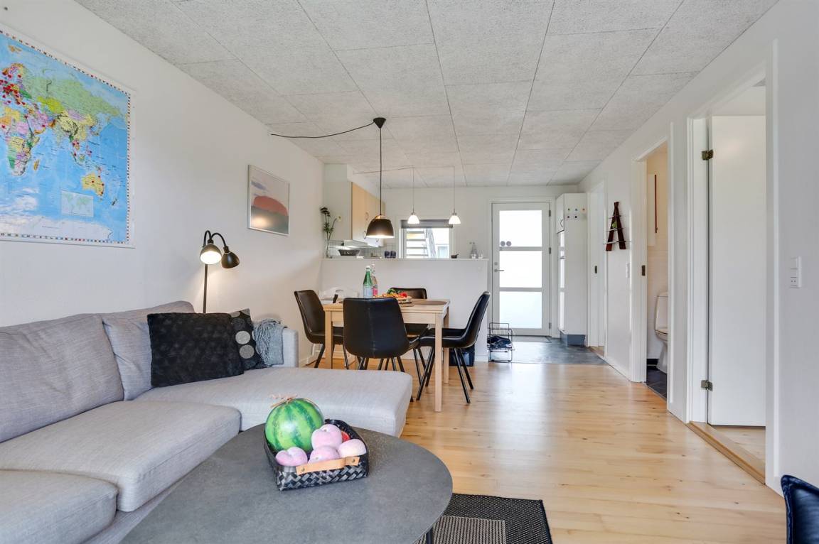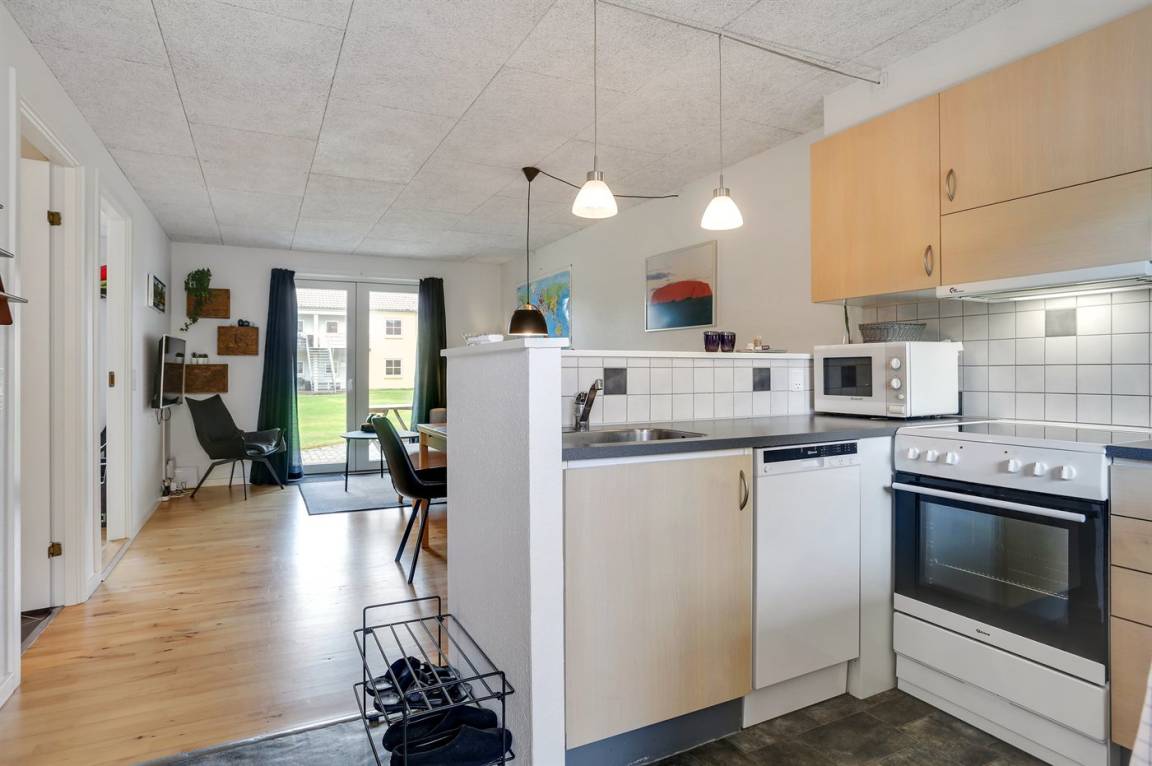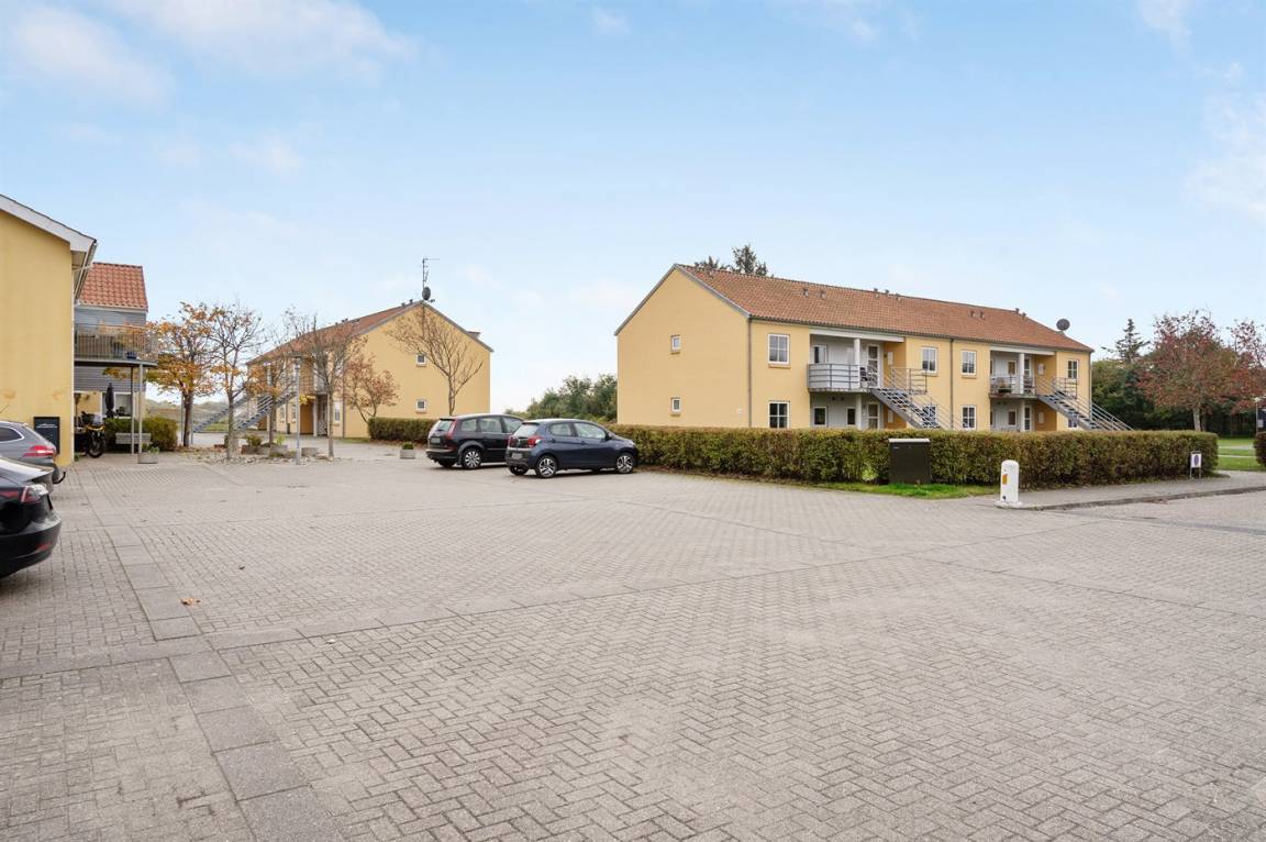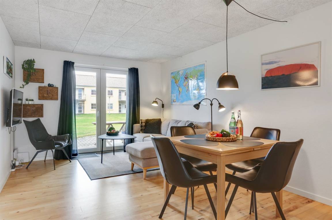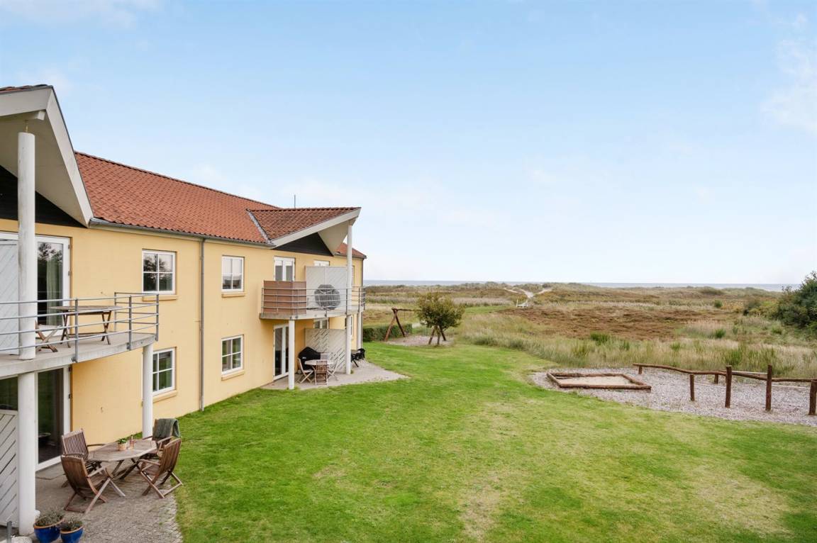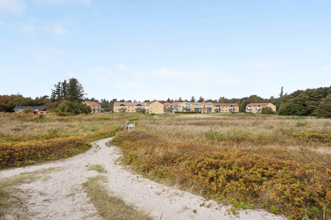 Von der Terrasse besteht direkter Zugang zum Spielplatz und zu den gemeinschaftlichen Grünflächen, wo viel Platz zum Spielen und Toben ist. Die Wohnung bietet einen schönen Blick auf das Kattegat und liegt in landschaftlich reizvoller Umgebung zwischen Hou und Hals.