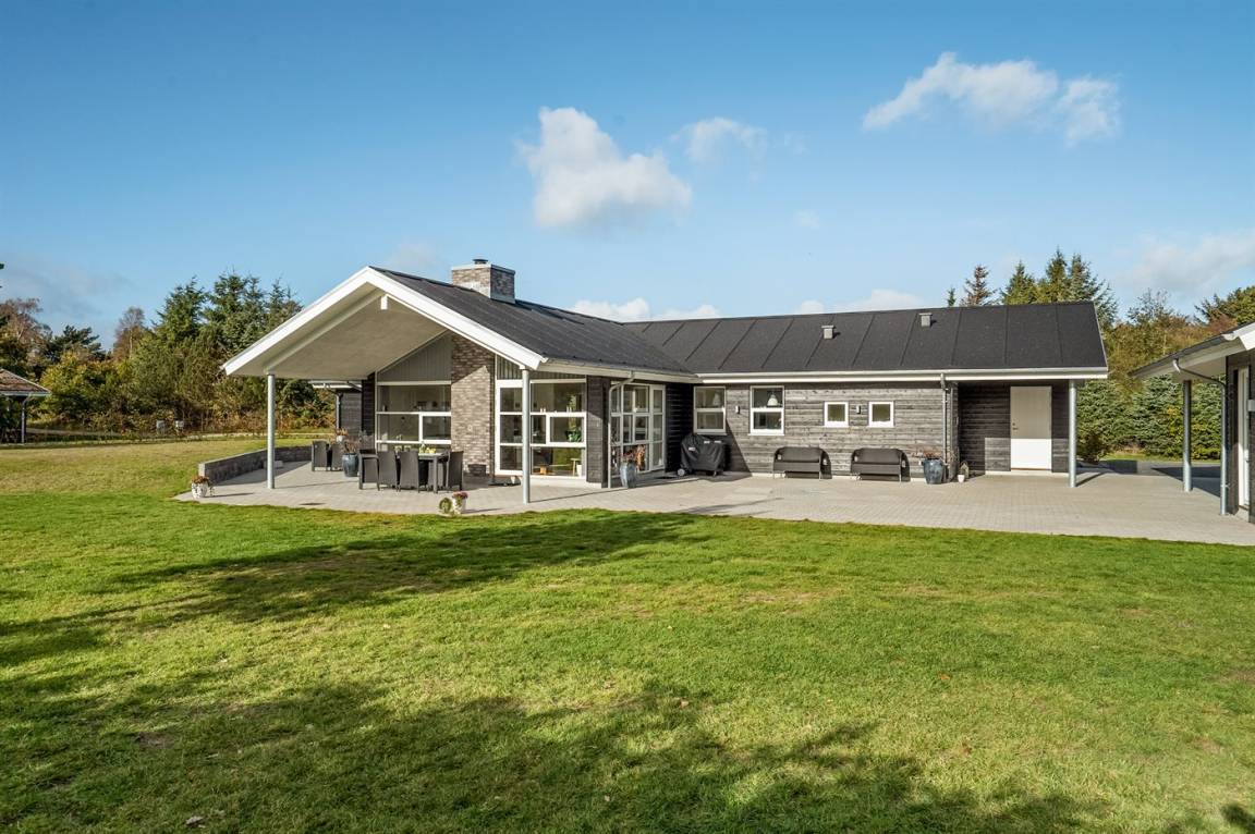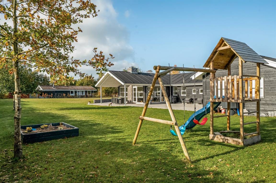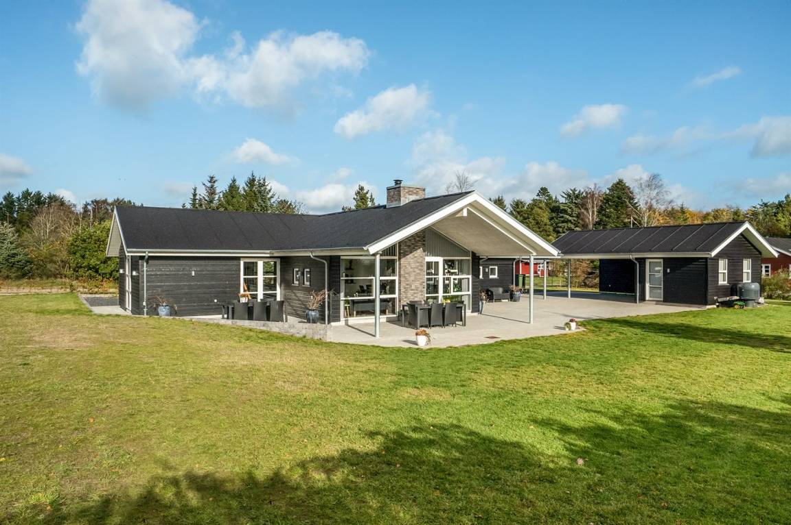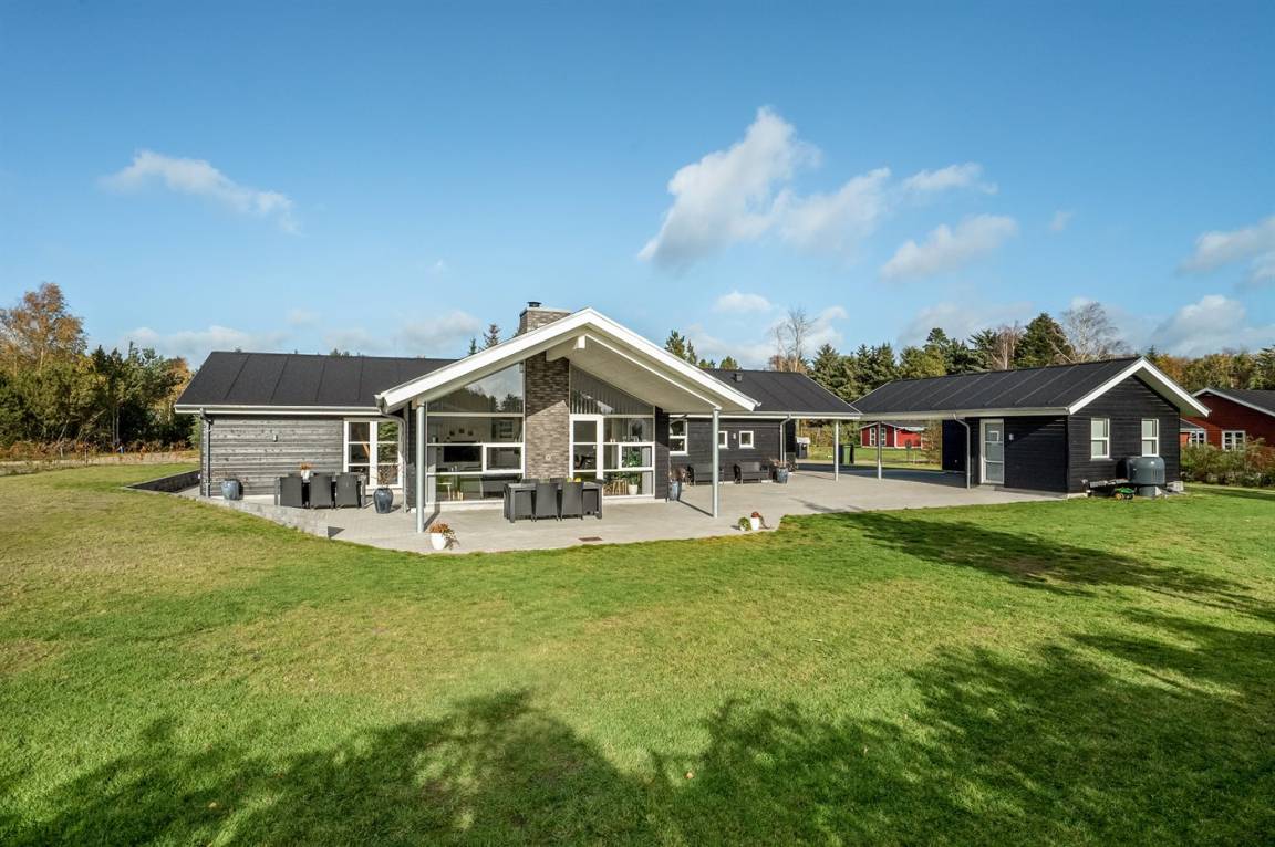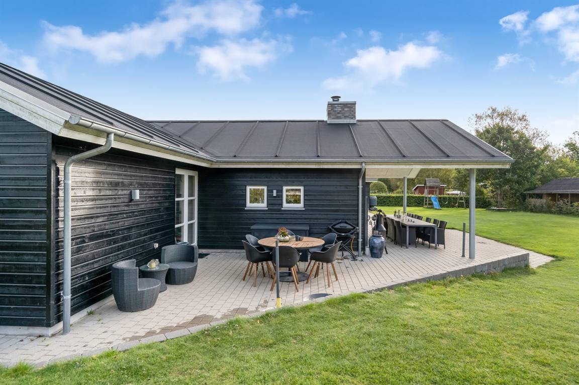 Ein großes Ferienhaus mit offenem Obergeschoss, in Hou an der Nordostseeküste. Das Grundstück ist groß, mit Rasen und sehr großer und teilweise überdachter Terrasse mit Gartenmöbeln, Sonneliegen, Sandkasten und ein Schaukel für die Kinder.