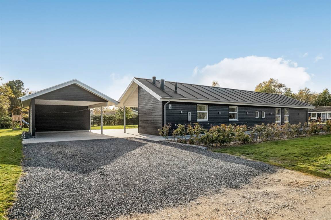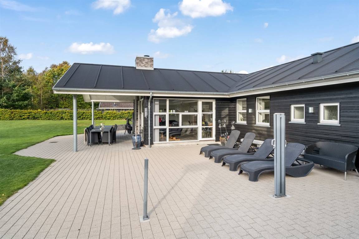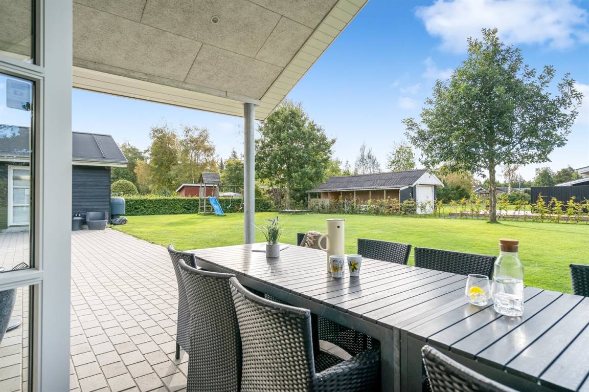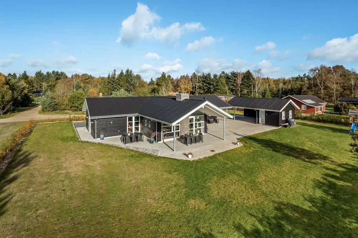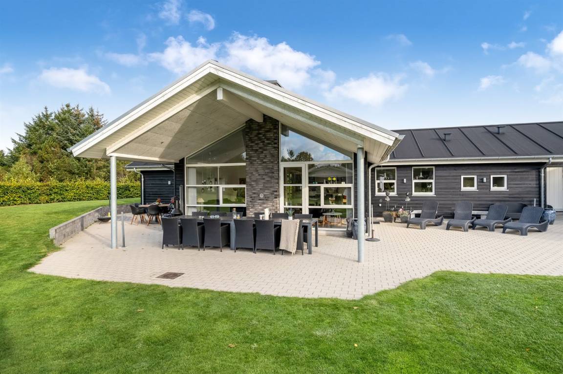 Ein großes Ferienhaus mit offenem Obergeschoss, in Hou an der Nordostseeküste. Das Grundstück ist groß, mit Rasen und sehr großer und teilweise überdachter Terrasse mit Gartenmöbeln, Sonneliegen, Sandkasten und ein Schaukel für die Kinder.