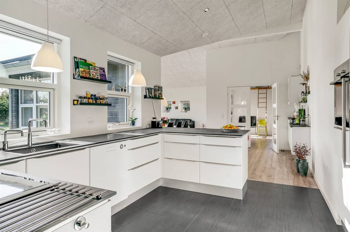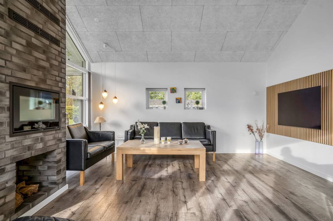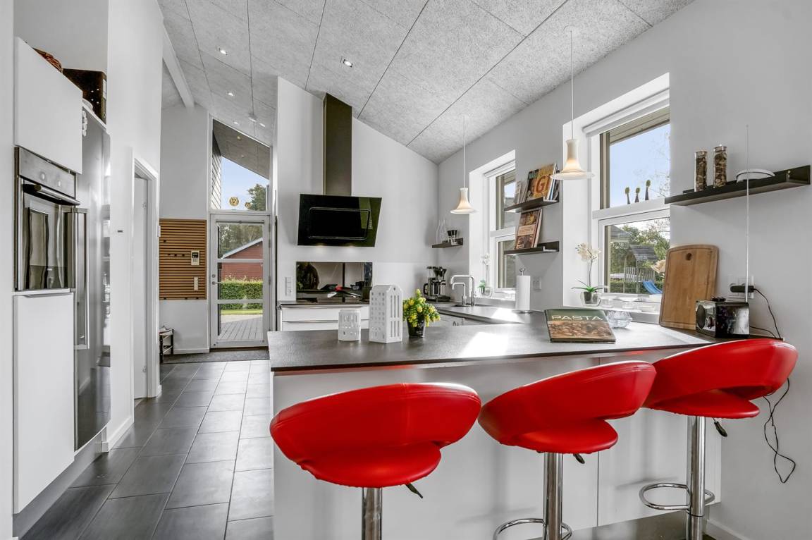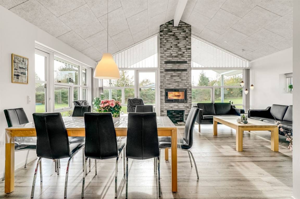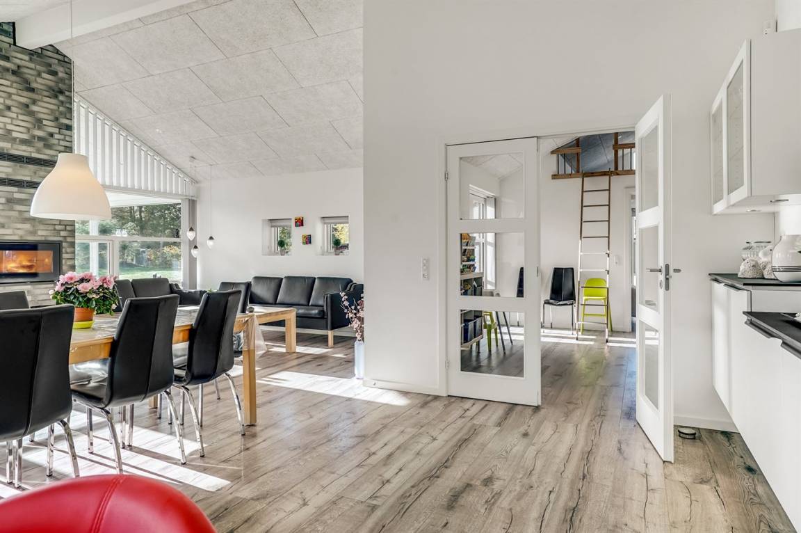 Ein großes Ferienhaus mit offenem Obergeschoss, in Hou an der Nordostseeküste. Das Grundstück ist groß, mit Rasen und sehr großer und teilweise überdachter Terrasse mit Gartenmöbeln, Sonneliegen, Sandkasten und ein Schaukel für die Kinder.
