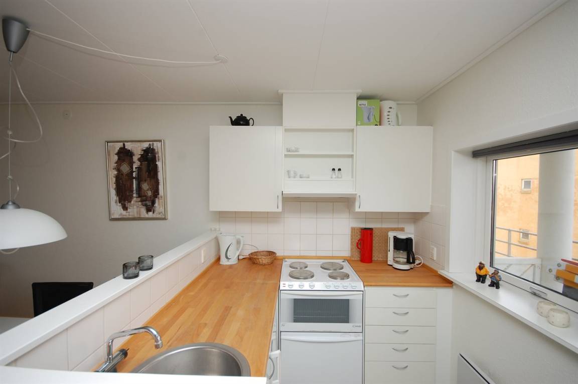 „Cleanliness: Leiligheden er - spescielt køkkent - noget nedslidt. Køkkenet har skæv bordplade, vandskader på bordpladen og et beskidt hjørne gemt bag ved køleskabet.“