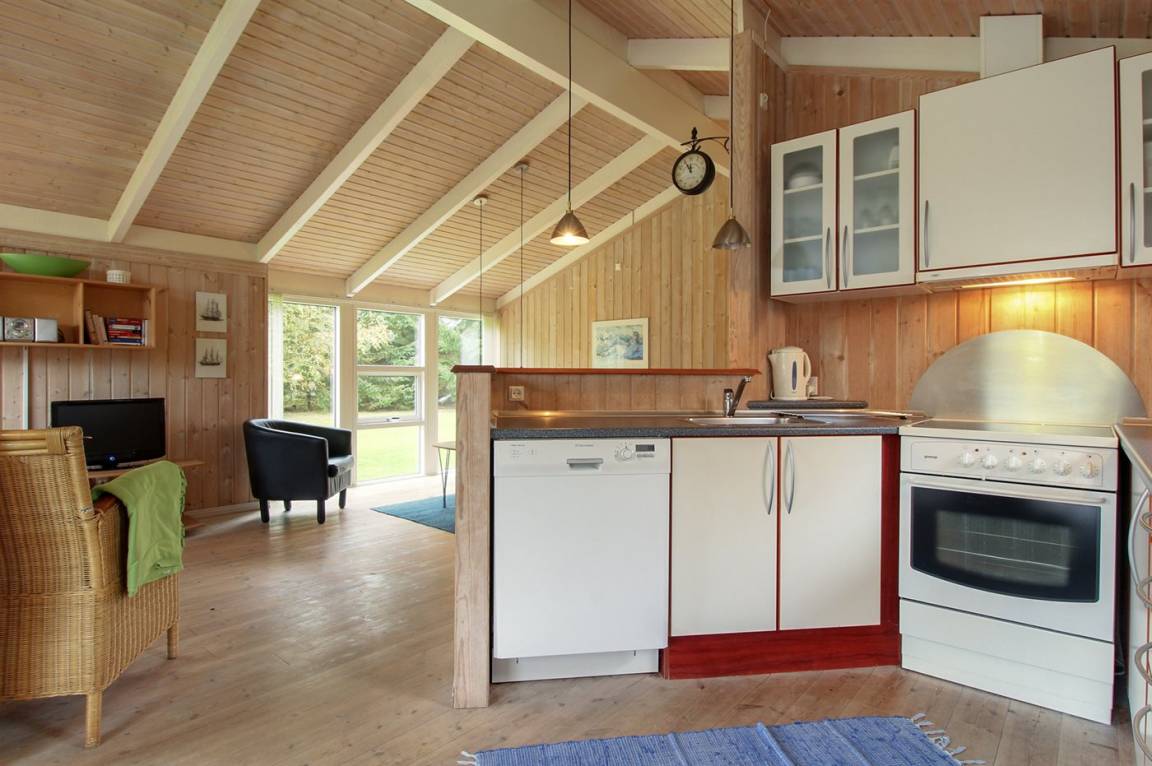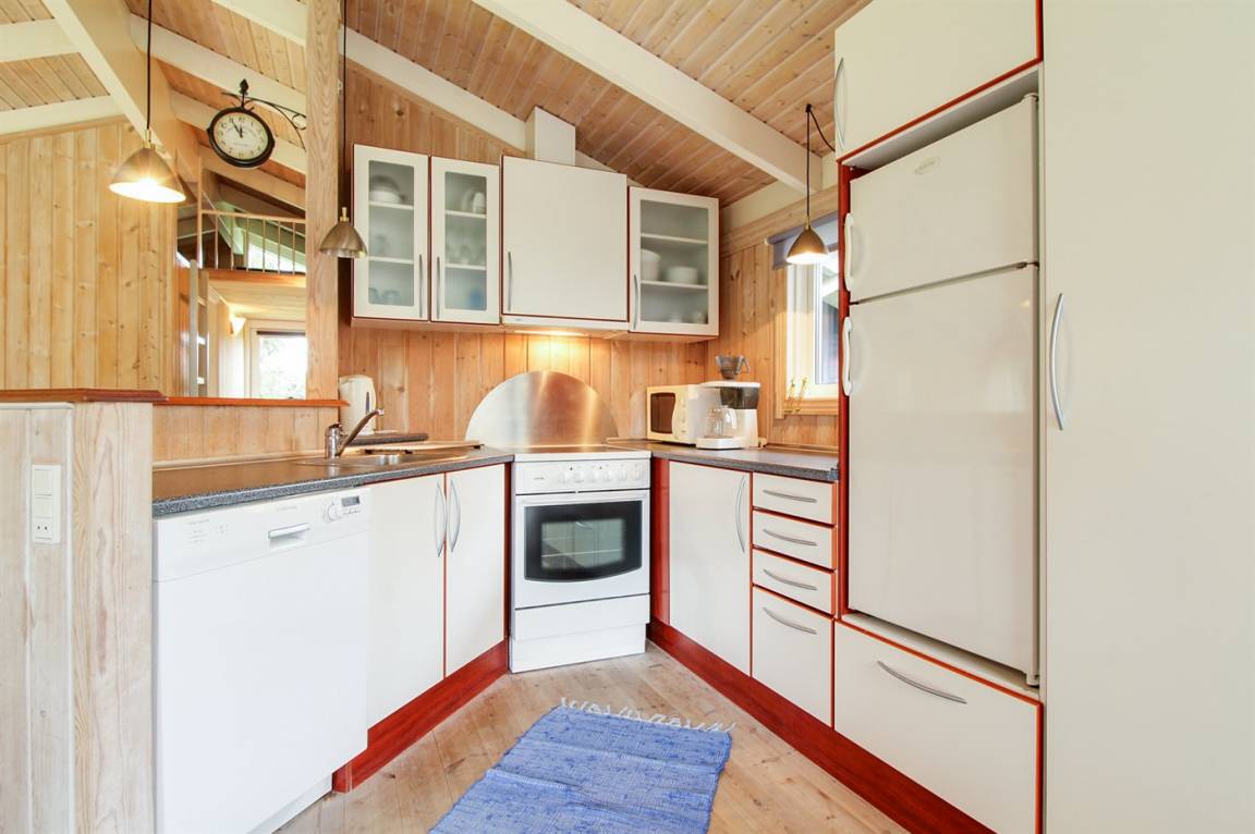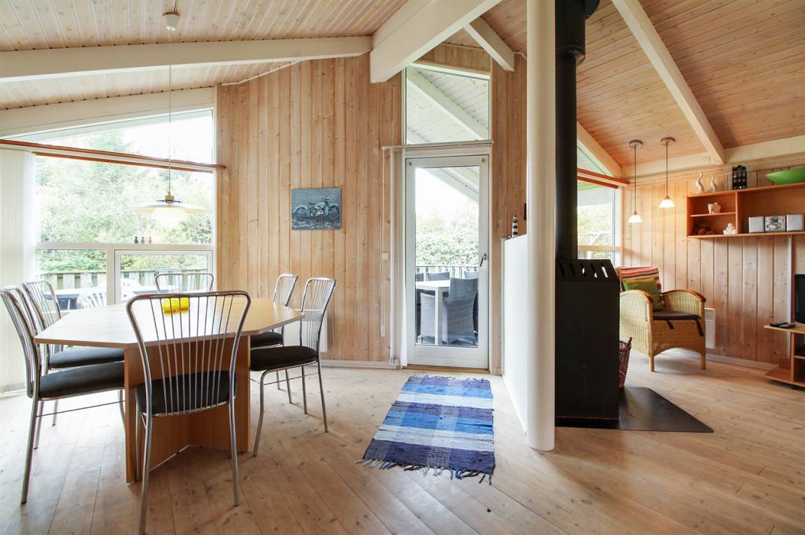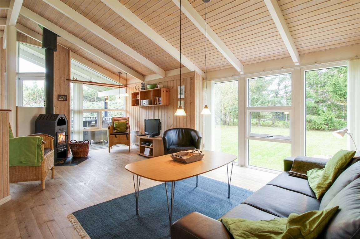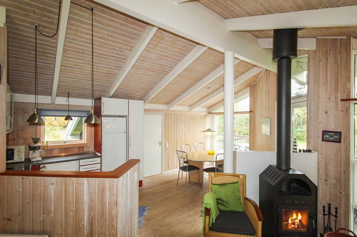 Hier ist von einem besonders prachtvollen Ferienhaus die Rede, 2001 aus Holz aufgeführt und auf einem Naturgrundstück gelegen. Offene und überdachte Terrasse. Innen sind die Wände, die Decken und die Böden mit hellem Holz verkleidet. Herrliches Badezimmer mit großer Duschnische, Fußbodenheizung, Waschmaschine und Wäschetrockner. In der hübschen Küche finden Sie Herd mit Ceran-Feld, Tiefkühlgerät, Geschirrspüler und Mikrowelle. Das gemütliche Wohnzimmer enthält Kaminofen, DVD-Spieler, Stereoanlage mit CD-Spieler und TV. 3 gute Schlafzimmer. Darüber hinaus 2 Schlafplätze im offenen Obergeschoss. Für die Jüngsten der Familie gibt es Kinderbett, Kinderhochstuhl, Sandkiste und Schaukel. Viele Aktivitätsmöglichkeiten in der Gegend.