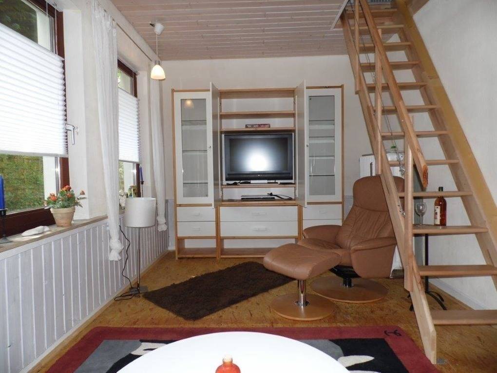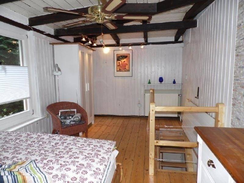 Das Schlafzimmer ist im ersten Stock und über eine schmale, steile Treppe erreichbar.