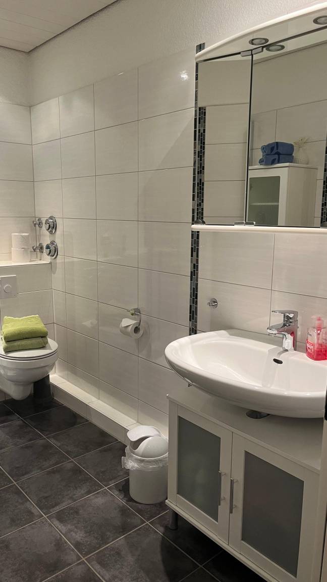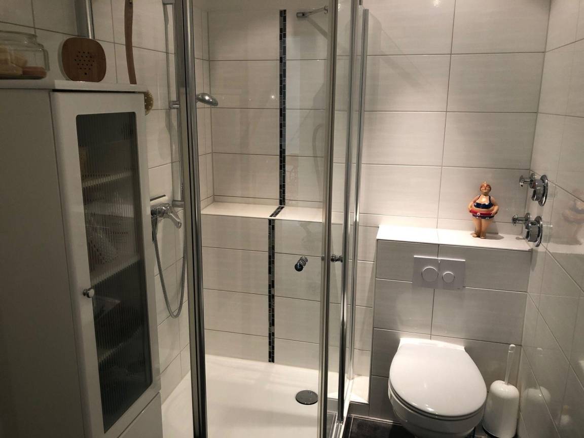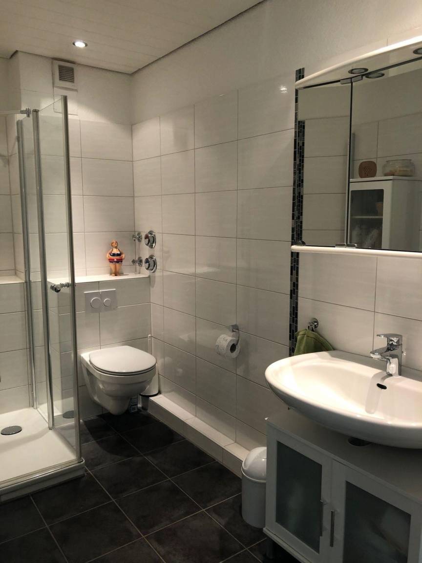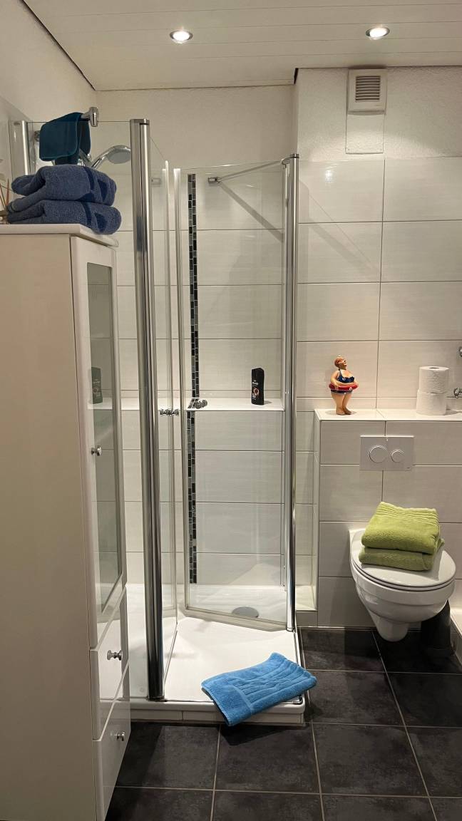 Das Badezimmer verfügt über eine fast bodentiefe Dusche, Handtuchheizkörper und Fön.