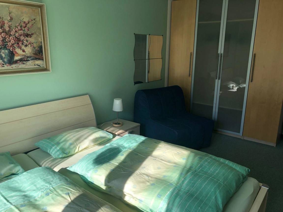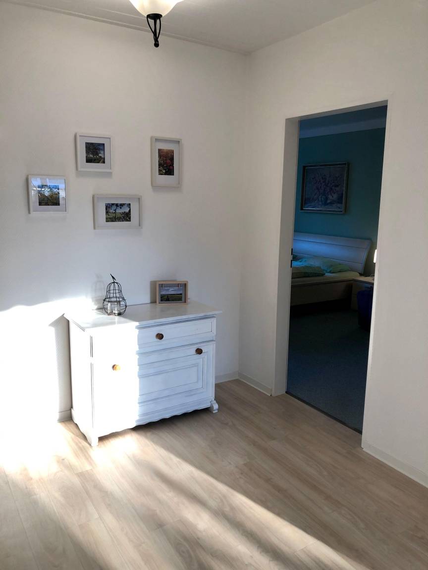 Die helle freundliche Ferienwohnung befindet sich in einem ruhigen Mehrfamilienhaus in der ersten Etage und verfügt über zwei Schlafzimmer. Ein großes Schlafzimmer mit einem Doppelbett und einem Einzelbett (Ausziehsessel mit Matratze) sowie zwei großen Kleiderschränken und ein kleineres Schlafzimmer mit einem Einzelbett und einem Schreibtisch.