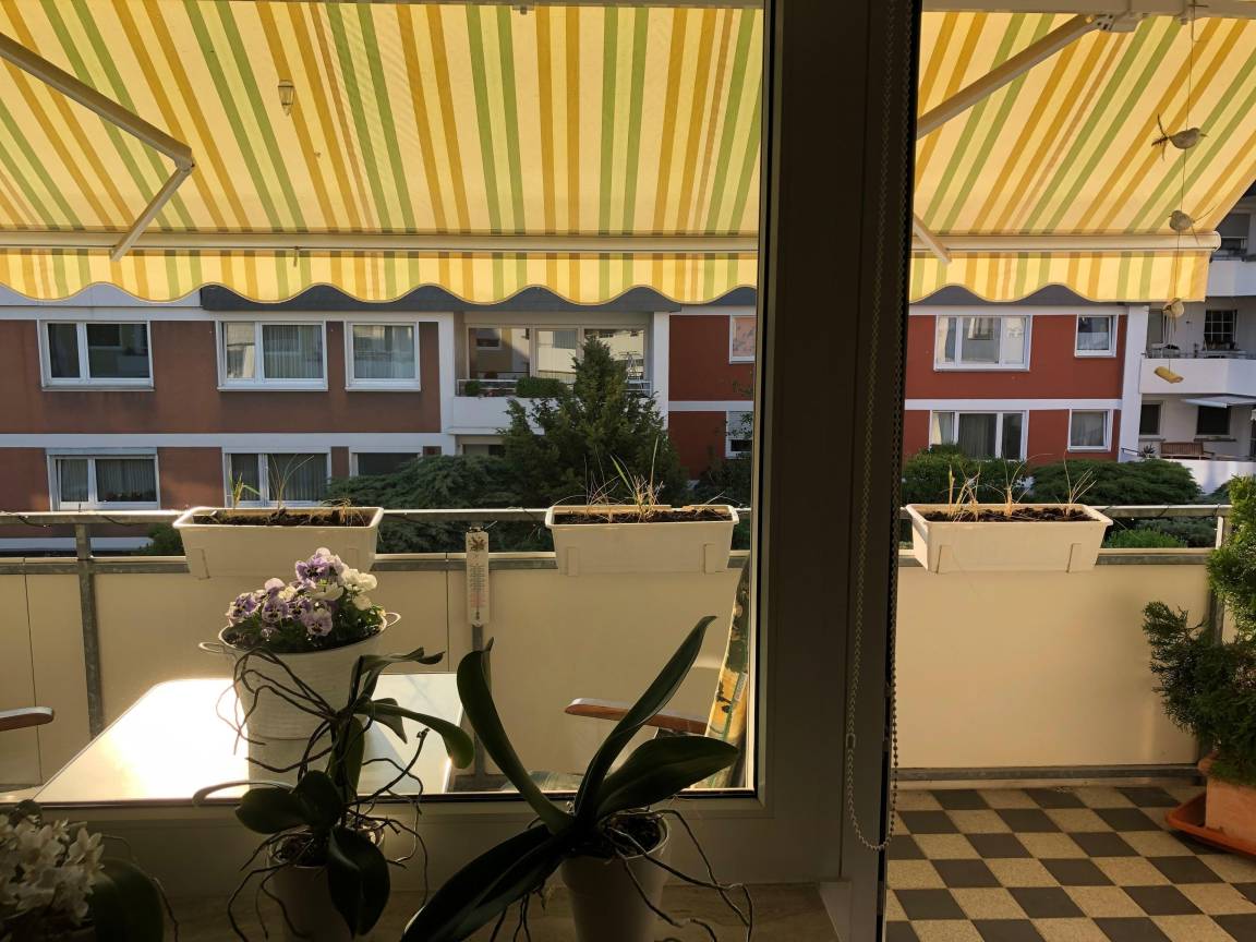 Das Wohnzimmer mit Esstisch und einem Flachbildfernseher hat einen großen Balkon mit 4 Stühlen sowie Auflagen, Süd/west Ausrichtung und einer elektrischen Markise sowie elektrische Rolladen zum Verdunkeln.
