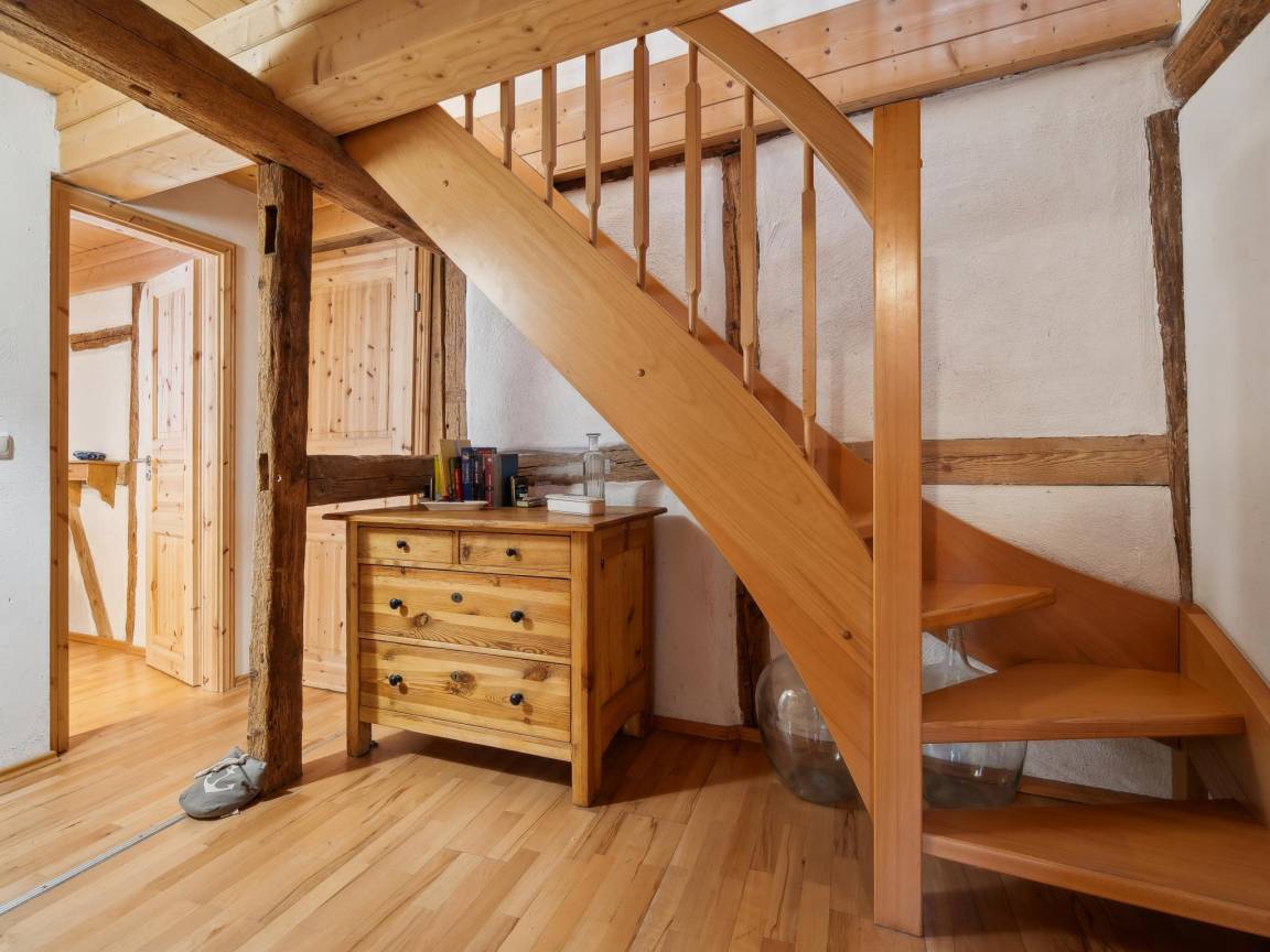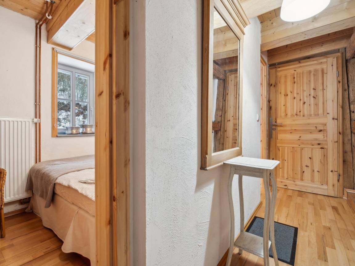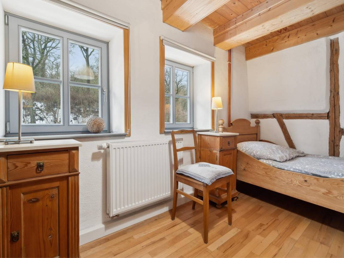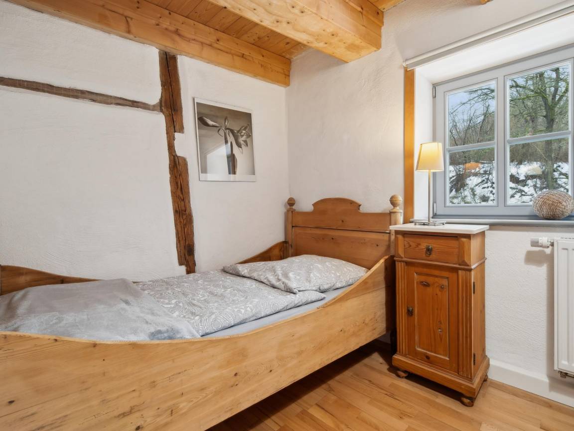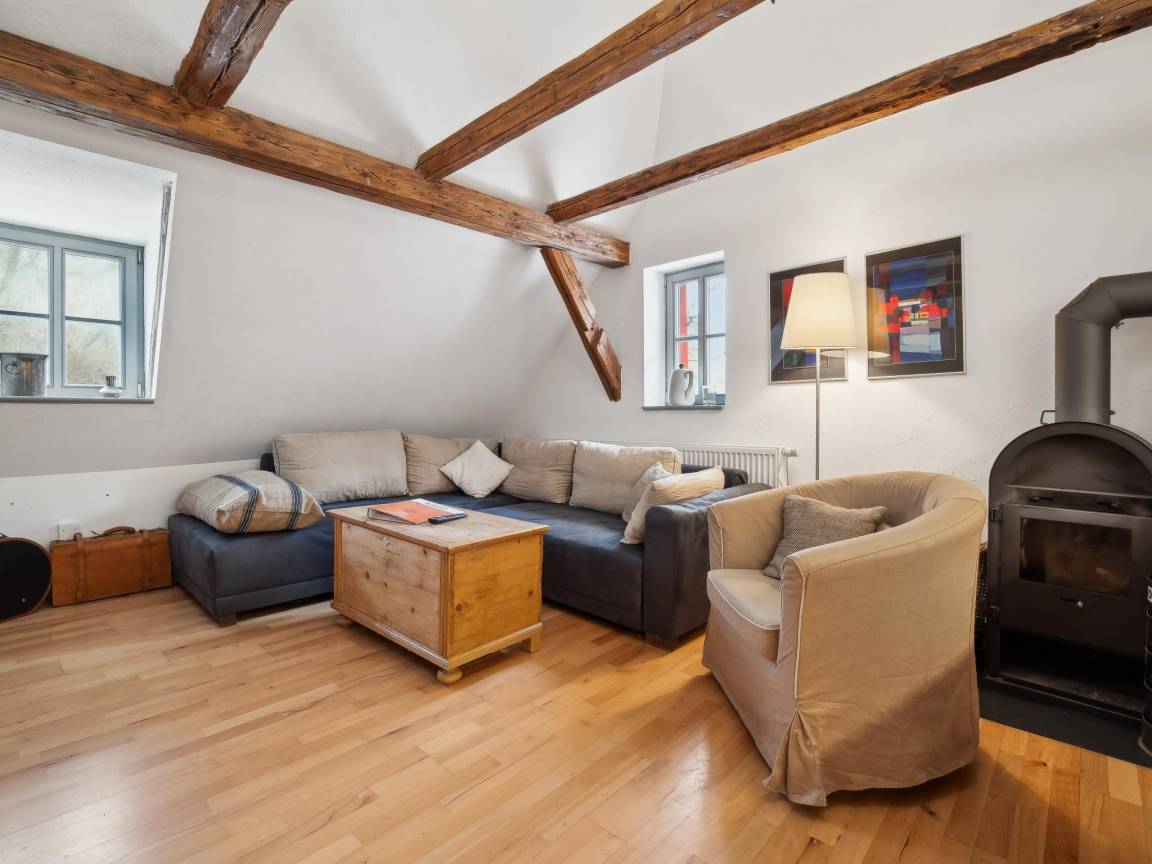 Hausbeschreibung : Im Obergeschoss einer restaurierten Wassermühle liegt diese gemütliche Ferienwohnung, umgeben von Obstwiesen und direkt am plätschernden Bach. Für Erholung sorgt ein Saunahaus im Hof (Gegen gebühr für 2 Std., inkl. Obst & Getränke). Ein idyllischer Grillplatz lädt zu entspannten Stunden ein. Am Wochenende verwöhnt das Hofcafé mit hausgemachtem Kuchen und Kaffeespezialitäten – ideal für eine genussvolle Auszeit in ländlicher Idylle