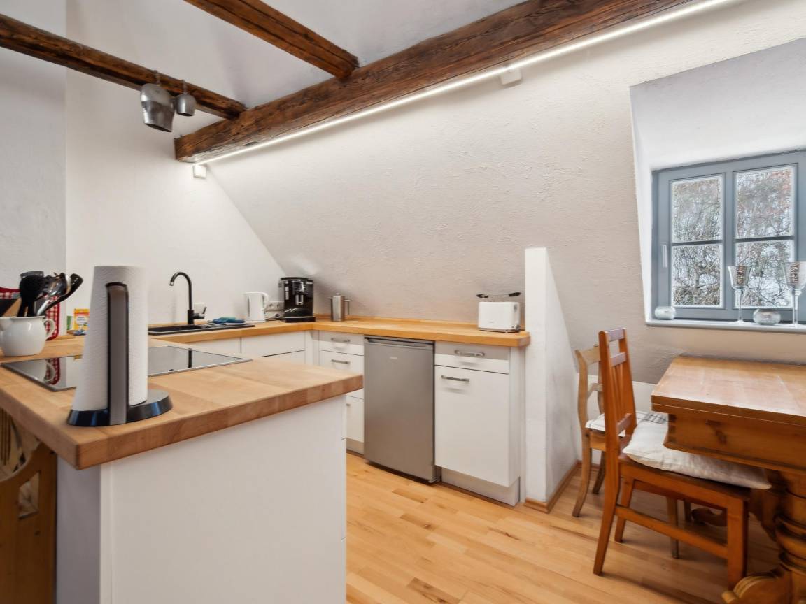 In der 2. Etage: offene Küche mit Wasserkocher, Toaster, Kochherd(4 Kochplatten, Ceranfeld), Kaffeemaschine(Vollautomat), Backofen, Mikrowelle, Geschirrspüler, Kühlschrank(+ Gefrierfach), Zitruspresse, Mixer, Stabmixer , Wohn/Esszimmer mit TV(Flatscreen, Satellit), Esstisch, Ofen(Holz), Sitzecke, Fliegengitter