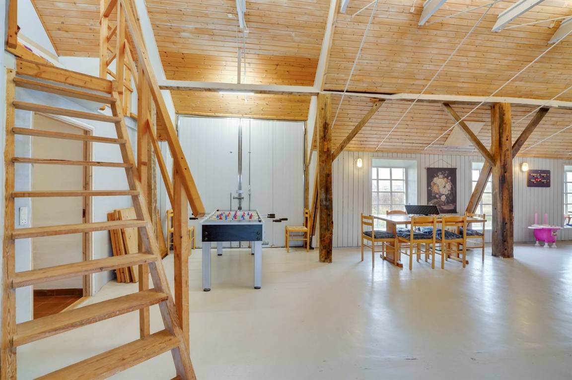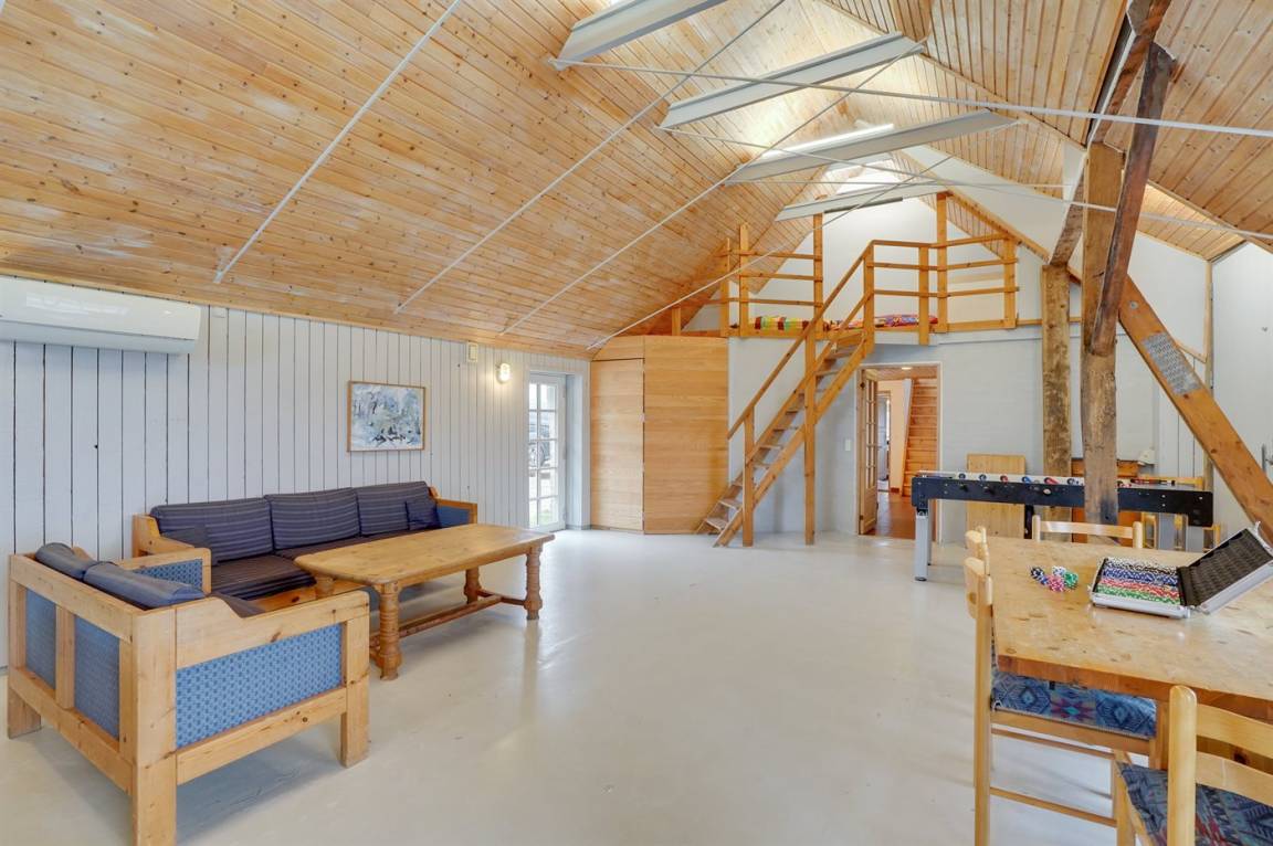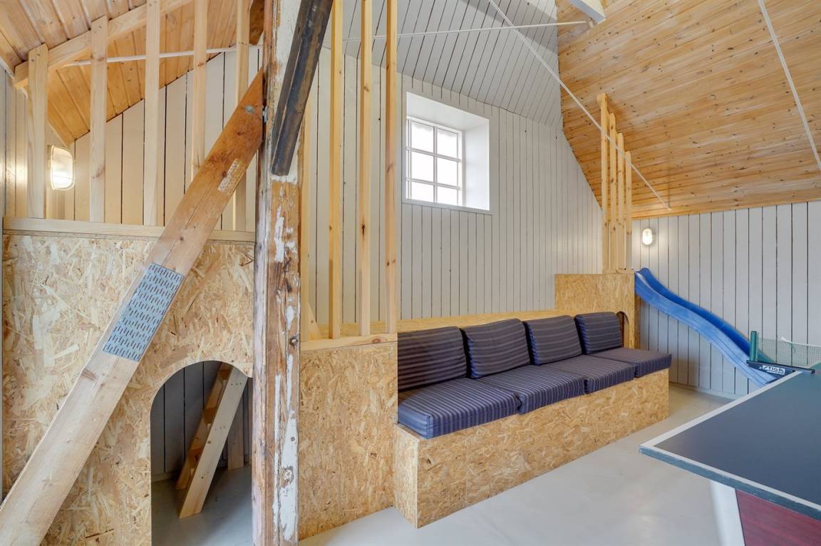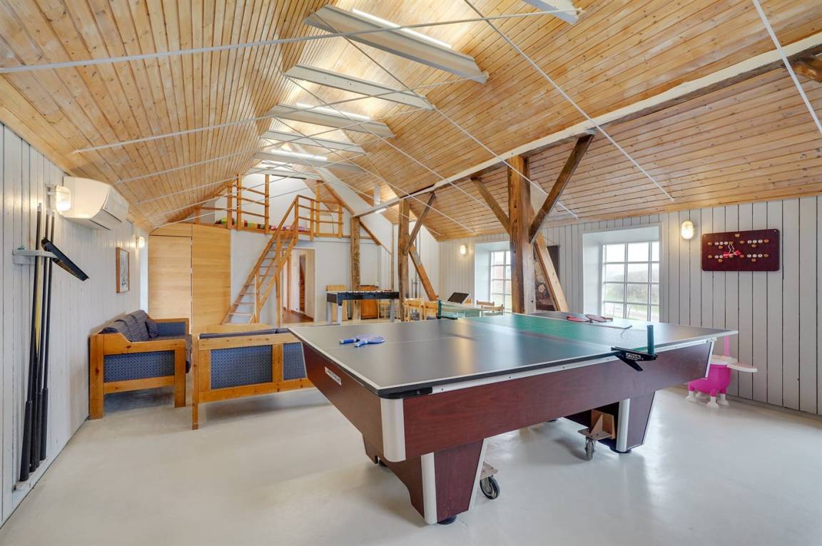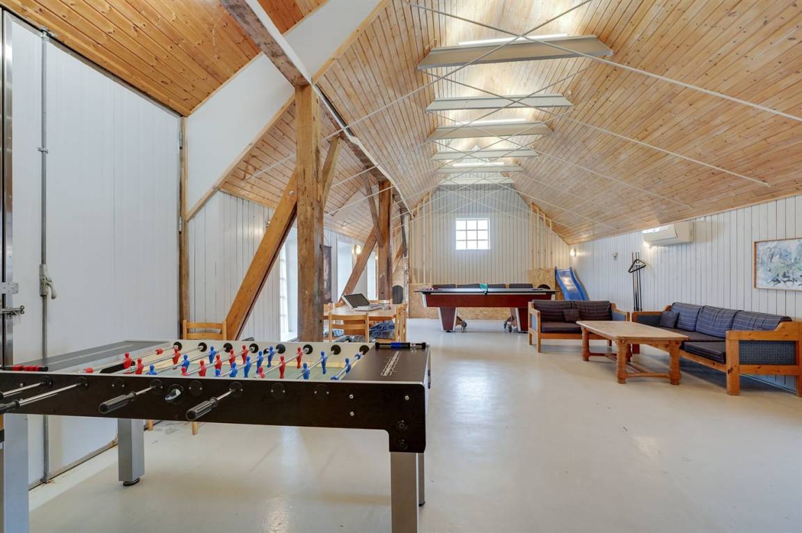 Das Aktivitätshaus bietet einen rund 70 m² großen Raum mit Billardtisch, Tischtennisplatte, Tischfußball, Sofas und Sitzbänken an. An der Stirnwand befindet sich ein Spielturm, in dem Kinder klettern, rutschen und verstecken spielen können. Am anderen Ende befindet sich eine Galerie, die sowohl von kleinen als auch großen Gästen genutzt werden kann – ein wunderbarer Raum für Spiel, Bewegung und gemütliches Beisammensein. Außerdem gibt es hier eine Sauna, einen Whirlpool, eine zweite Küche (u. a. mit Spülmaschine Nr. 2) und ein Badezimmer.