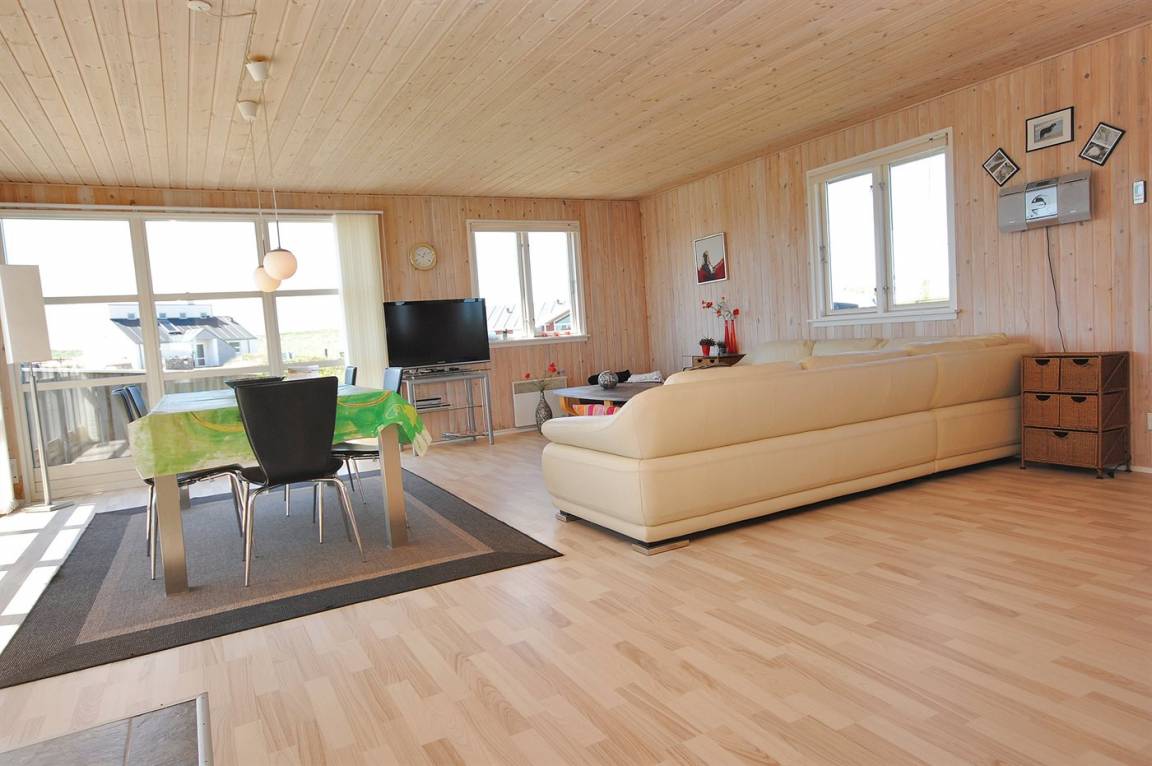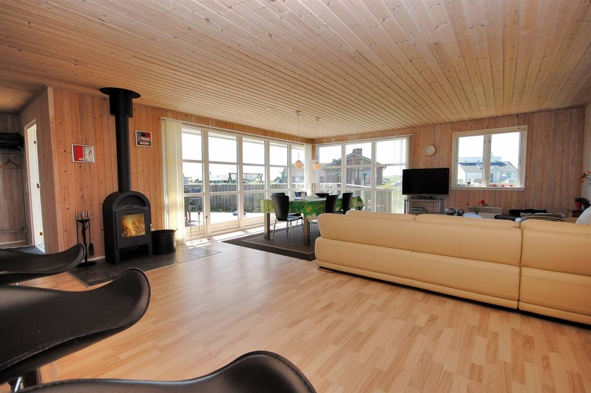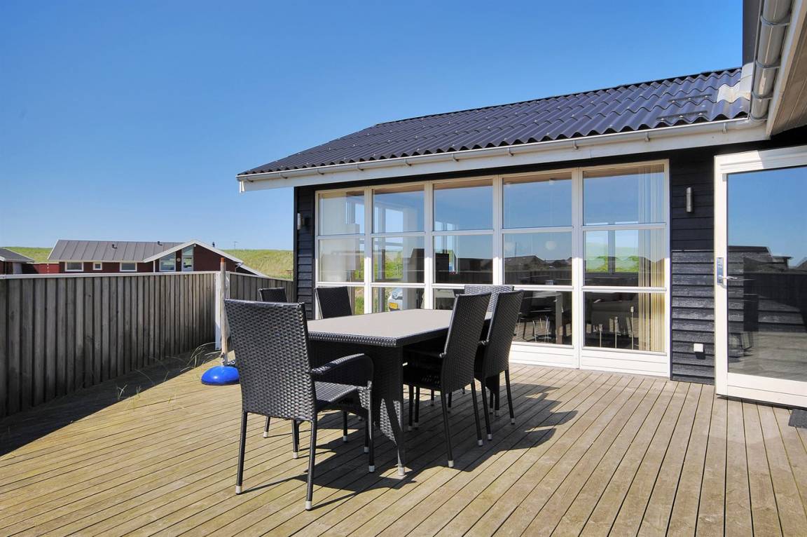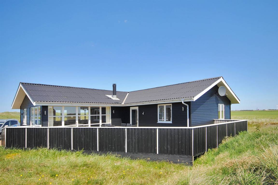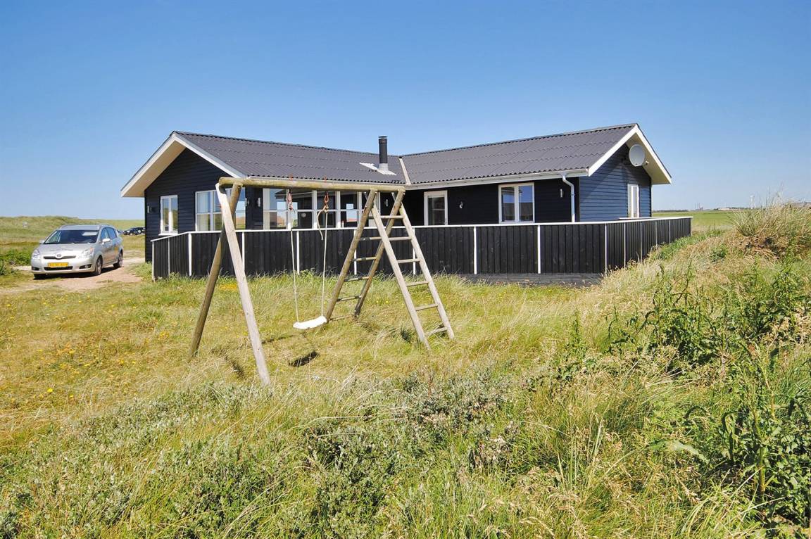Besonders schönes, großes Ferienhaus aus Holz, 2006 gebaut, auf einem schönen Eck-/Dünengrundstück nur ca. 100 m von der schönen Nordsee mit ihren vielen rekreativen Möglichkeiten gelegen. Schöne, große, nach Süden gerichtete Terrasse mit gutem Windschutz und guten Gartenmöbeln für die Erwachsene sowie Schaukel und Sandkiste für die Kinder. Innen gibt es Böden, Wände und Decken aus hellem Holz. Das schöne Badezimmer ist mit schönem 2-Pers.-Whirlpool, Duschnische, Fußbodenheizung und Sauna eingerichtet. Sehr großes Wohnzimmer mit netten Möblen, TV mit digitalem Satellitenanschluss, DVD-Spieler, CD-Spieler sowie Kaminofen und Zugang zur Terrasse. Die große Küche ist in offener Verbindung mit dem Wohnzimmer und enthält alle moderne Geräte, u. a. Tiefkühlgerät, Warmluftofen, Mikrowelle, Geschirrspüler und Herd mit Ceran-Feld. 3 gute, große Schlafzimmer mit Doppelbett. An weiterer Ausstattung kann kostenlose, kabellose Internetverbindung erwähnt werden (eigener Computer muss mitgebracht werden) und es ist eine energiesparende Wärmepumpe installiert. Für die kleinen Feriengäste stehen Kinderbett und Kinderhochstuhl zur Verfügung.Das Haus liegt in einem schönen Ferienhausgebiet mit vielen Aktivitätsmöglichkeiten. In diesem Haus können Sie zu jeder Jahreszeit einen schönen Urlaub machen, egal ob Sie baden, angeln, surfen, Golf spielen oder bloß in der schönen Natur am Wasser wandern möchten.