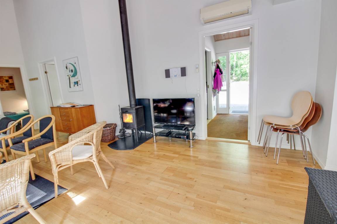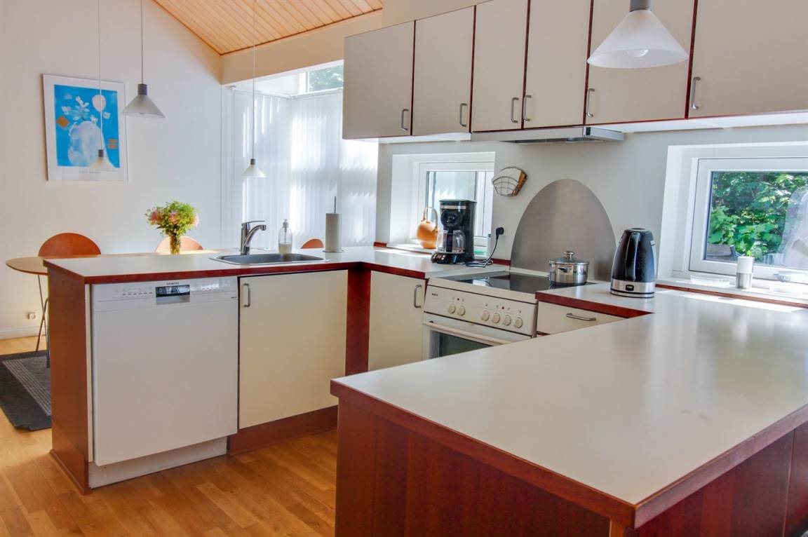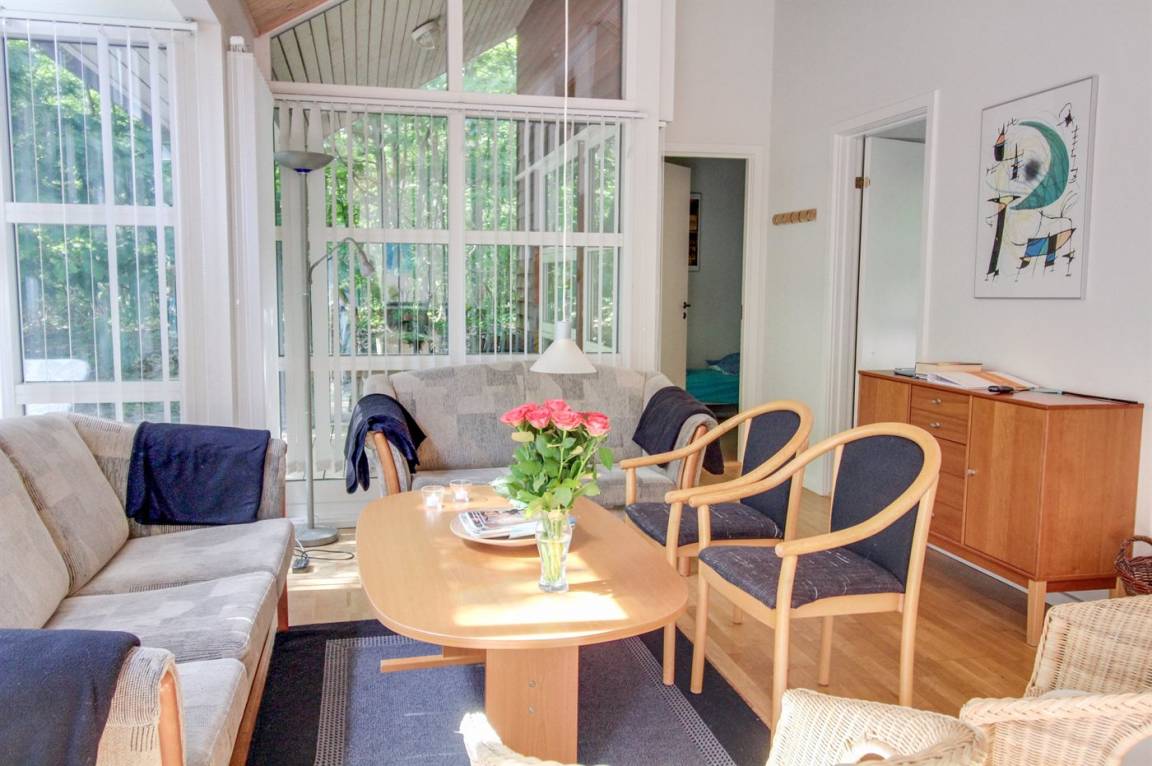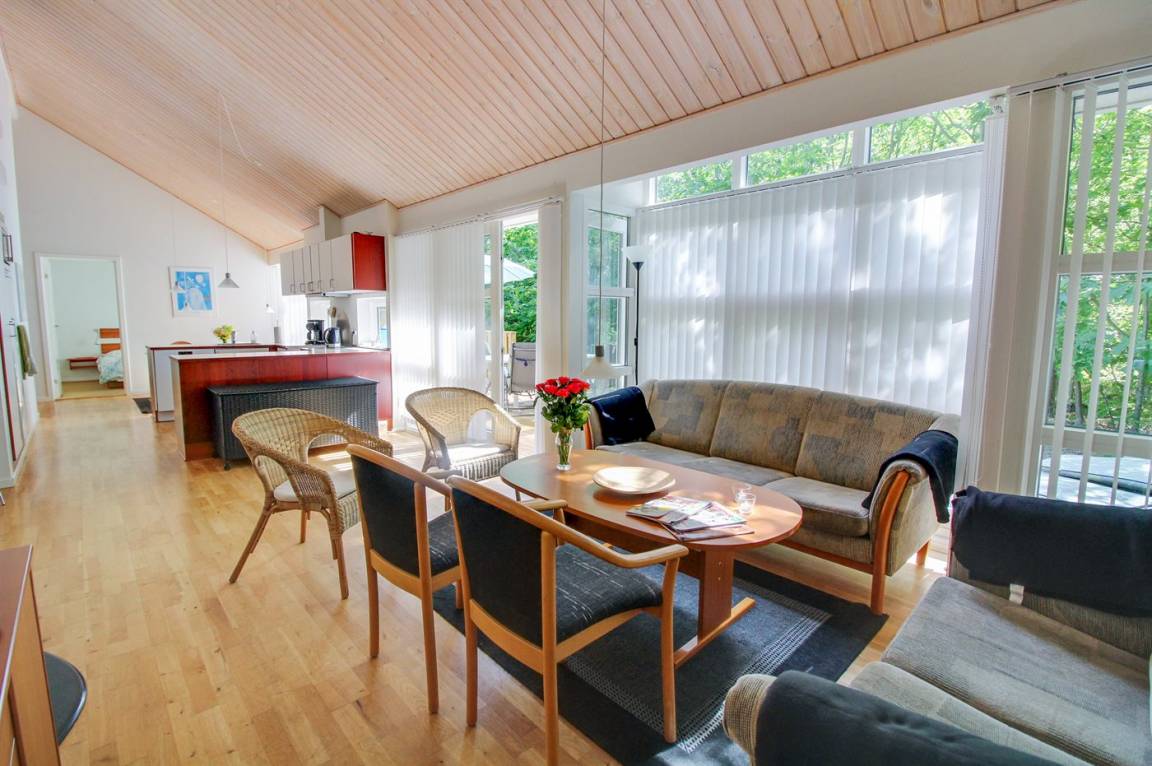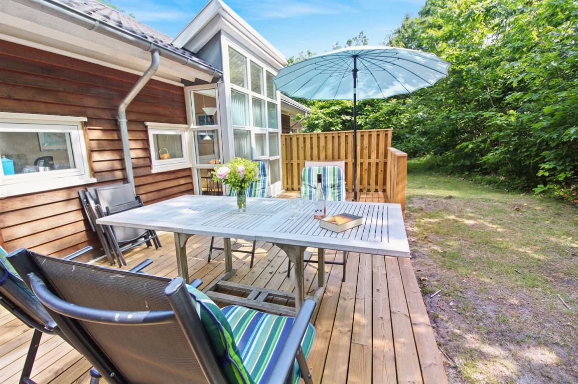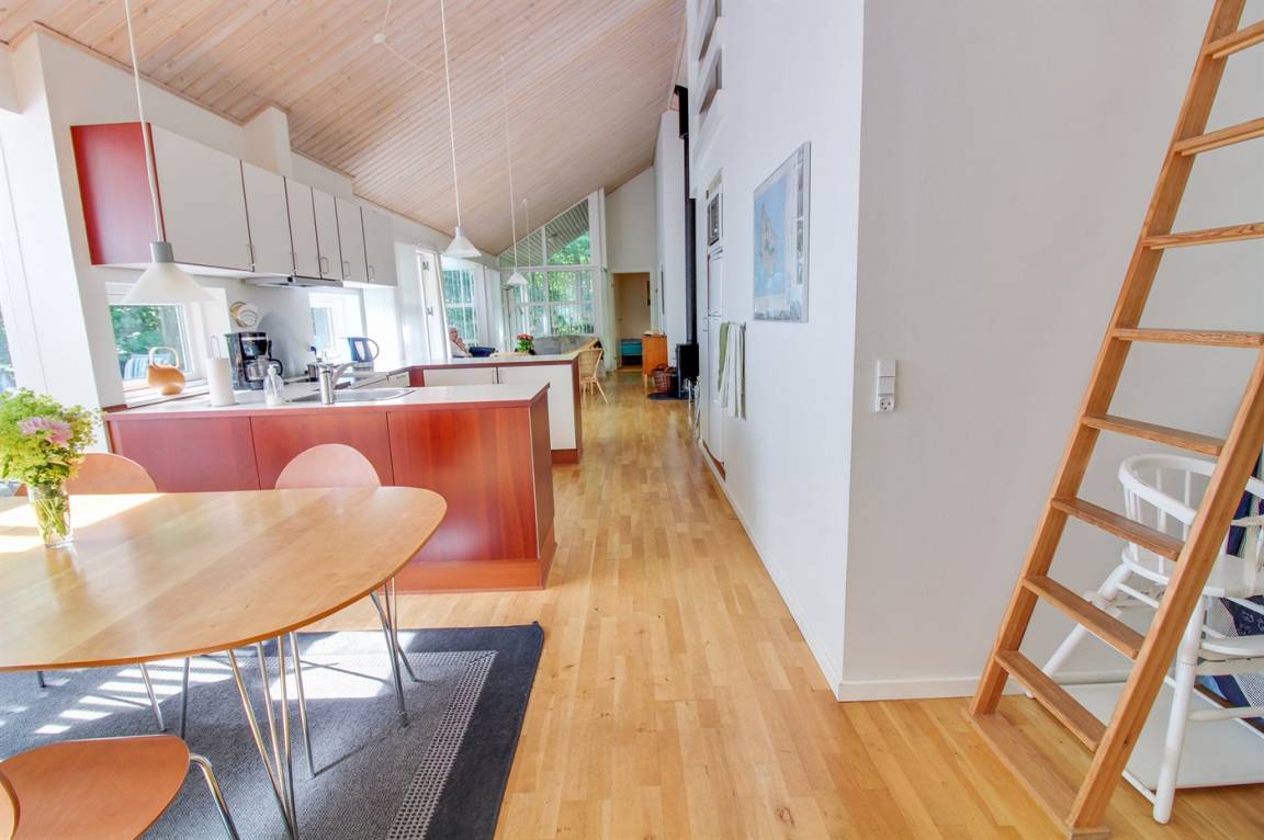 Gepflegtes, in skandinavischem Stil gebautes Ferienhaus auf einem Naturgrundstück in einem ausgebauten Ferienhausgebiet mit Waldbewachsung gelegen. Offenes Obergeschoss mit 2 Schlafplätzen. Die Wärmepumpe dient auch als Aircondition. Es gibt 2 Kühlschränke mit Gefrierfach sowie eine Mikrowelle mit Umluft. Ein kleiner Geräteraum steht für Angelgeräte oder ein paar Fahrräder zur Verfügung. Ein schönes Ferienhaus, das für 2 Familien geeignet ist. 600 m zum Hasle Strand mit weißem Sand. Ein Gebiet mit guten Aktivitätsmöglichkeiten - sehen Sie auch: www.hasle.dk.