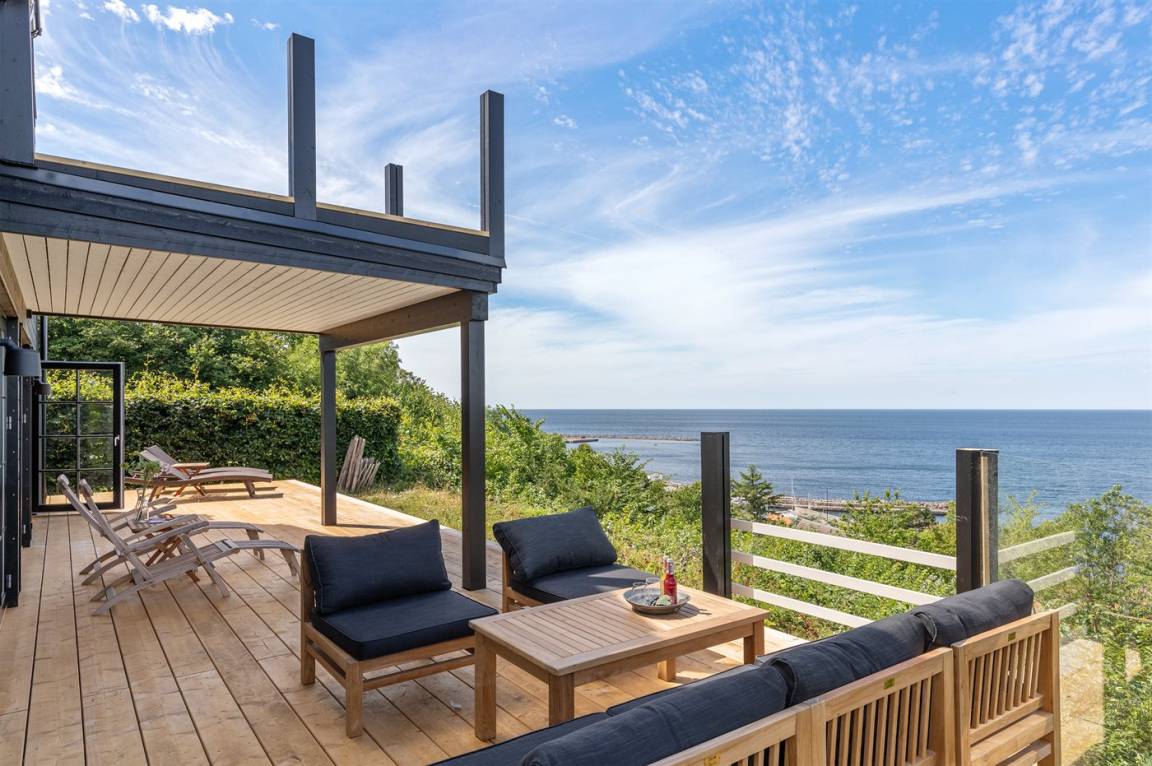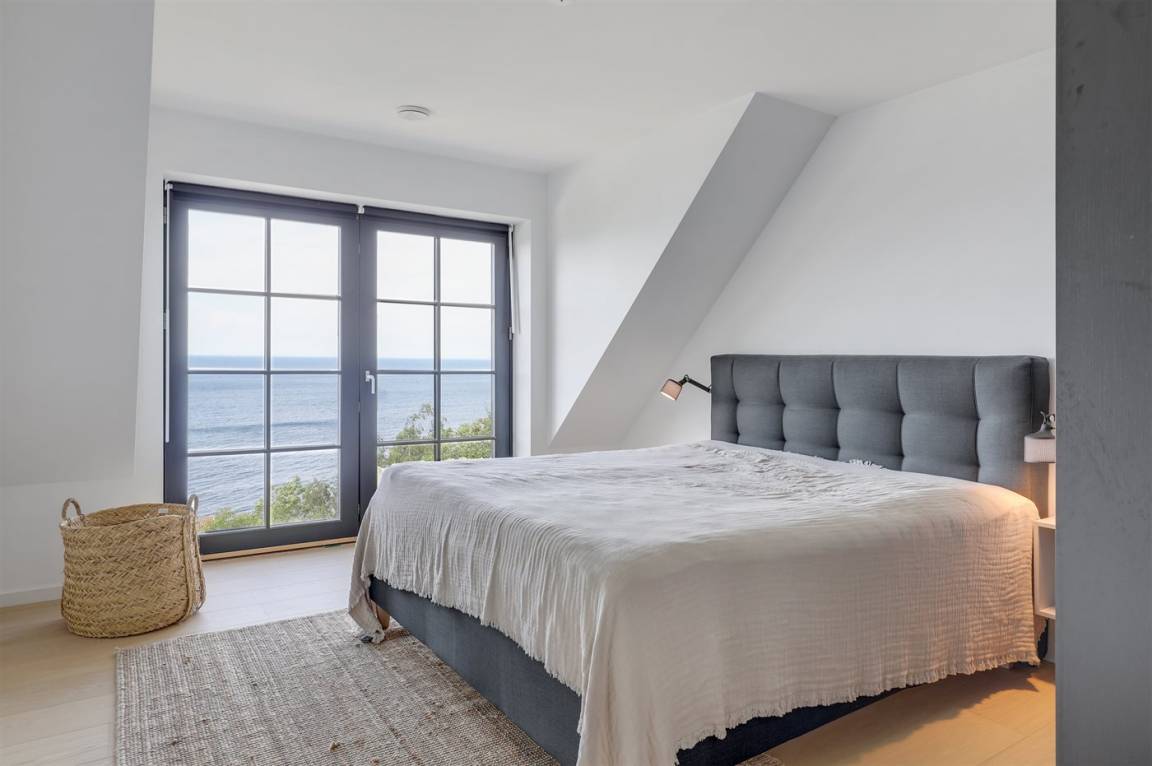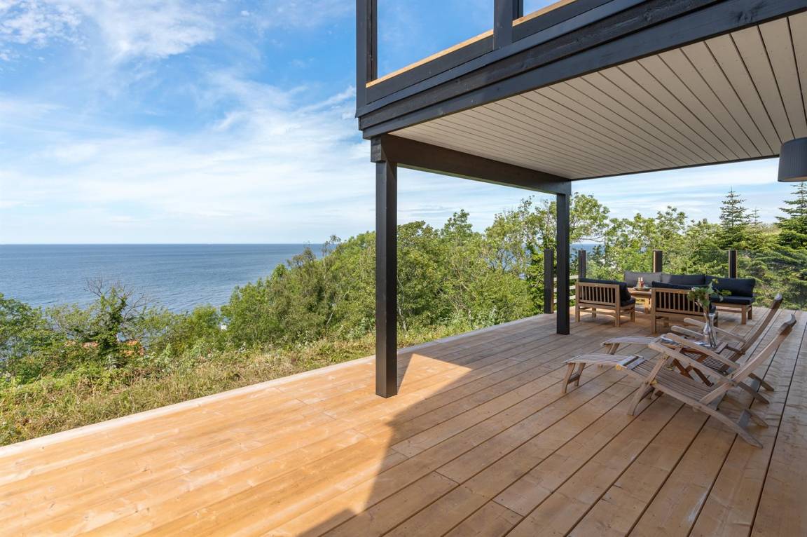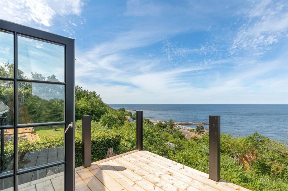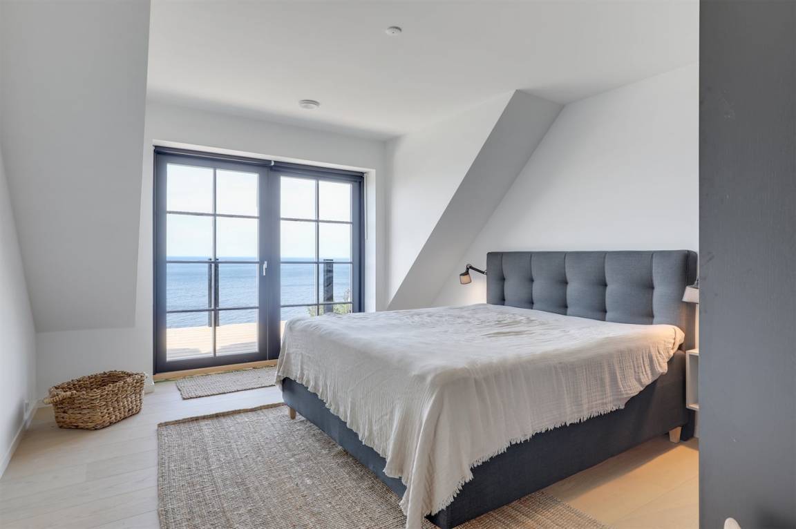 Hervorragend gelegenes Ferienhaus mit großartiger Aussicht auf das Meer. Sowohl aus dem Wohnzimmer als auch aus der Mansarde des Hauses hat man einen einzigartigen Blick auf das Meer. Hügeliges Grundstück. Das Haus liegt über dem kleinen Fischerdorf Vang, das auch für die vielen Steinmetze berühmt ist, die früher dort lebten. Das Naturgebiet Ringebakkerne bietet eine großartige Natur, in der zahlreiche Tierarten zuhause sind, und eine fantastische Aussicht über die Felsen, ihre steilen Wände und das Meer.