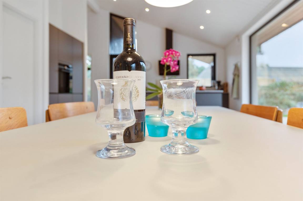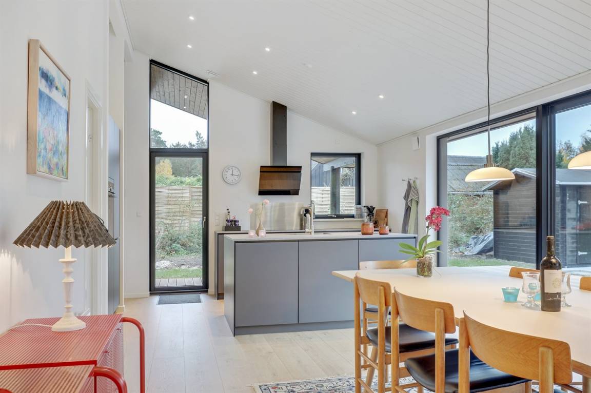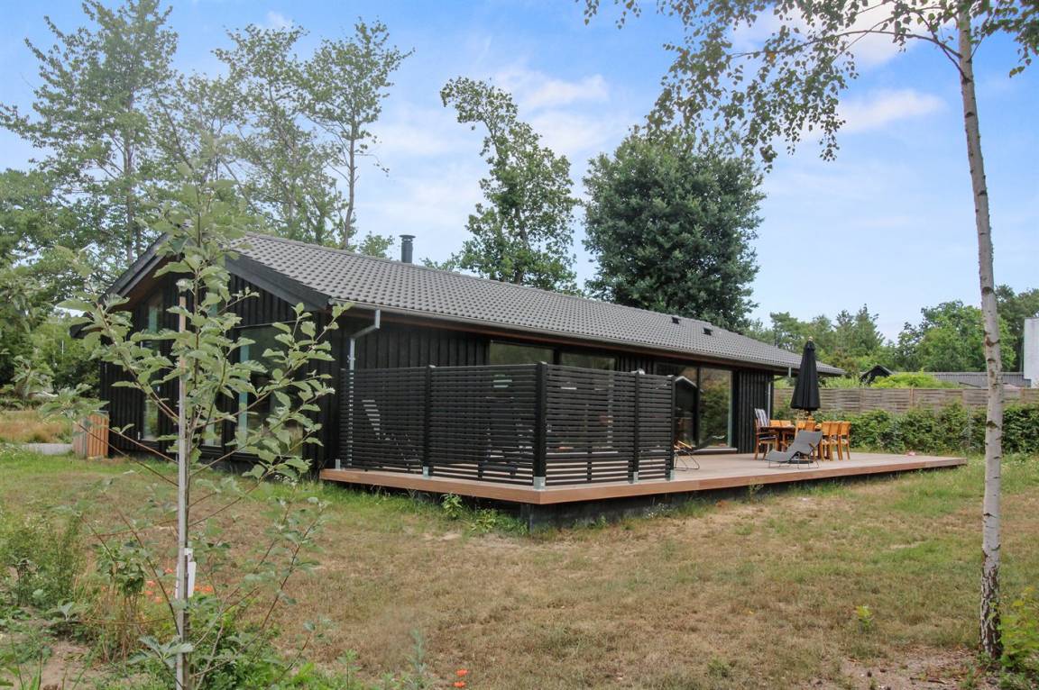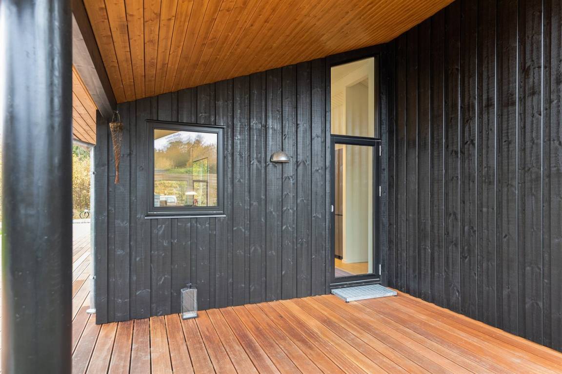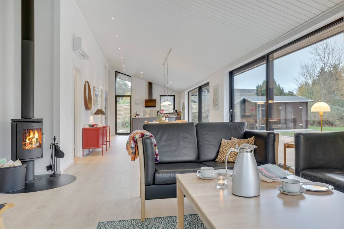 Ein gut eingerichtetes und geräumiges Ferienhaus mit großen Panoramafenstern im Wohnzimmer, die für einen großzügigen Lichteinfall sorgen. Ein Haus, in dem bei der Innenausstattung das Zusammenspiel der kleinen Details berücksichtigt wurde, welches zu einer ruhigen und ausgeglichenen Atmosphäre beiträgt. Es gibt eine große Terrasse aus hochwertigem Holz, die zu Stunden im Freien einlädt. Von der Terrasse aus können Sie auf das Grundstück blicken, das von Bäumen umgeben ist, die so beschnitten sind, dass sie Schutz bieten und gleichzeitig das Licht hereinlassen.