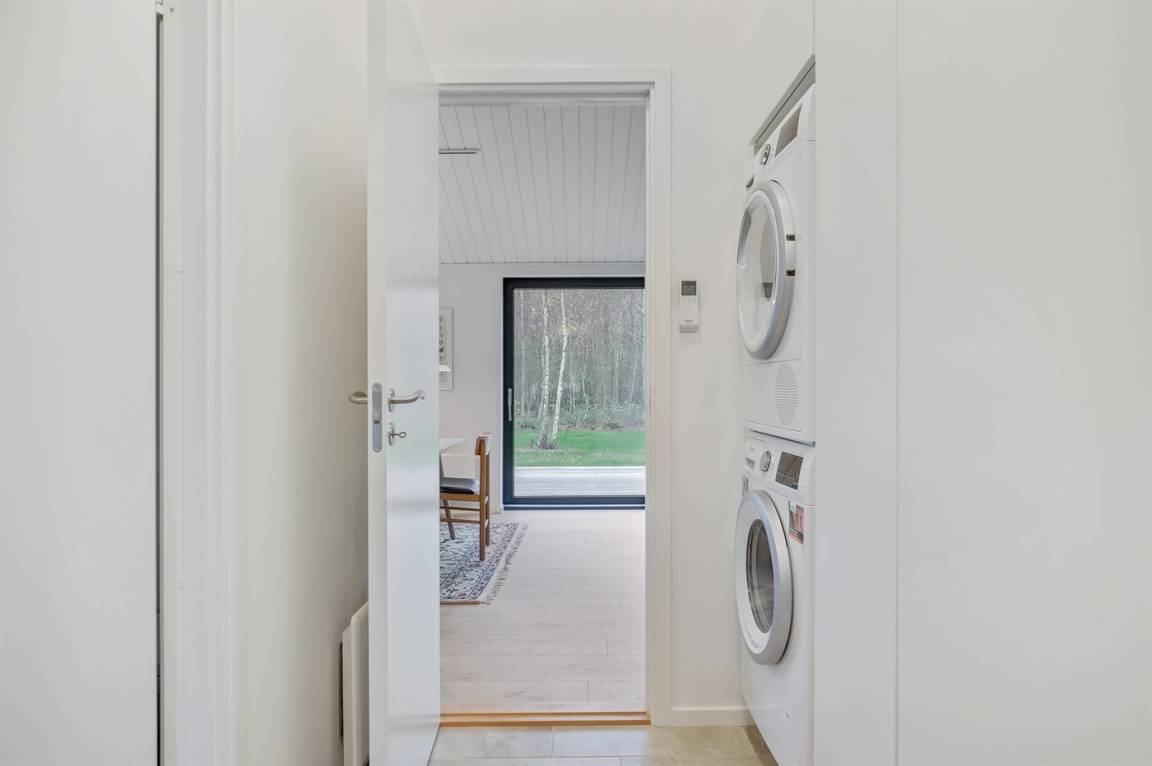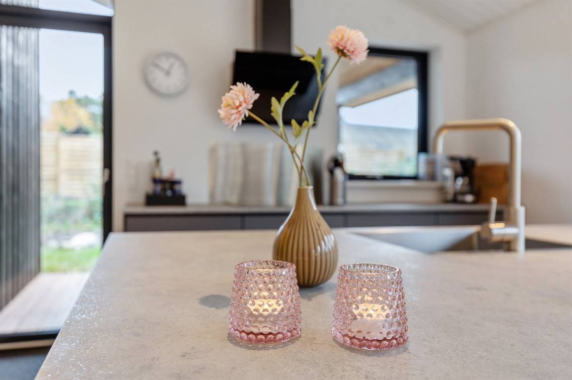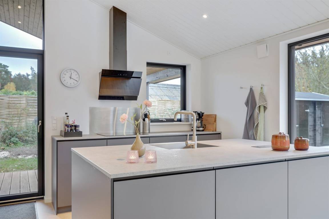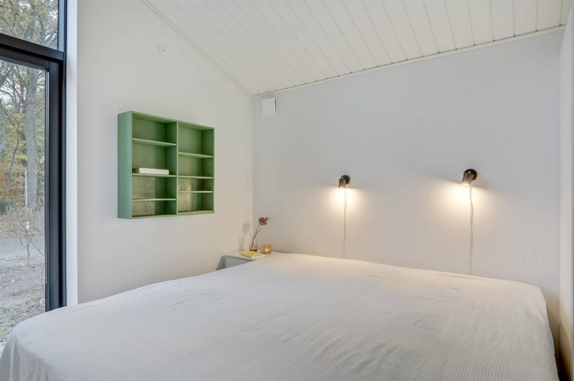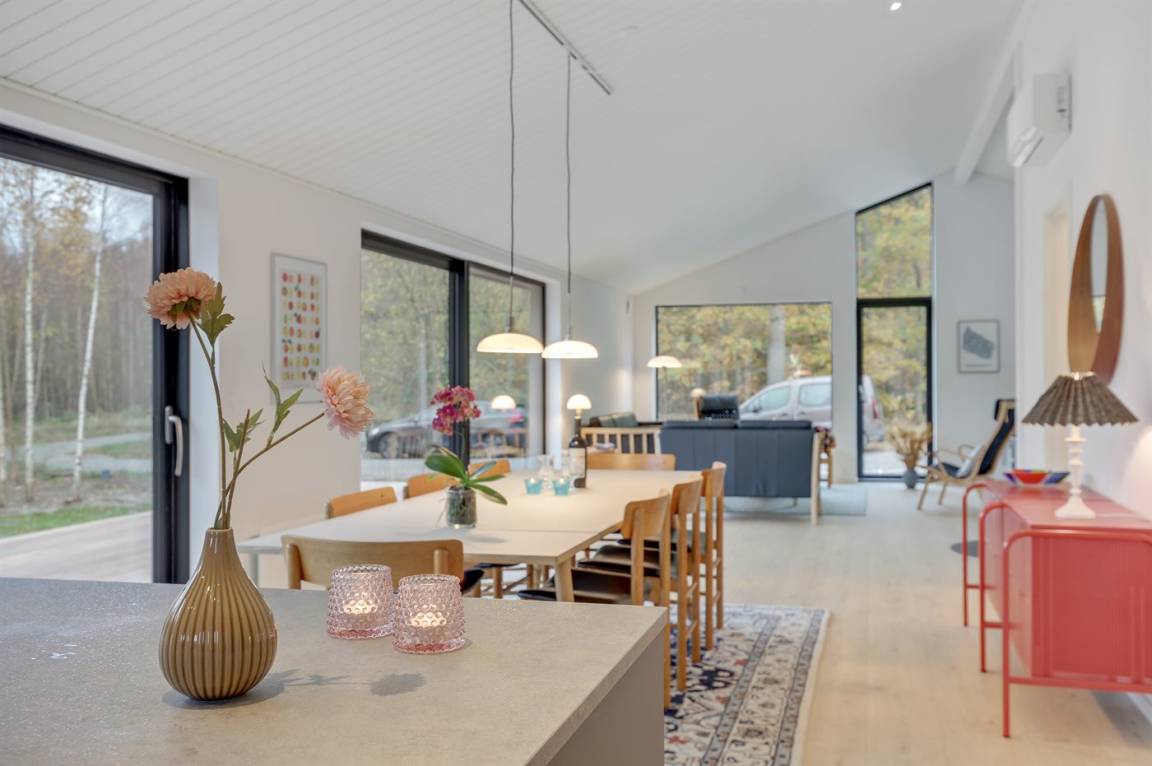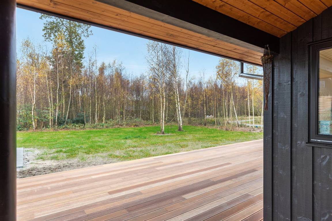 Ein gut eingerichtetes und geräumiges Ferienhaus mit großen Panoramafenstern im Wohnzimmer, die für einen großzügigen Lichteinfall sorgen. Ein Haus, in dem bei der Innenausstattung das Zusammenspiel der kleinen Details berücksichtigt wurde, welches zu einer ruhigen und ausgeglichenen Atmosphäre beiträgt. Es gibt eine große Terrasse aus hochwertigem Holz, die zu Stunden im Freien einlädt. Von der Terrasse aus können Sie auf das Grundstück blicken, das von Bäumen umgeben ist, die so beschnitten sind, dass sie Schutz bieten und gleichzeitig das Licht hereinlassen.
