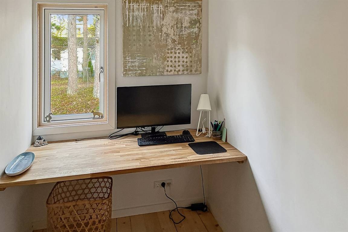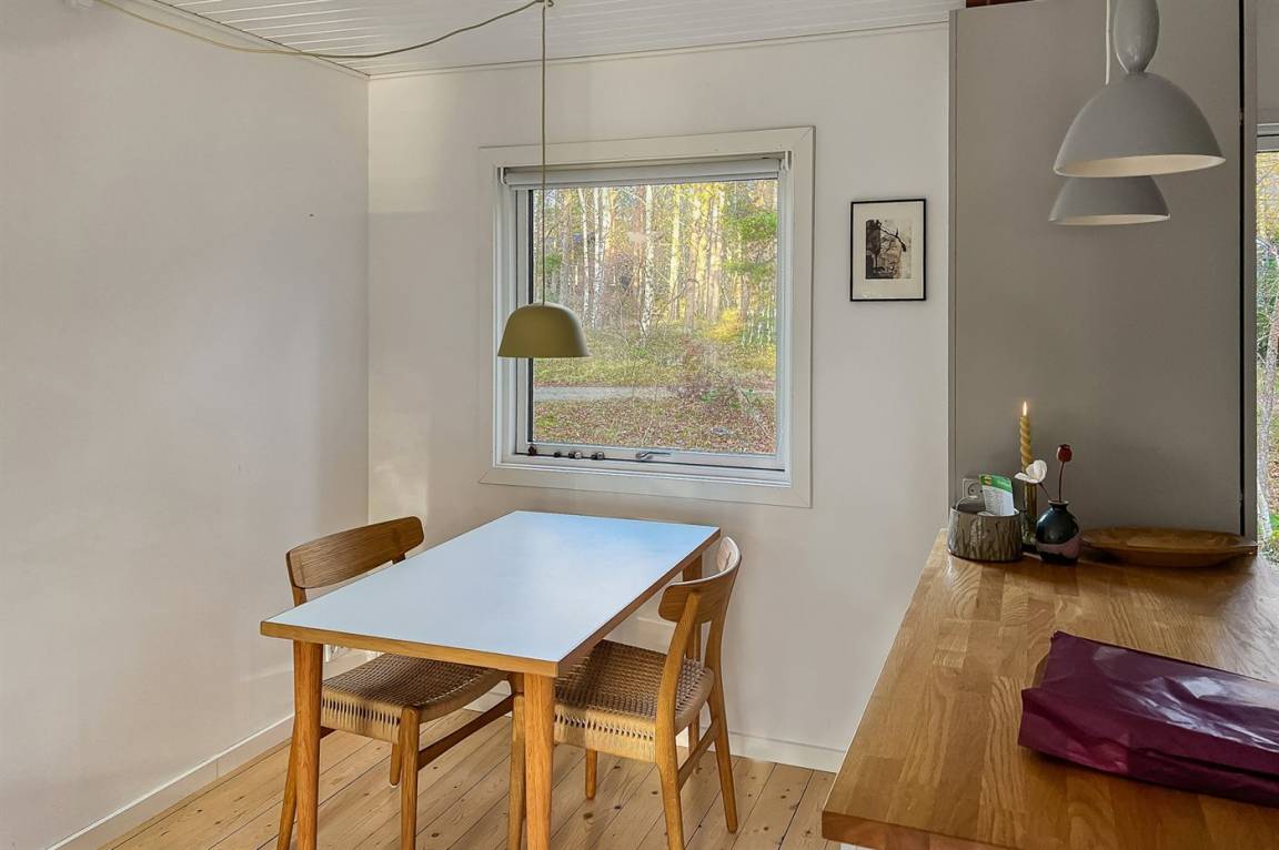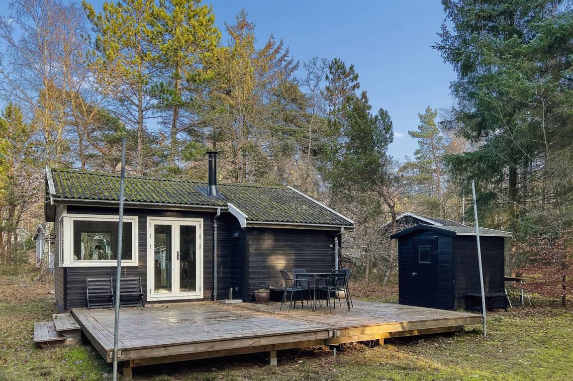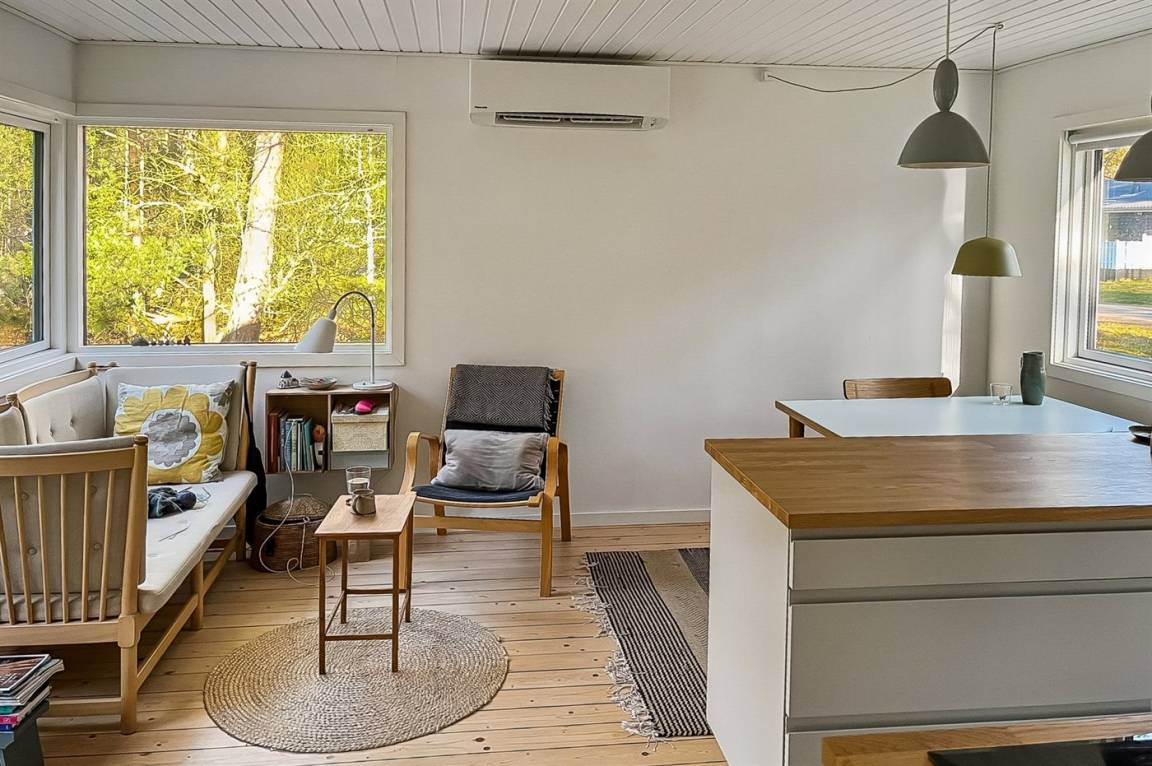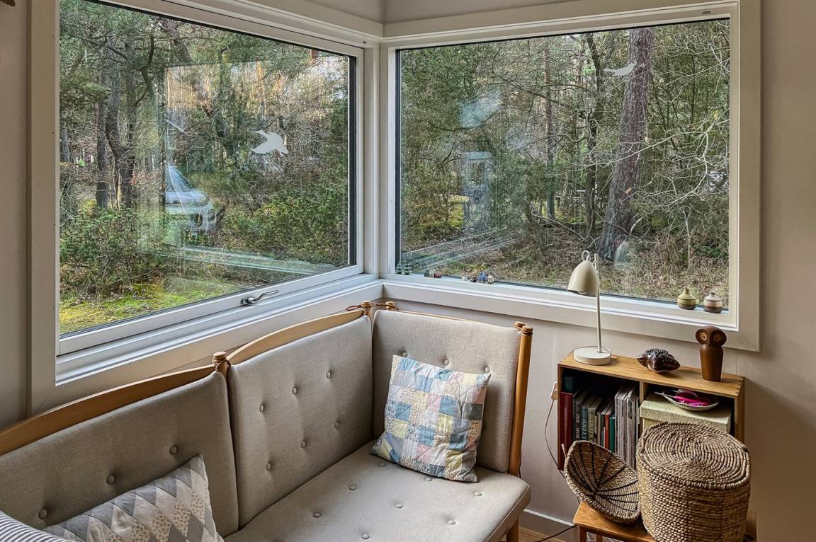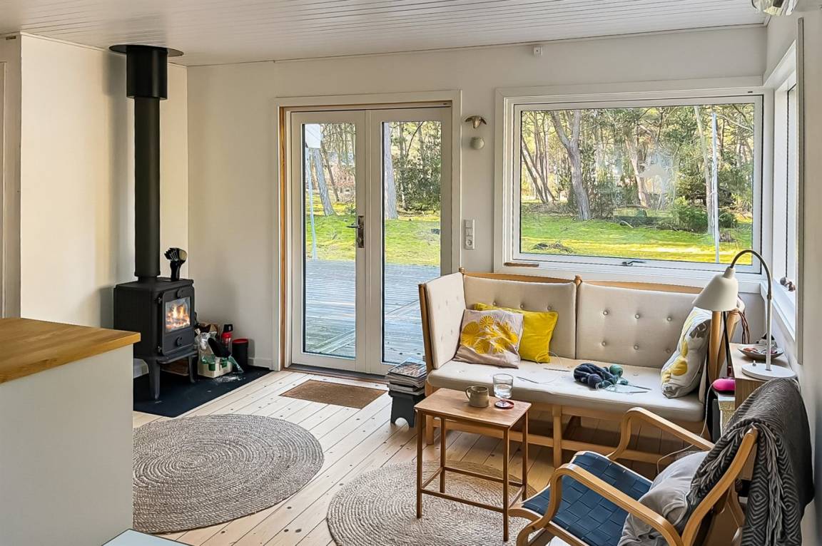 Sowohl vom Wohnbereich als auch von der Holzterrasse aus hast zwischen den Bäumen Blick auf das Meer, und der Sandstrand liegt nur wenige Minuten zu Fuß vom Haus entfernt. Ein reiches Tierleben mit Hasen, Rehen und Eichhörnchen gehört ganz natürlich zum Aufenthalt dazu.