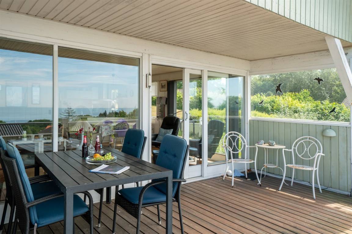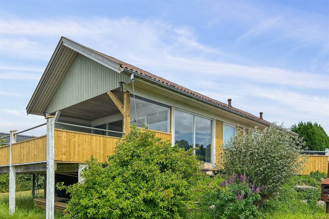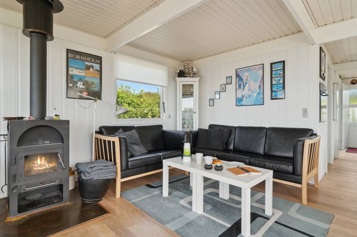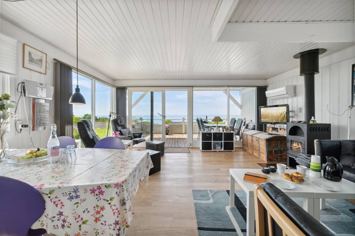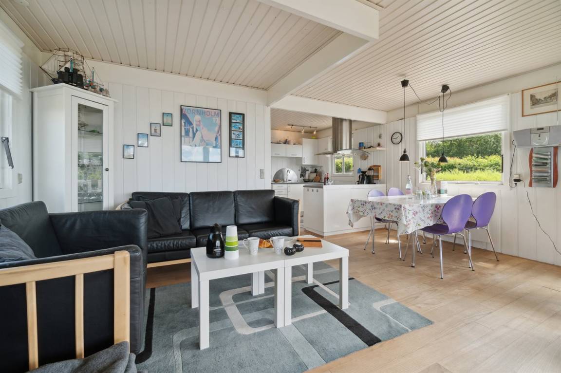Ein Ferienhaus in erhöhter Lage und mit fantastischem Blick auf die Ostsee und das schöne Gebiet. Das Haus ist schön, in hellen und einladenden Farben eingerichtet. Durch die Lage im Feriengebiet Vang kann man mit etwas Glück den Sonnenuntergang über dem Meer erleben.
