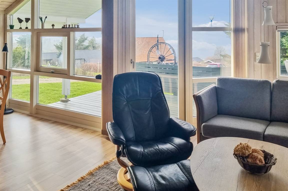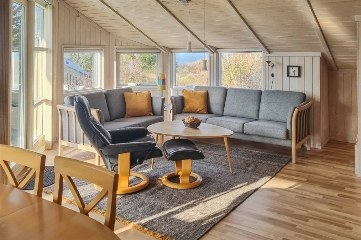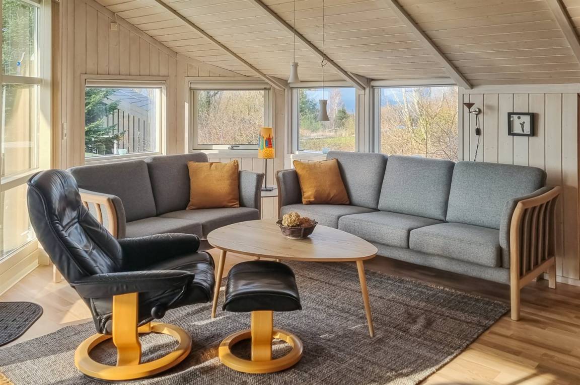 Im Jahr 2025 sind schöne Holzböden im gemütlichen und gut möblierten Wohnzimmer verlegt. Das Ferienhaus wirkt äußerst gepflegt.