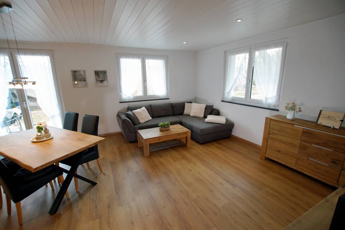 Gemütlicher Wohn- und Essbereich mit Schlafsofa, Esstisch und Flachbildschirm . Der Schwedenofen sorgt an kühlen Abenden für eine besonders warme und behagliche Atmosphäre. Der perfekte Ort um nach einem erlebnisreichen Tag zu Entspannen, Lesen oder Zusammensitzen.