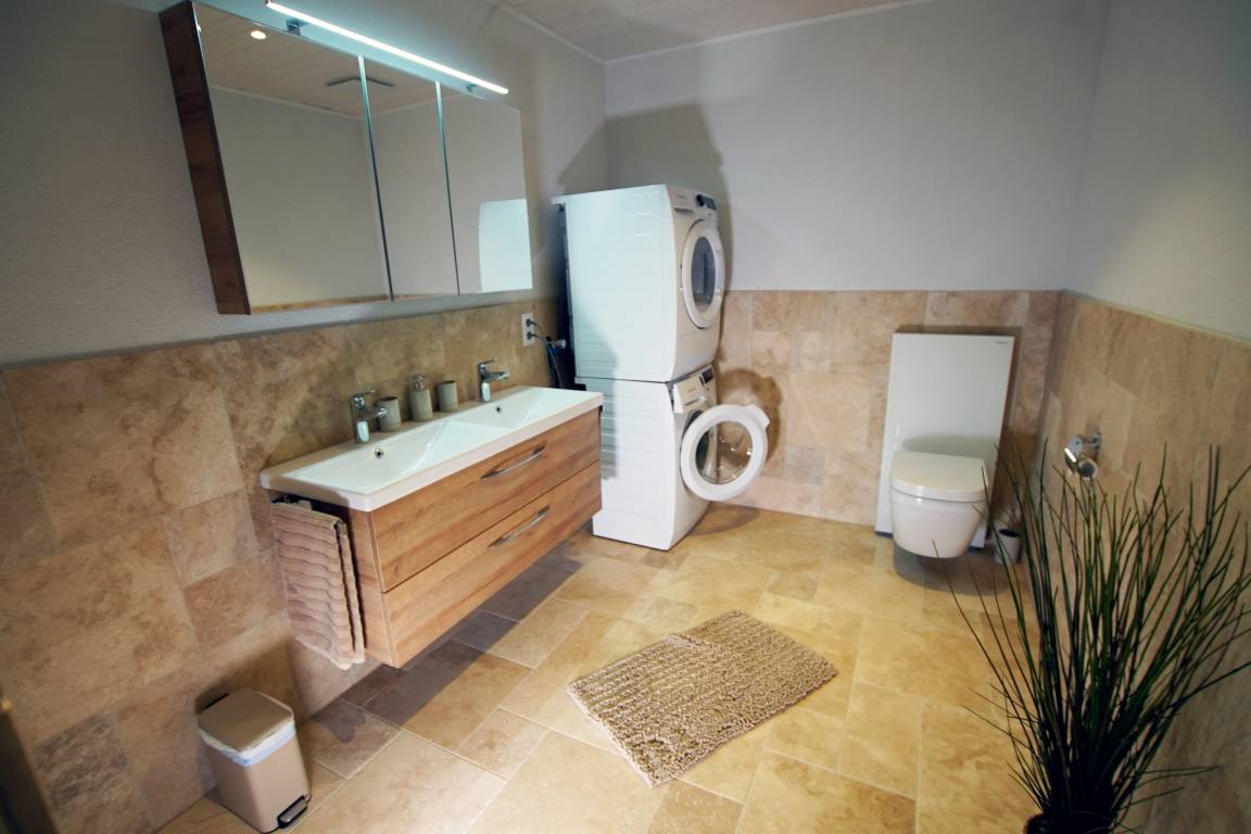 Schönes, modernes Badezimmer mit Doppellavabo, Spiegelschrank, Dusche und WC. Im Badezimmer befinden sich ein Haarföhn sowie eine eigene Waschmaschine und Trockner.
