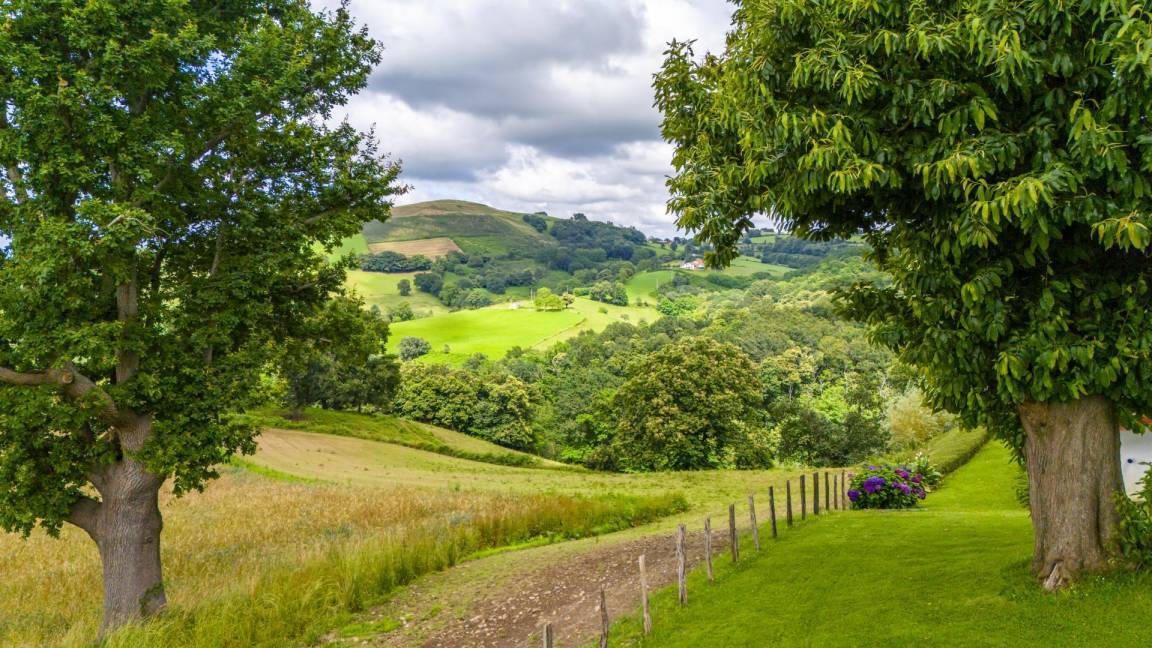 Panoramablick auf die Hügel und die baskische Landschaft. In der Nähe der baskischen Küste, der Berge, der Thermalbäder, Spaniens...