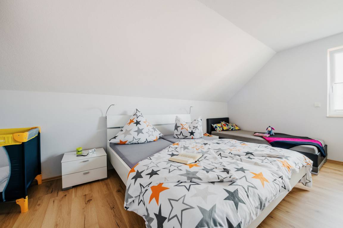 Doppelbett, zusätzliche Aufbettungsmöglichkeit, Kleiderschrank.