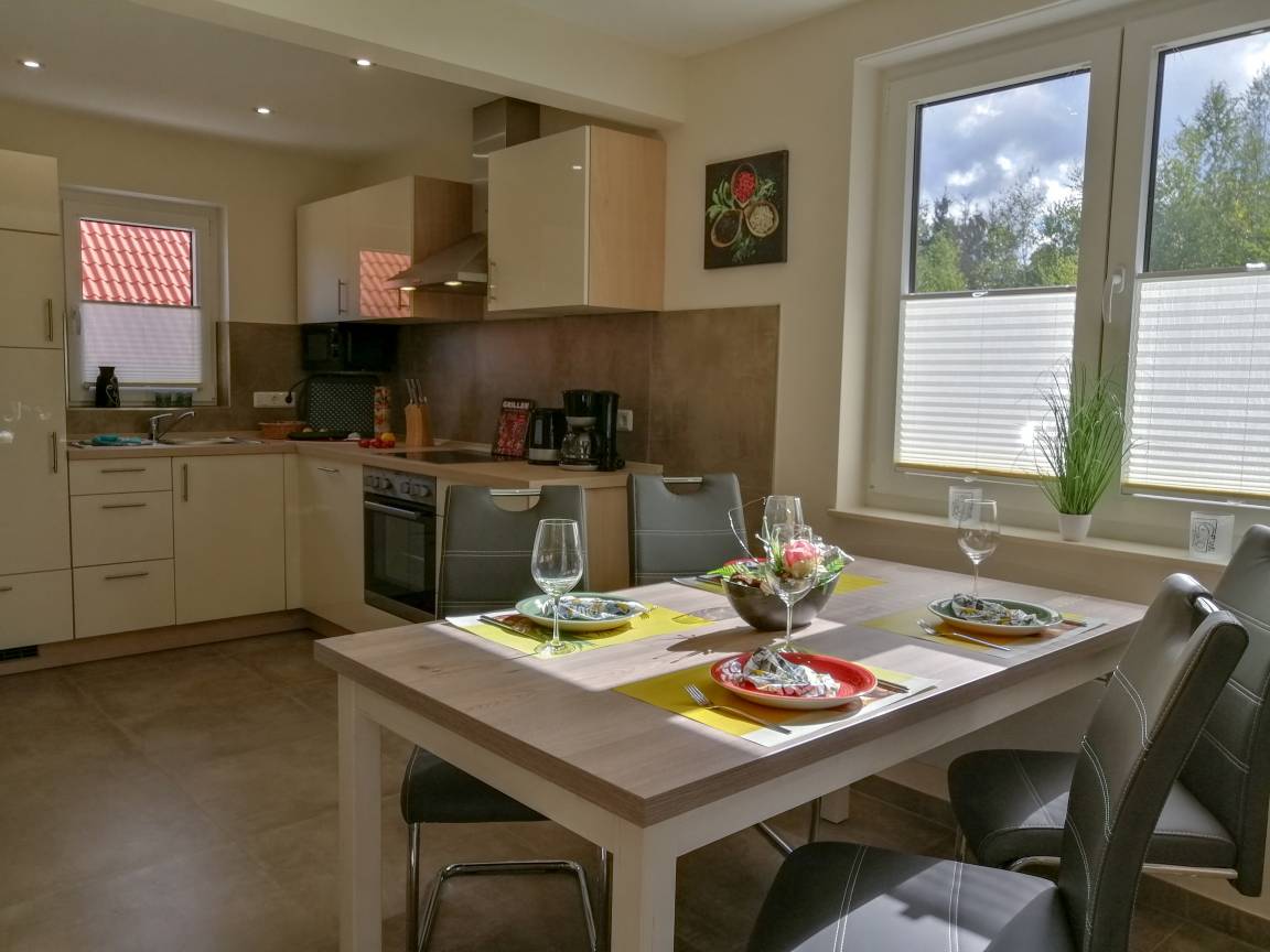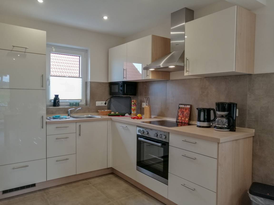 1 moderne vollausgestattete Küche mit Geschirrspüler, Mikrowelle, E-Herd (Ceran) mit Backofen, Kühl-/ Gefrierkombination, Toaster, Kaffeemaschine, Mikrowelle u.v.m.