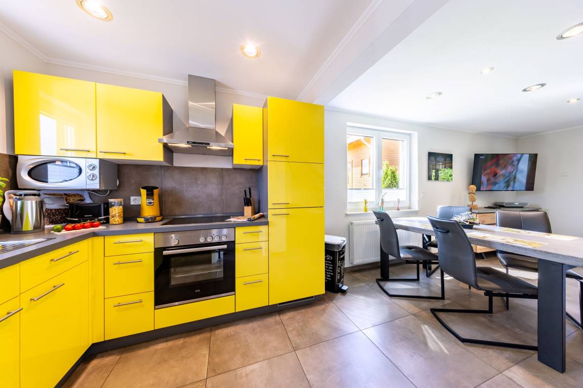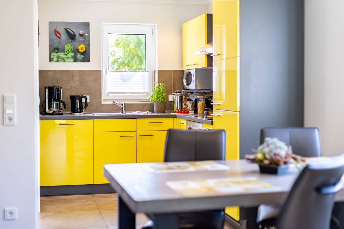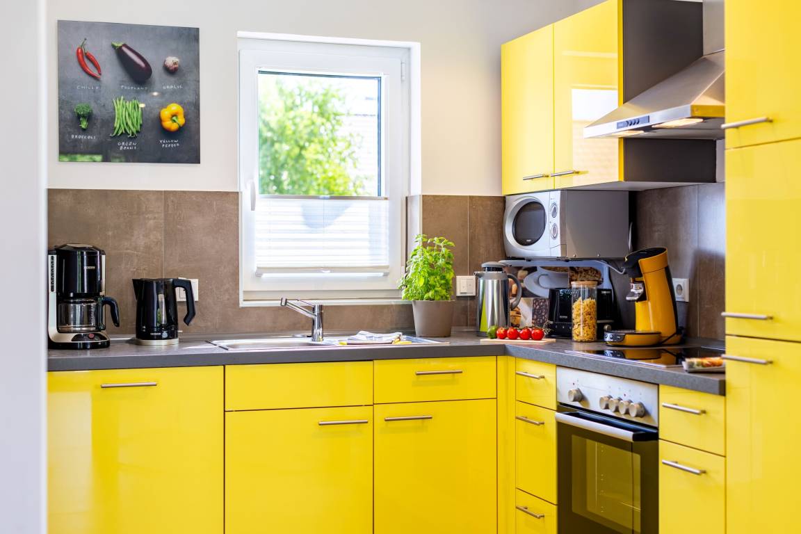 mit Geschirrspüler, Ceranherd mit Backofen, Mikrowelle, Kühl-/Gefrierkombination, Toaster, Kaffeemaschine, Padmaschine und vielem mehr.