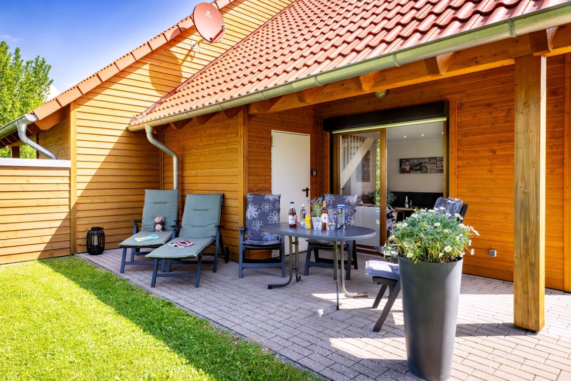 • Teilüberdachte Terrasse mit angrenzender Rasenfläche.
