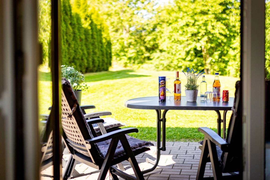 • Ruhige Terrasse mit angrenzendem Garten und Blick auf eine Pferdekoppel
