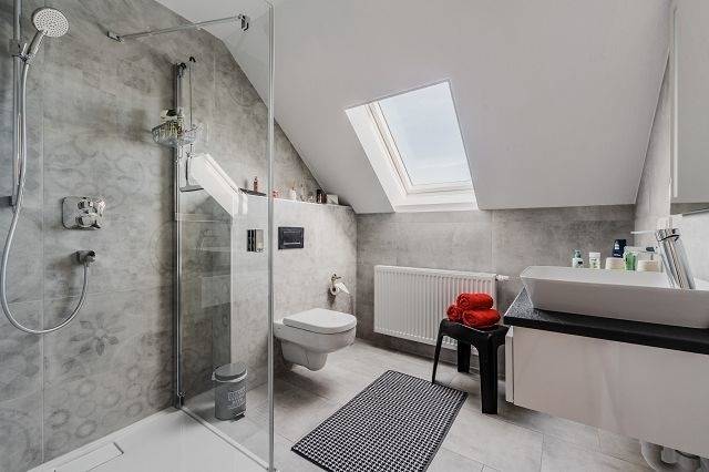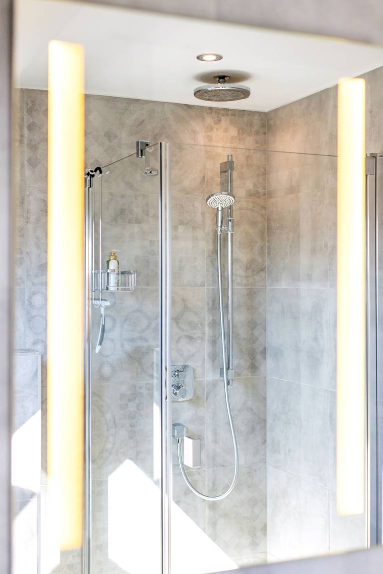 mit ebenerdiger Regendusche und Föhn.