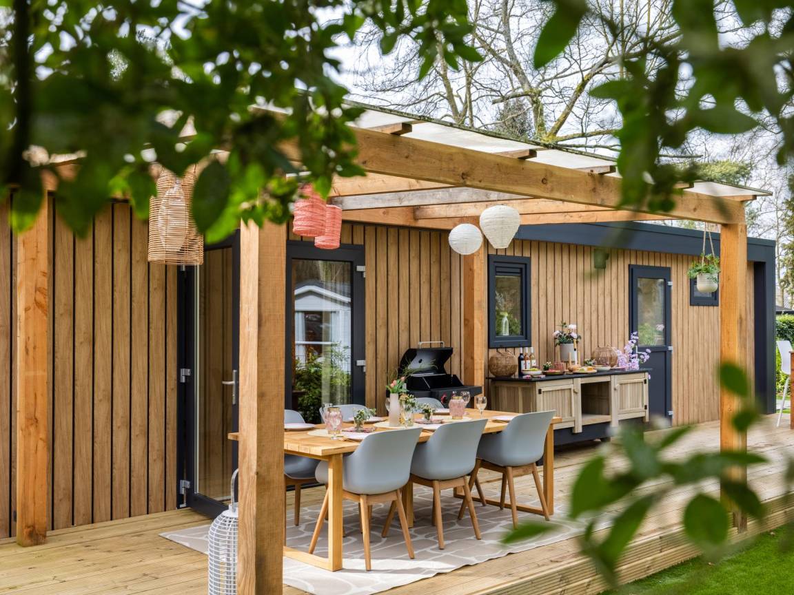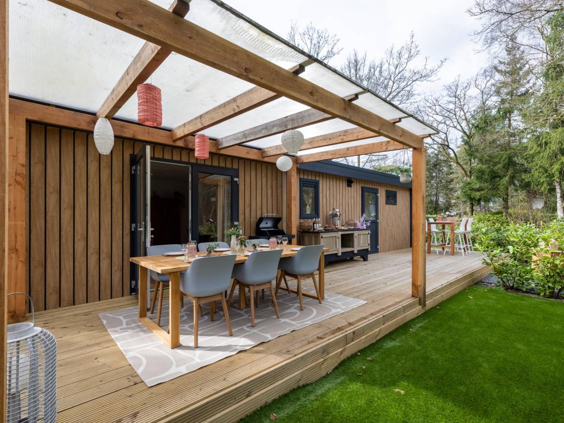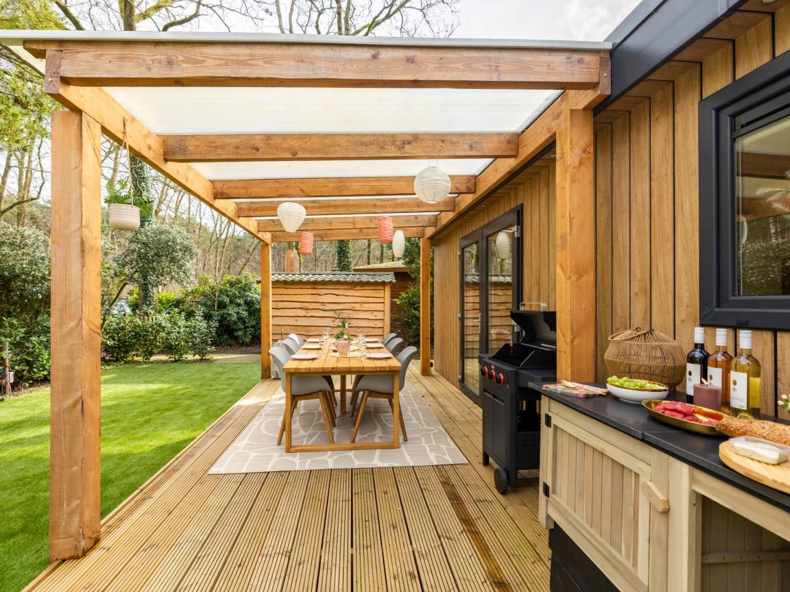 Hausbeschreibung : Stimmungsvol und luxuriöses Ferienhaus mitten in der Natur. Entspannen Sie auf der geräumigen überdachten Terrasse mit Außenküche, BBQ, Lounge und Liegen, mit Blick auf den Wald. Drinnen erwartet Sie ein gemütliches Wohnzimmer mit offener Küche, Klimaanlage, 2 Schlafzimmern und einem Schlafsofa. Die Betten sind bezogen und die frischen Handtücher liegen bereit. Kurz gesagt, der Genuss Ihres Urlaubs kann sofort beginnen.