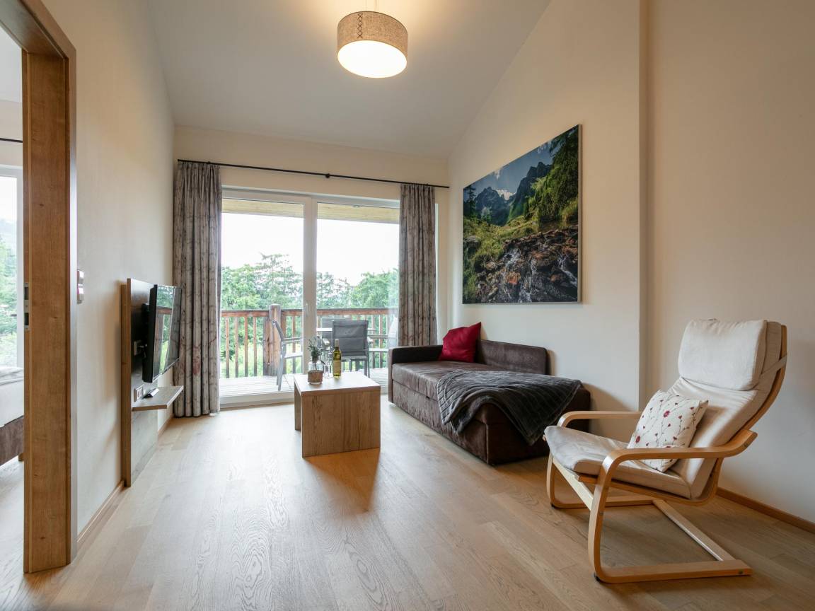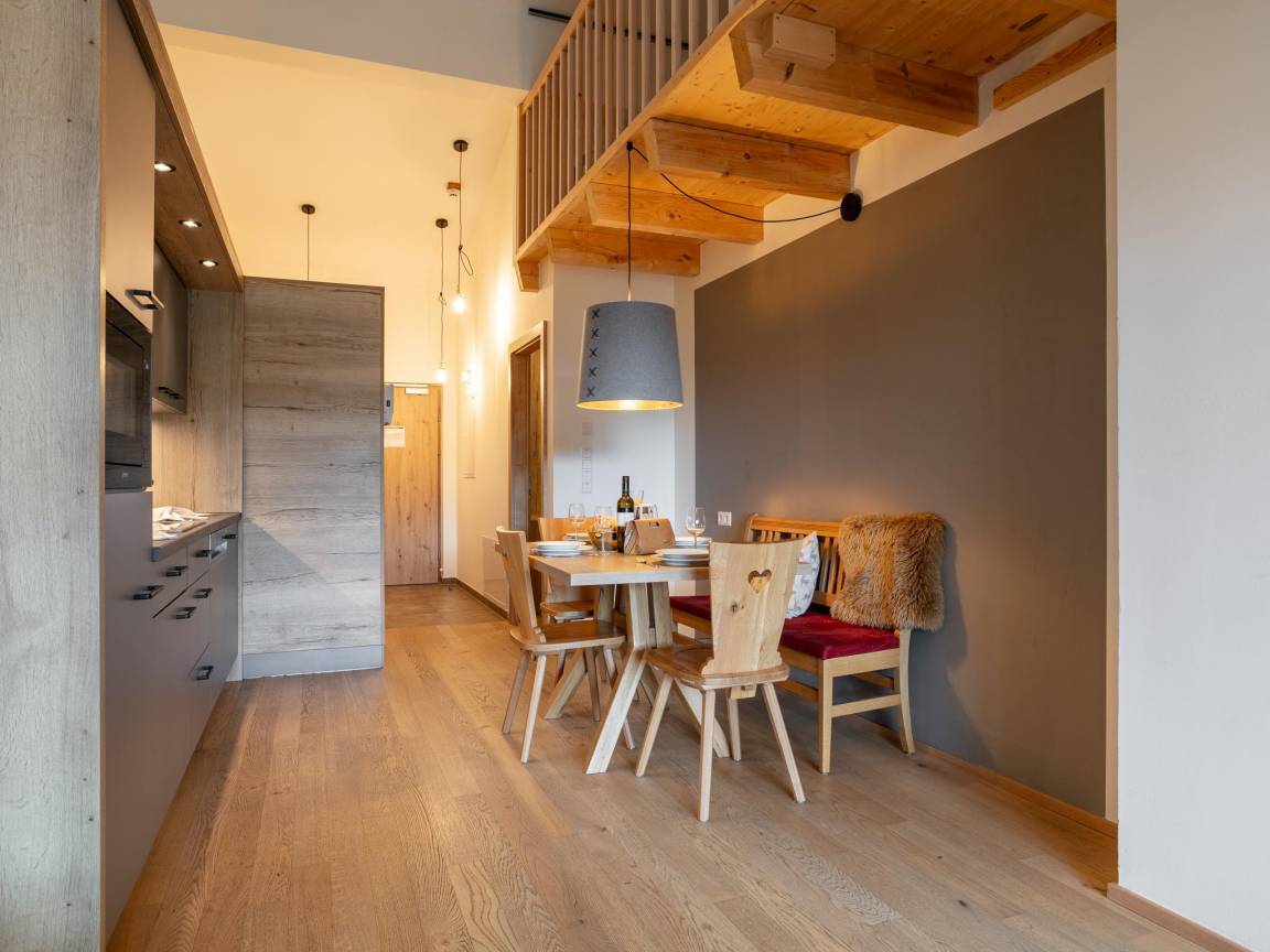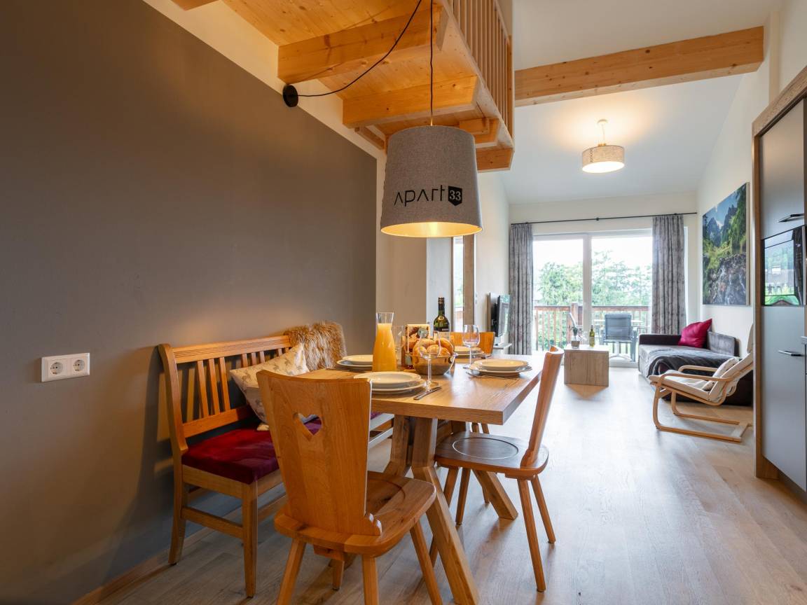 Hausbeschreibung : Willkommen in einer der 35 stilvollen Wohnungen, die sich auf zwei Gebäude in dieser erstklassigen Lage verteilen. Parken Sie Ihr Auto sicher unter dem Komplex und gehen Sie zu Fuß in Ihre Wohnung im alpinen Stil im dritten Stock. Die Wohnung bietet einen großen Balkon mit atemberaubender Aussicht, eine voll ausgestattete Küche und eine private Sauna für ultimative Entspannung. Komfort und Luxus in Reinkultur!