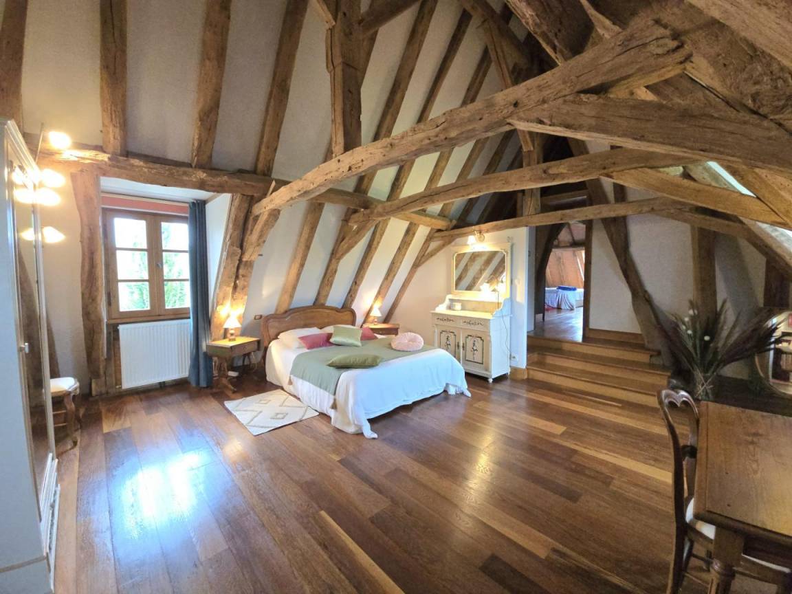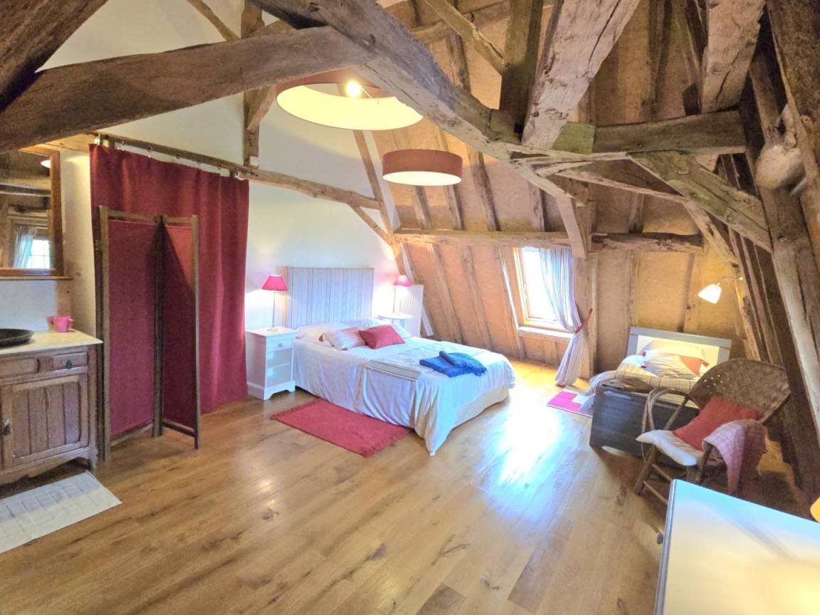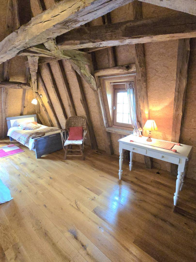 Im Obergeschoss: offenes Zimmer mit 140x190-Bett, Badezimmer mit WC sowie ein Schlafzimmer mit 140x190- und 90x190-Bett.