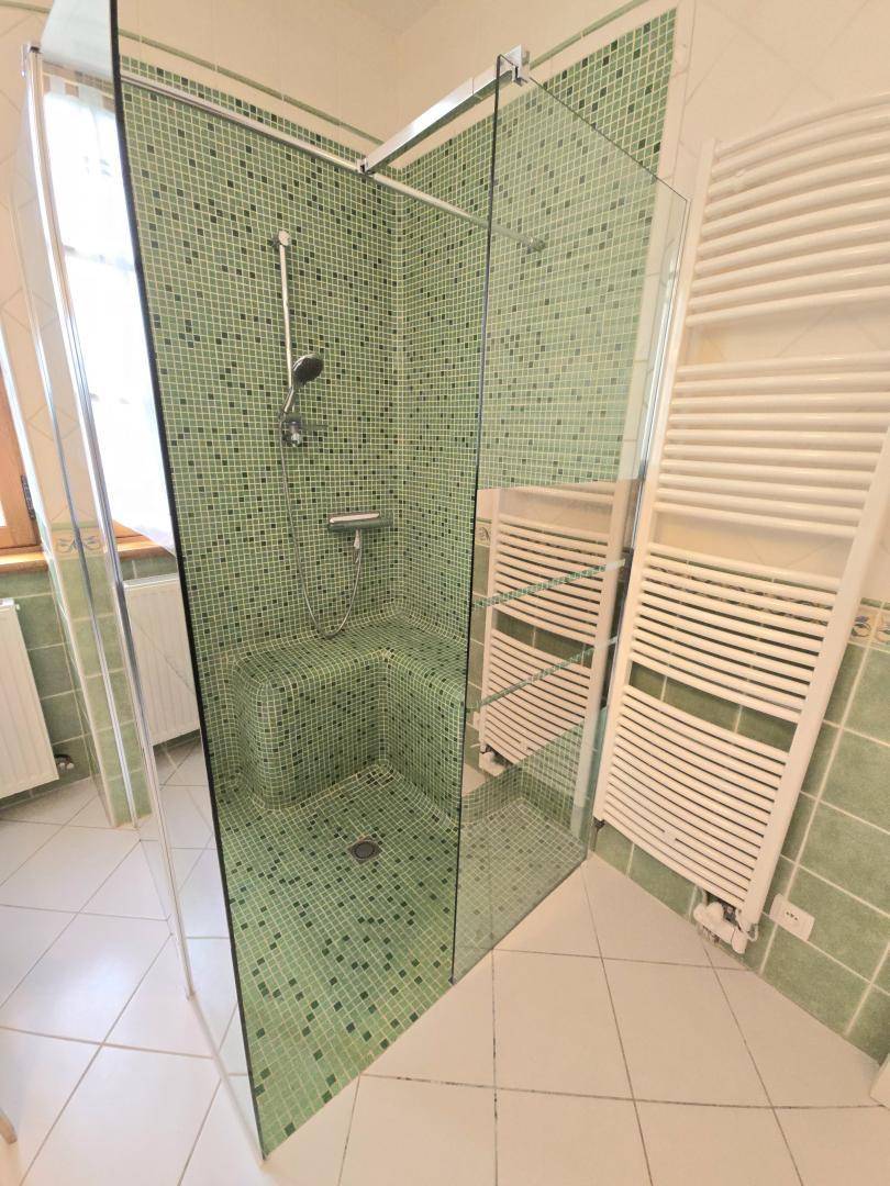 Im Erdgeschoss: Wohnzimmer mit Sitzecke, Essbereich und voll ausgestatteter offener Küche, Badezimmer mit Dusche, Eckbadewanne und WC, sowie ein Schlafzimmer mit Queensize-Bett. Vom Wohnzimmer Zugang zum chlorbehandelten Swimmingpool, geöffnet von Mitte Juni bis Ende Oktober und alarmgesichert (5 x 11 m, Tiefe 1,50–1,85 m, Familienbereich 0,25 m).