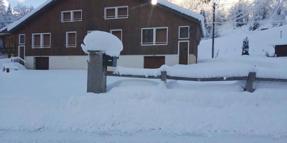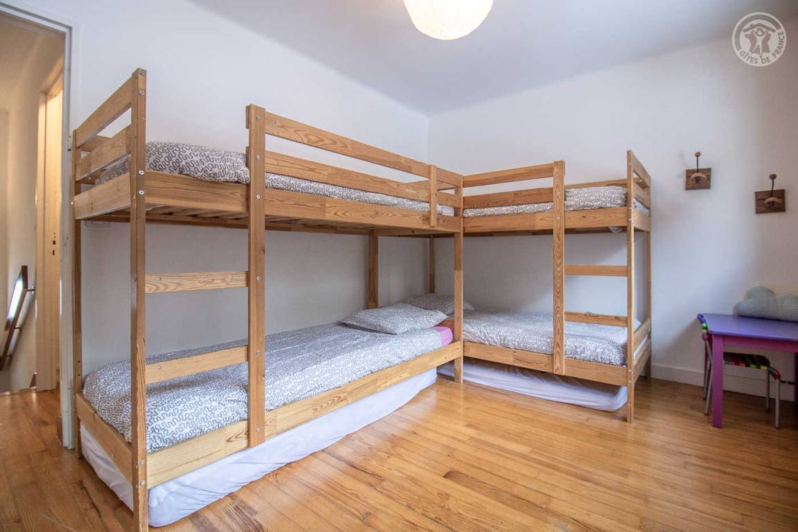 Haus mit zwei Gîtes. Unabhängiger Eingang im Erdgeschoss. 1. Stock: Wohnküche, WC, Duschbad, 1 Schlafzimmer (1 Doppelbett 140x190 cm). 2. Stock: 3 Schlafzimmer (4 Etagenbetten 90x190 cm / 1 Doppelbett 140x190 cm in einer Reihe mit einem Schlafzimmer ohne Fenster mit 1 Doppelbett 140x190 cm), Duschbad mit WC. Abstellraum für Ski und Fahrräder.