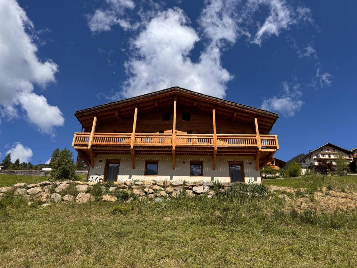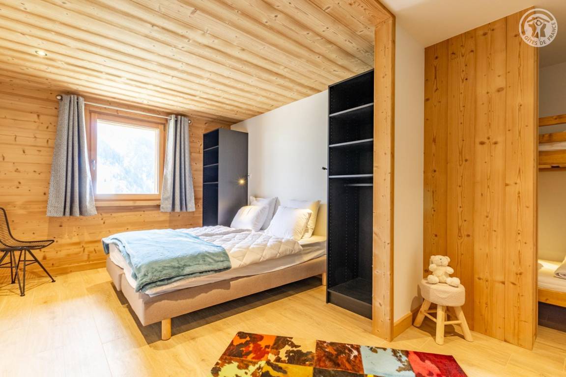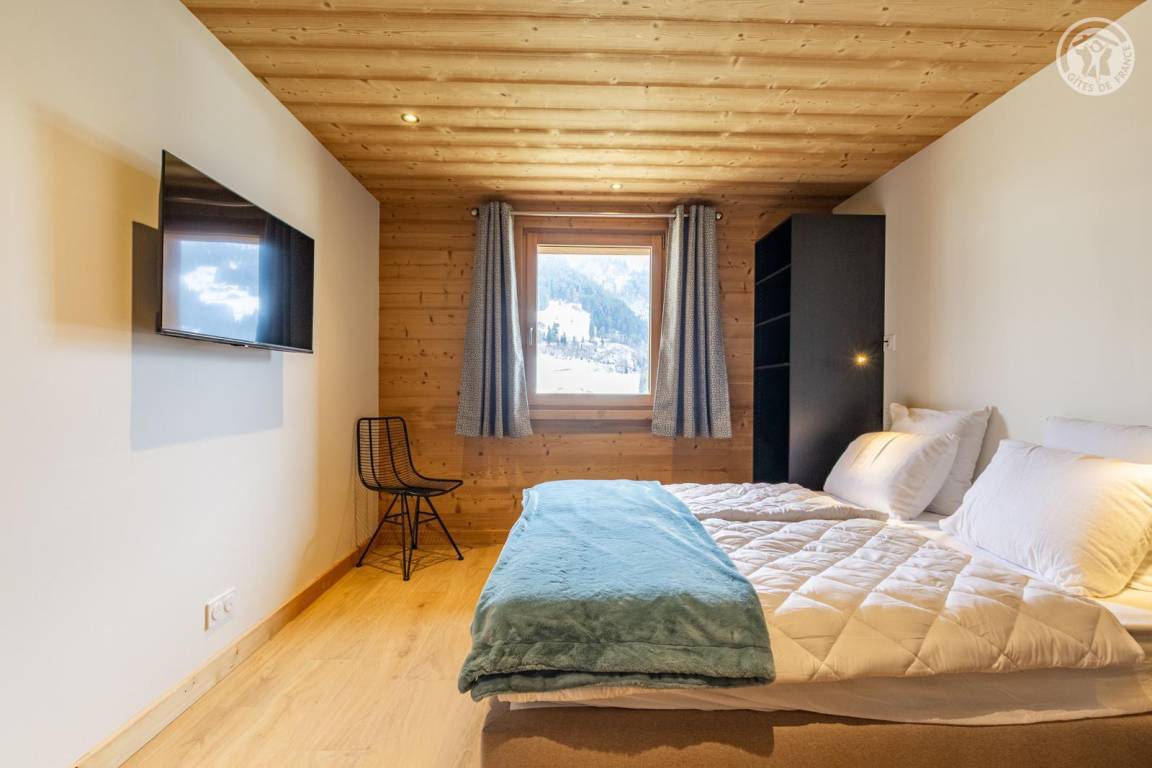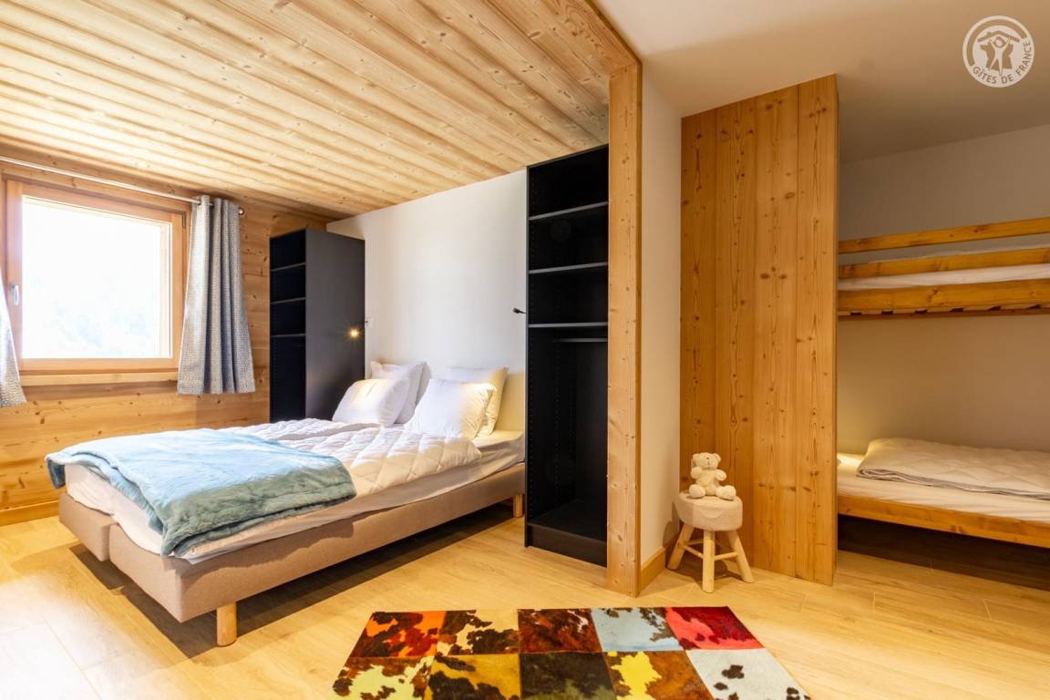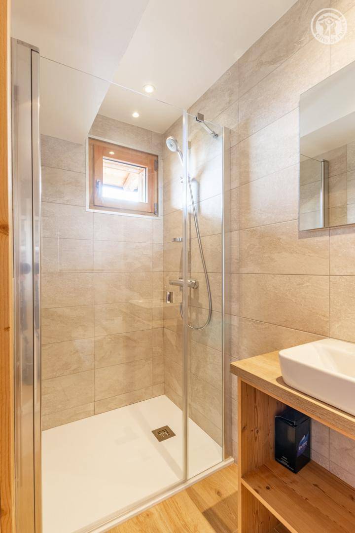 Chalet am Berghang inklusive einer ganzjährig vermietbaren Wohnung im Erdgeschoss. Auf 3 Ebenen, Eingang über die 1. Etage, die sich auf der gleichen Ebene wie der Parkplatz und die Tiefgarage befindet. Im Erdgeschoss: 1 Schlafzimmer mit Balkon und TV (2 Einzelbetten 80x200 cm, die zusammengestellt werden können + 2 Einzelstockbetten 90x190 cm), 1 Schlafzimmer mit eigenem Bad (Dusche) und TV (2 Einzelbetten 80x200 cm, die zusammengestellt werden können), Toilette, Bad (Dusche), Waschküche (Waschmaschine und Trockner). Im 1. Stock: Eingang, Wohnküche mit großem Balkon, 1 Schlafzimmer mit Balkon und TV (2 Einzelbetten 80x200 cm, die zusammengestellt werden können) mit eigenem Badezimmer (Dusche + WC), Skiraum. Im 2. OG: 1 Schlafzimmer (2 Einzelbetten 80x200 cm die zusammengestellt werden können) mit Duschbereich und Waschbecken, verglast und offen zum Wohnraum (mit einem zweiten Tageslichtfenster). Privater Parkplatz vor dem Chalet (4 Autos).