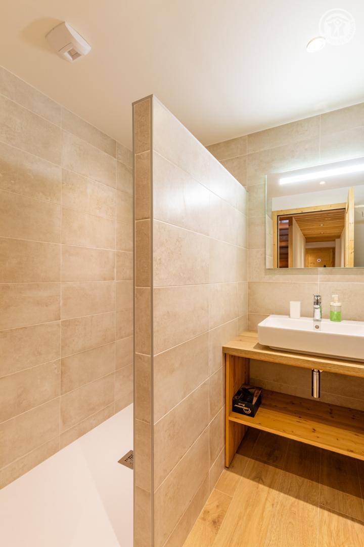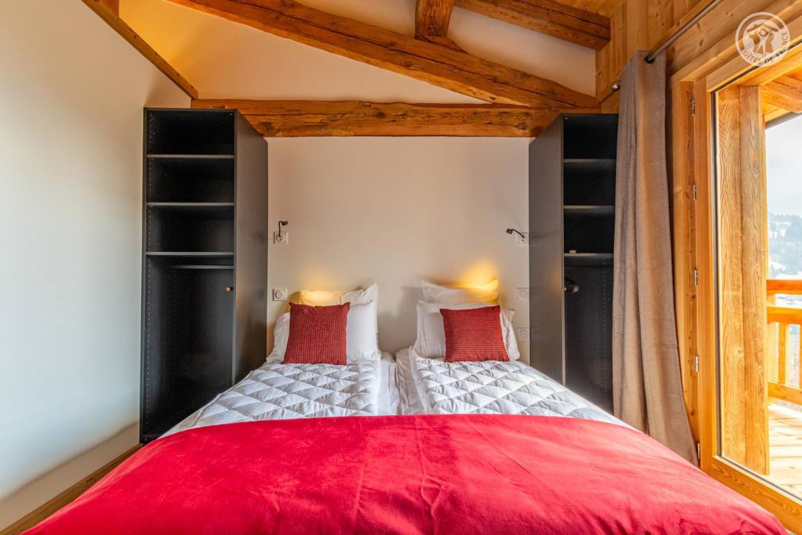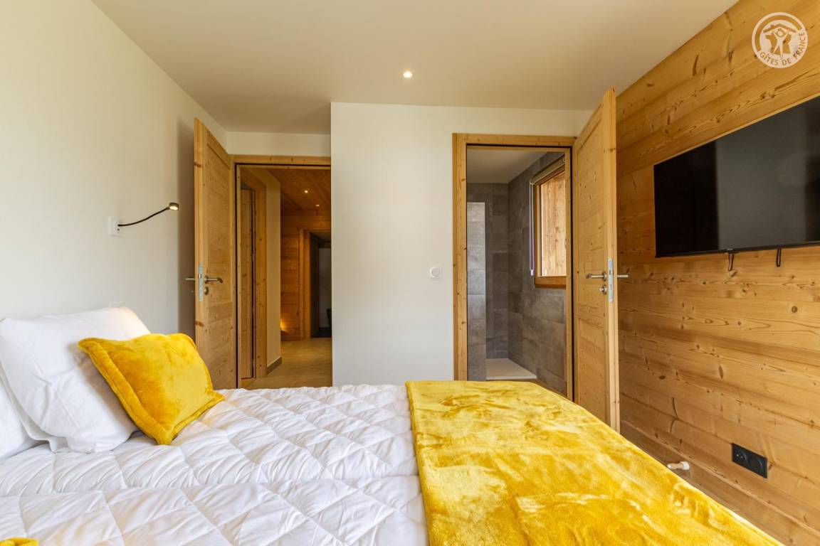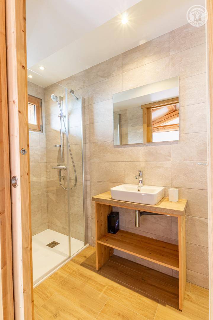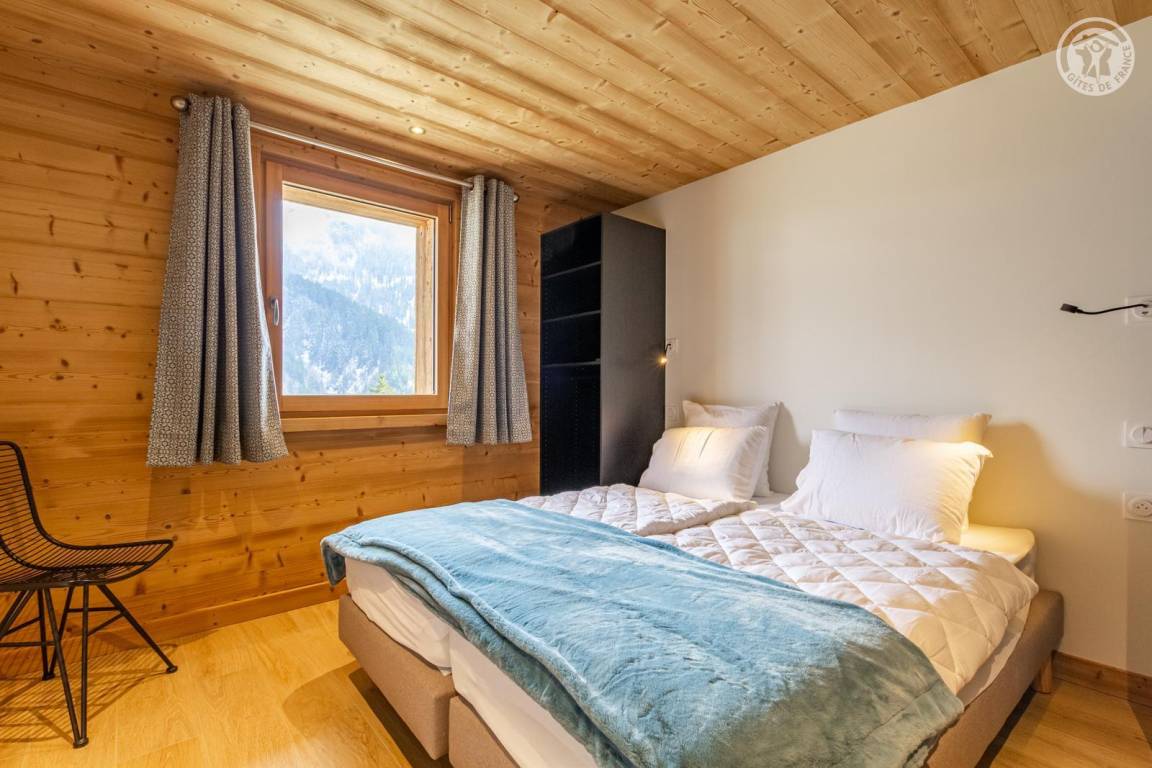 Chalet am Berghang inklusive einer ganzjährig vermietbaren Wohnung im Erdgeschoss. Auf 3 Ebenen, Eingang über die 1. Etage, die sich auf der gleichen Ebene wie der Parkplatz und die Tiefgarage befindet. Im Erdgeschoss: 1 Schlafzimmer mit Balkon und TV (2 Einzelbetten 80x200 cm, die zusammengestellt werden können + 2 Einzelstockbetten 90x190 cm), 1 Schlafzimmer mit eigenem Bad (Dusche) und TV (2 Einzelbetten 80x200 cm, die zusammengestellt werden können), Toilette, Bad (Dusche), Waschküche (Waschmaschine und Trockner). Im 1. Stock: Eingang, Wohnküche mit großem Balkon, 1 Schlafzimmer mit Balkon und TV (2 Einzelbetten 80x200 cm, die zusammengestellt werden können) mit eigenem Badezimmer (Dusche + WC), Skiraum. Im 2. OG: 1 Schlafzimmer (2 Einzelbetten 80x200 cm die zusammengestellt werden können) mit Duschbereich und Waschbecken, verglast und offen zum Wohnraum (mit einem zweiten Tageslichtfenster). Privater Parkplatz vor dem Chalet (4 Autos).