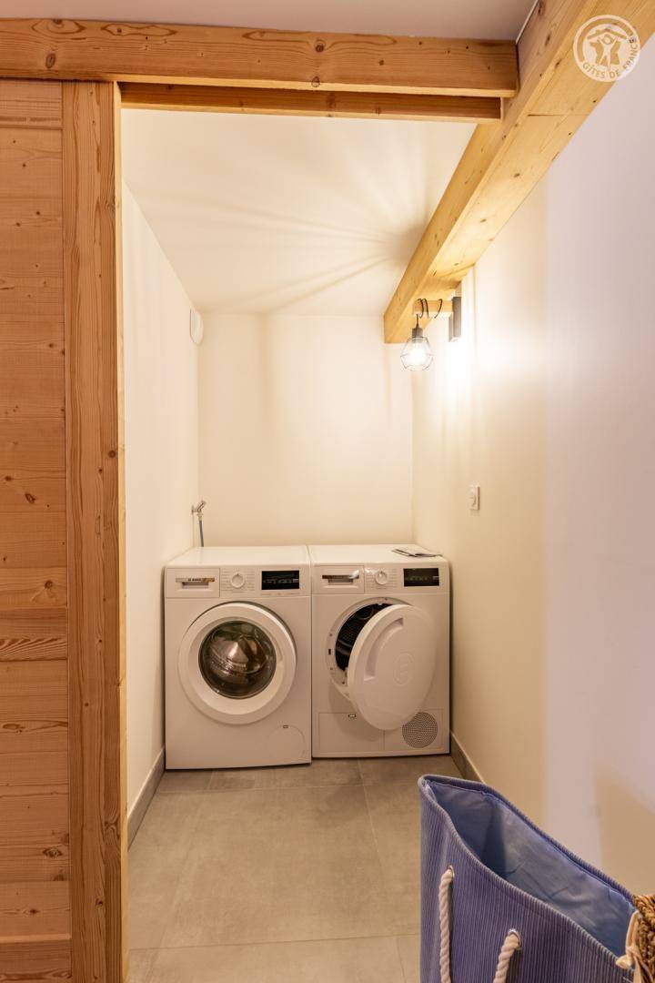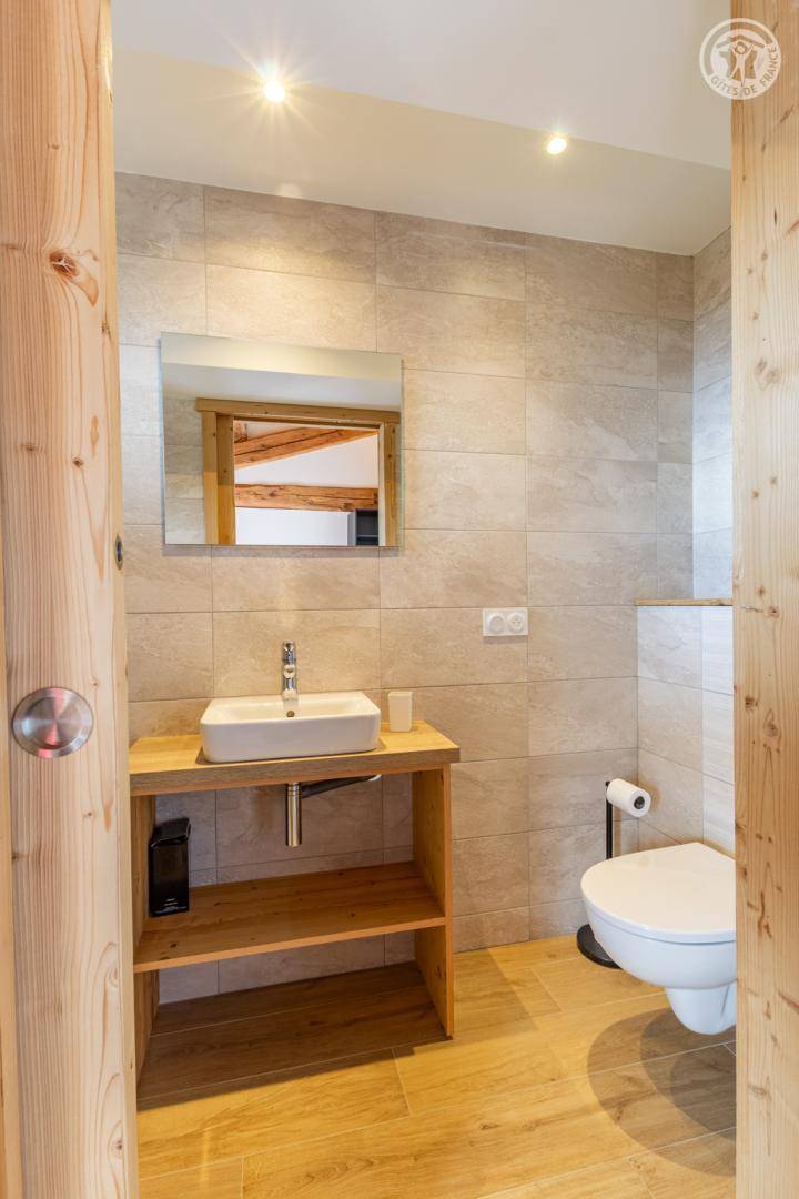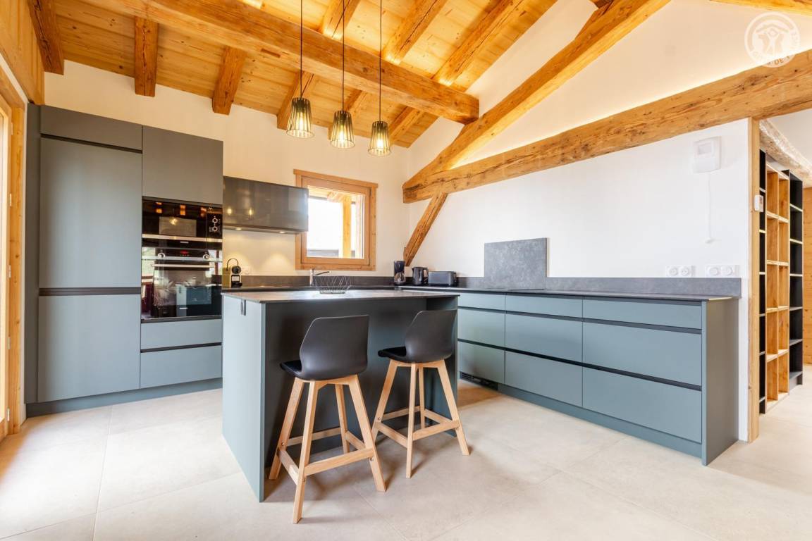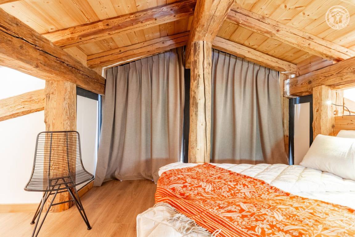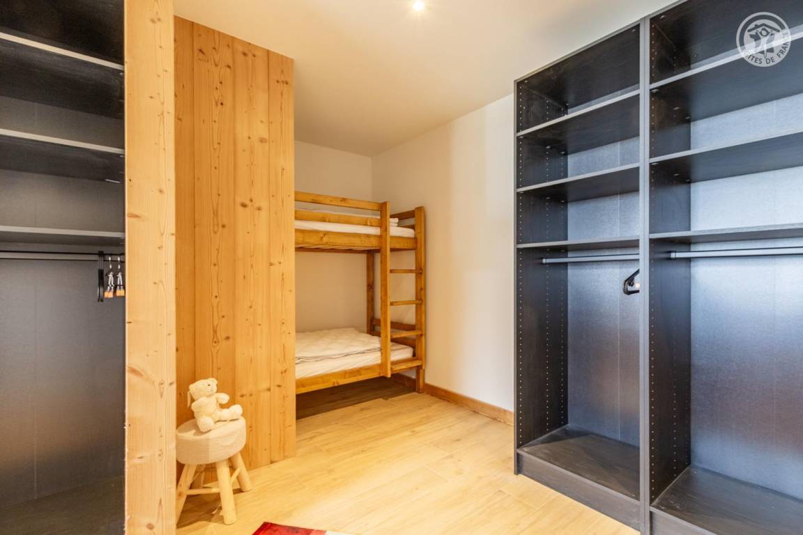 Chalet am Berghang inklusive einer ganzjährig vermietbaren Wohnung im Erdgeschoss. Auf 3 Ebenen, Eingang über die 1. Etage, die sich auf der gleichen Ebene wie der Parkplatz und die Tiefgarage befindet. Im Erdgeschoss: 1 Schlafzimmer mit Balkon und TV (2 Einzelbetten 80x200 cm, die zusammengestellt werden können + 2 Einzelstockbetten 90x190 cm), 1 Schlafzimmer mit eigenem Bad (Dusche) und TV (2 Einzelbetten 80x200 cm, die zusammengestellt werden können), Toilette, Bad (Dusche), Waschküche (Waschmaschine und Trockner). Im 1. Stock: Eingang, Wohnküche mit großem Balkon, 1 Schlafzimmer mit Balkon und TV (2 Einzelbetten 80x200 cm, die zusammengestellt werden können) mit eigenem Badezimmer (Dusche + WC), Skiraum. Im 2. OG: 1 Schlafzimmer (2 Einzelbetten 80x200 cm die zusammengestellt werden können) mit Duschbereich und Waschbecken, verglast und offen zum Wohnraum (mit einem zweiten Tageslichtfenster). Privater Parkplatz vor dem Chalet (4 Autos).
