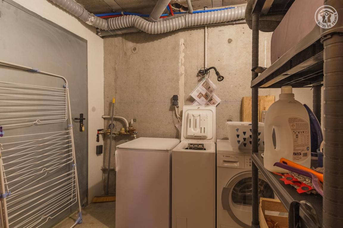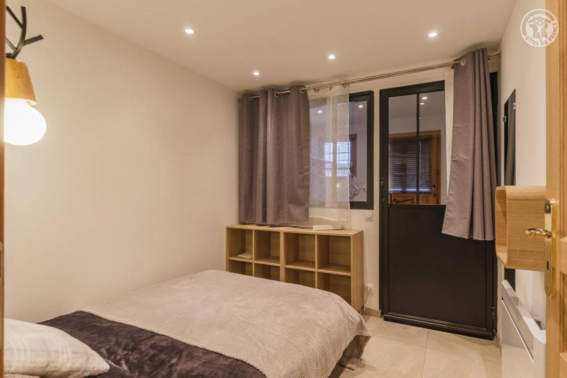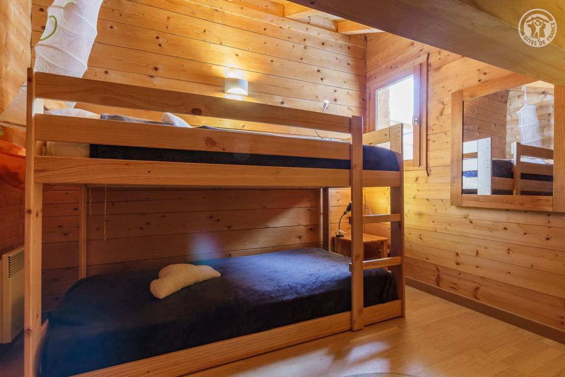 Gite verteilt auf 3 Ebenen. Erdgeschoss: Garage, Eingang zum Schlafzimmer (1 Doppelbett 140 x 190 cm – keine Öffnung nach außen, aber Fenster am zweiten Tag öffnet sich zum Eingang), eine Waschküche (2. Gefrierschrank), ein Badezimmer (Dusche und WC). 1. Etage: Wohnküche (manuell aufgeladener Pelletofen, orange angeschlossener Fernseher), 1 Schlafzimmer (1 Doppelbett 140 x 190 cm mit Duschkabine, kein Waschbecken). 2. Etage: 2 Schlafzimmer am Hang (3 Einzelbetten 90x190 cm, davon 2 Etagenbetten / 1 Doppelbett 140x200 cm), eine Nische am Hang ideal für ein Kind (1 Einzelbett 90x190 cm), ein Badezimmer mit Wasser (Dusche, 2 Waschbecken und WC). Terrasse.