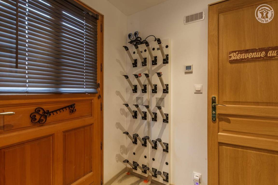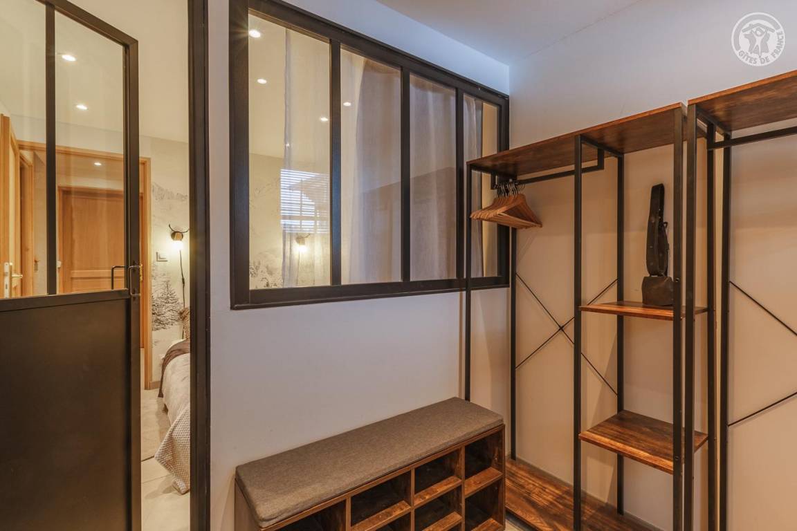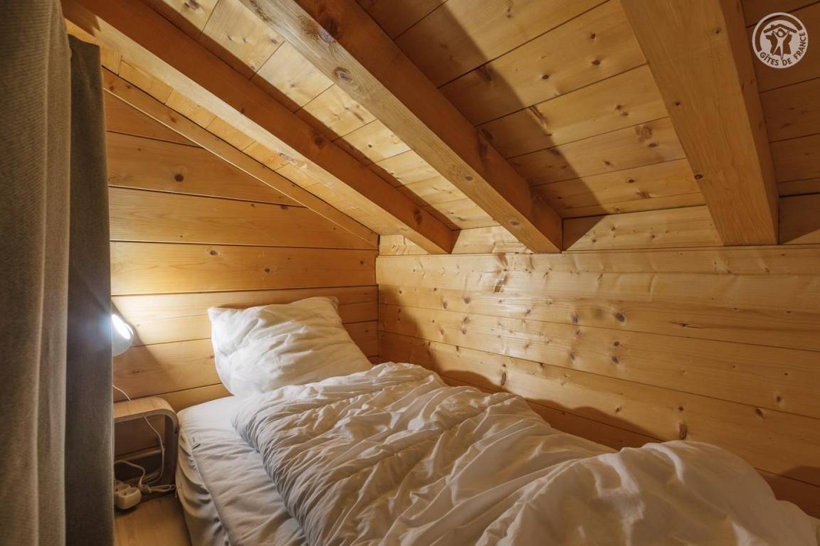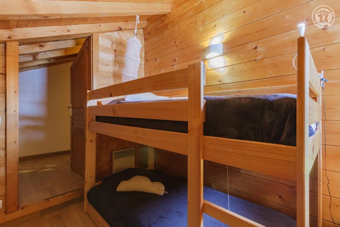 Gite verteilt auf 3 Ebenen. Erdgeschoss: Garage, Eingang zum Schlafzimmer (1 Doppelbett 140 x 190 cm – keine Öffnung nach außen, aber Fenster am zweiten Tag öffnet sich zum Eingang), eine Waschküche (2. Gefrierschrank), ein Badezimmer (Dusche und WC). 1. Etage: Wohnküche (manuell aufgeladener Pelletofen, orange angeschlossener Fernseher), 1 Schlafzimmer (1 Doppelbett 140 x 190 cm mit Duschkabine, kein Waschbecken). 2. Etage: 2 Schlafzimmer am Hang (3 Einzelbetten 90x190 cm, davon 2 Etagenbetten / 1 Doppelbett 140x200 cm), eine Nische am Hang ideal für ein Kind (1 Einzelbett 90x190 cm), ein Badezimmer mit Wasser (Dusche, 2 Waschbecken und WC). Terrasse.
