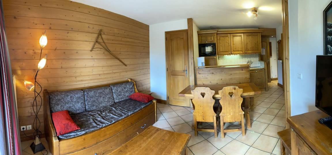 Die Residenz Le Village des Lapons C ist eine Residenz mit Aufzügen im Ferienort Les Saisies. Dieses kleine Gebäude im savoyischen Stil genießt eine außergewöhnliche Lage im Stadtteil La Chapelle. Es ist nur einen Steinwurf vom Wasserpark und der Bowlingbahn entfernt. Das Dorfzentrum und die Geschäfte befinden sich 700 Meter vom Gebäude entfernt. Genießen Sie einen beheizten Innenpool. Fläche von ungefähr 40 m². 1te Etage. Orientierung : Süd. Blick skipisten und Berg. Wohnzimmer mit Ausziehschlafcouch für 2 Personen, TV. 2 Schlafzimmer mit 2 zwei Einzelbetten (80). mit Wasserkocher, Kaffeemaschine, kleiner Backofen mit Mikrowellenfunktion, Toaster, Geschirrspülmaschine, Glaskeramikkochfelder. Badezimmer. Waschräume. separates WC. Balkon mit Gartentisch und -stühle.