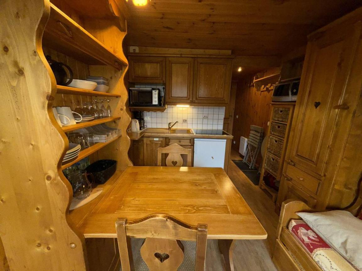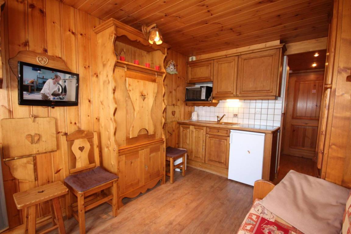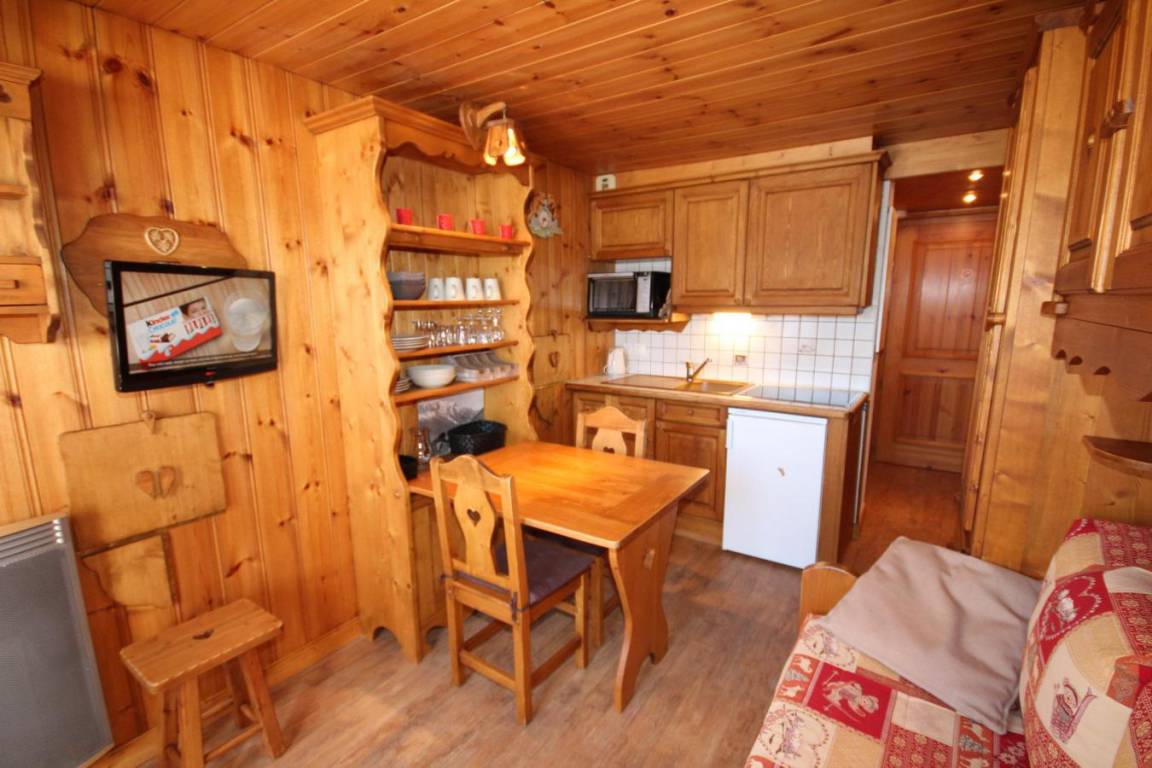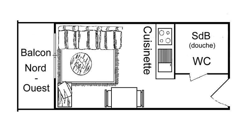 Fläche von ungefähr 14 m². 1te Etage. Orientierung : West. Blick skipisten ODER Blick berg (Mont bisanne). Wohnzimmer mit einfache Klappschlafcouch, TV. Kochnische mit Wasserkocher, Kaffeemaschine, Backofen, Mikrowellenherd, 4 Glaskeramikkochfelder. Waschräume mit Dusche, WC.