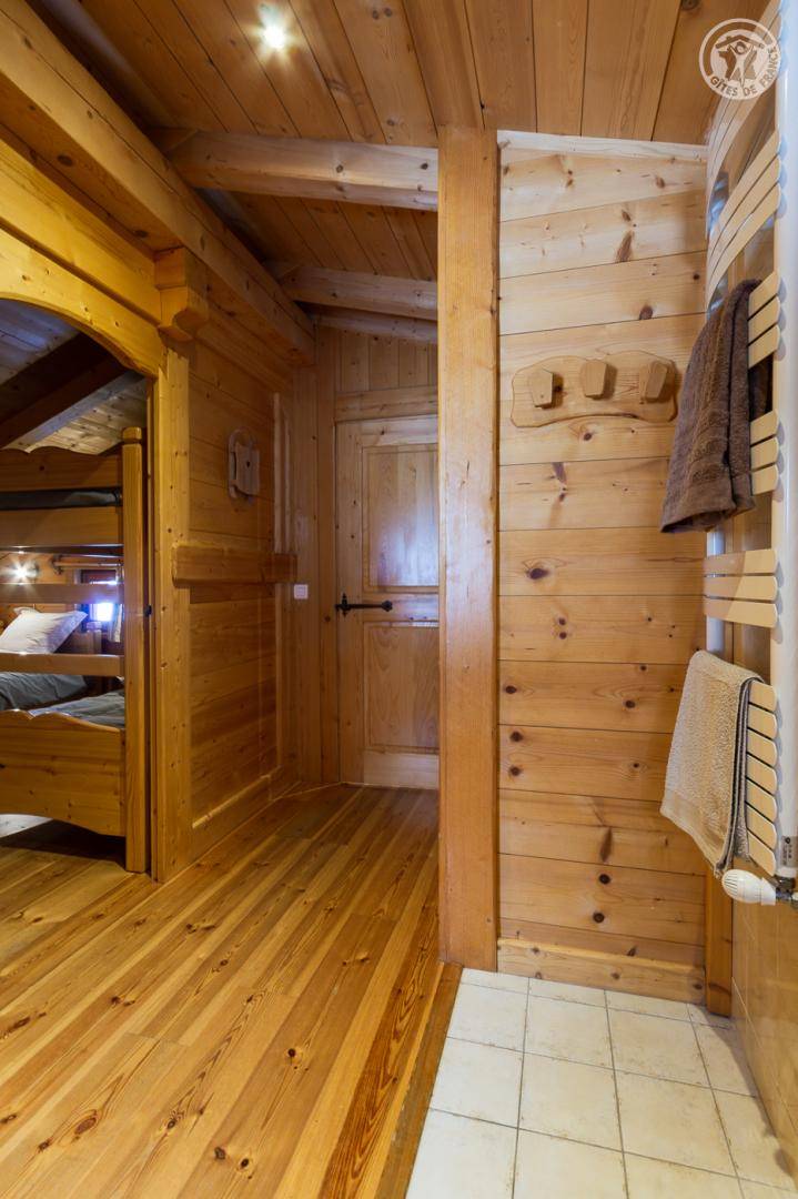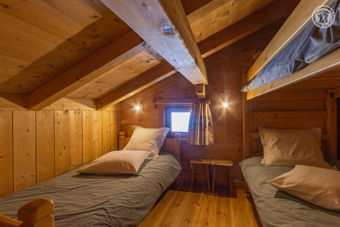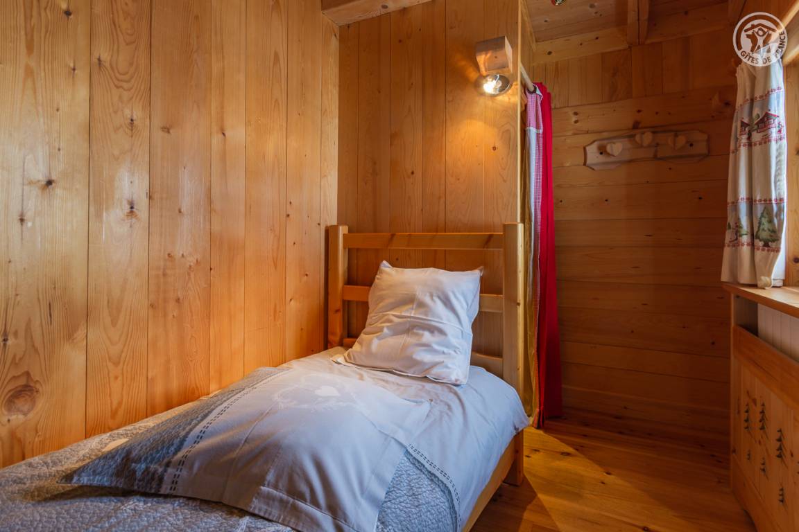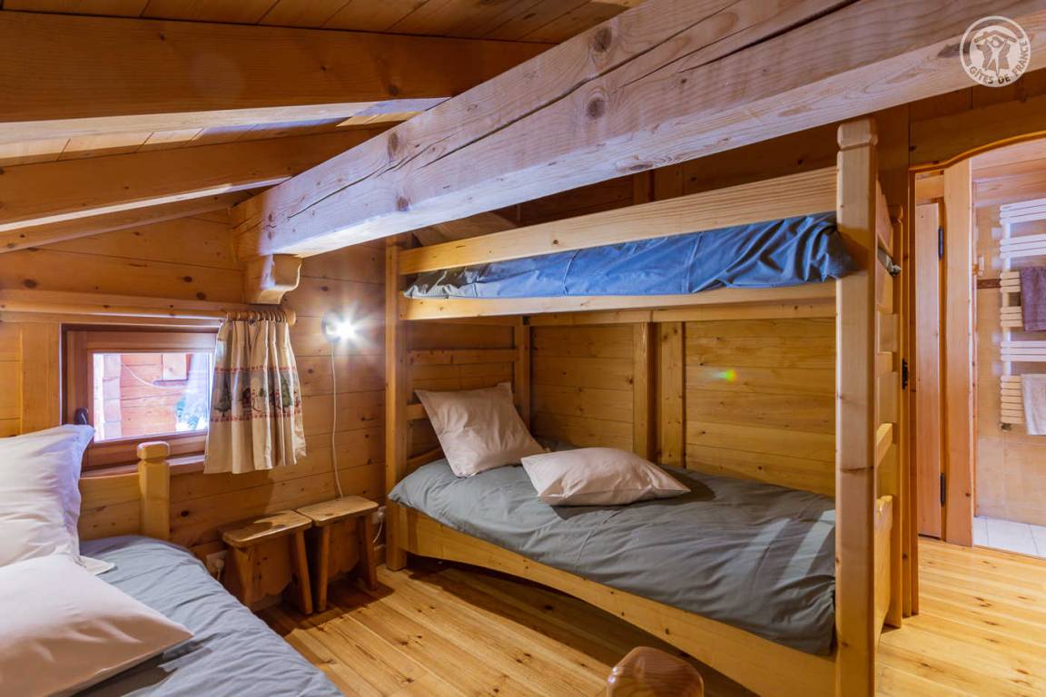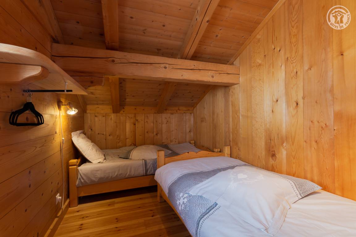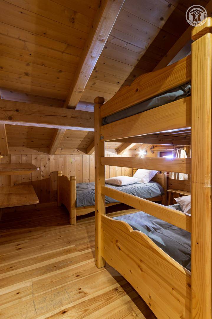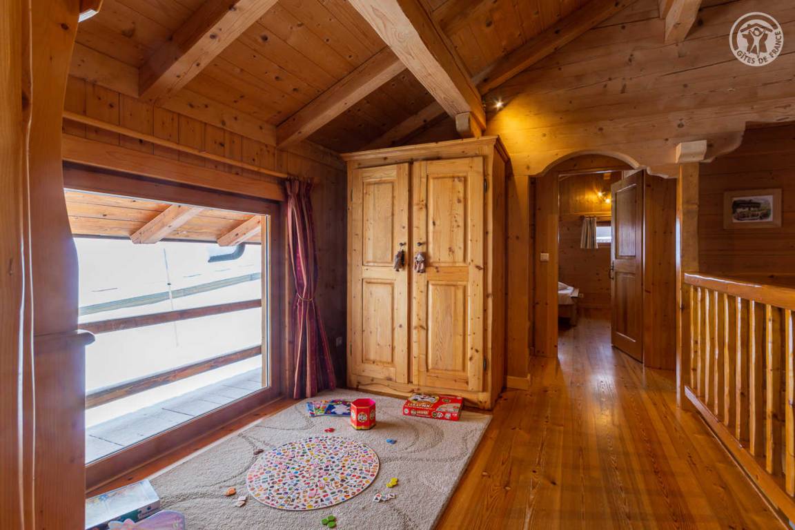 Individuelles Chalet auf 2 Ebenen, bestehend aus auf der Gartenebene: Eingang, Wohnzimmer-Küchenbereich, WC mit Waschbecken, Waschküche. 1. Stock: Mezzanine mit Spielbereich für Kinder, Duschbad, separates WC, 3 Schlafzimmer, davon 1 mit eigenem Duschbad (1 Einzelbett, 1 Doppelbett / 1 Doppelbett / 1 2 Personen), eine Suite mit 2 kleinen Schlafzimmern im Dachgeschoss (2 Einzelbetten / 3 Einzelbetten davon 2 Etagenbetten), einem Duschbad und WC. Balkon. Boden