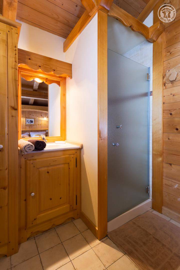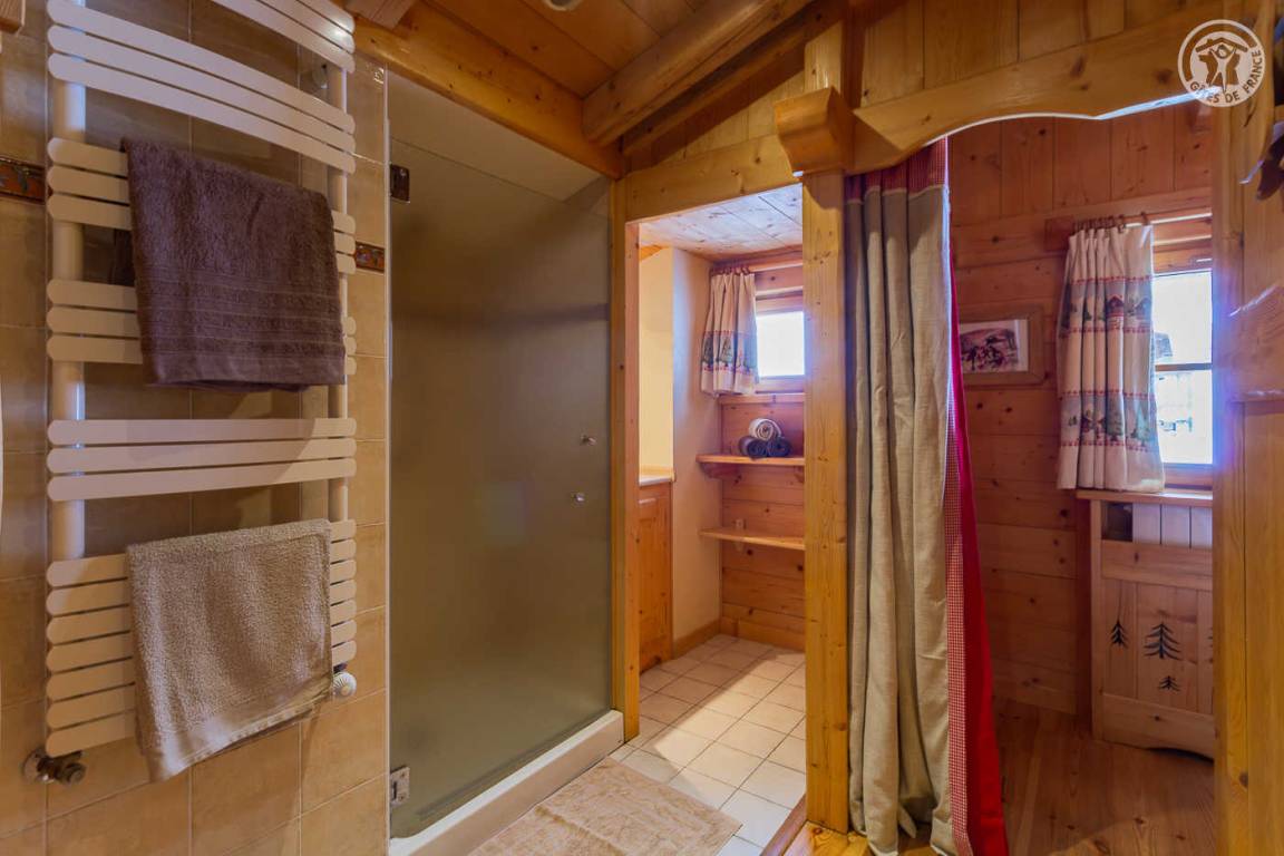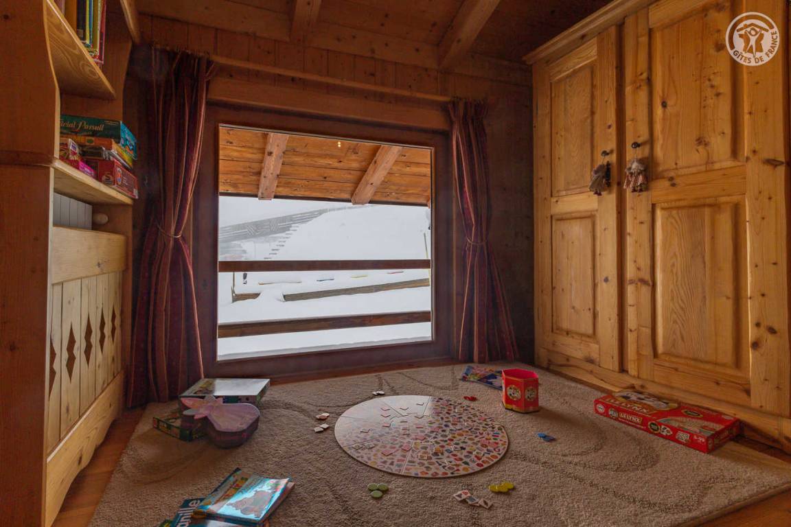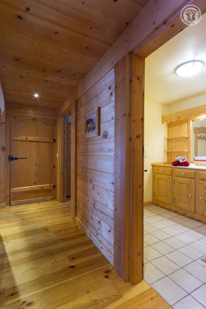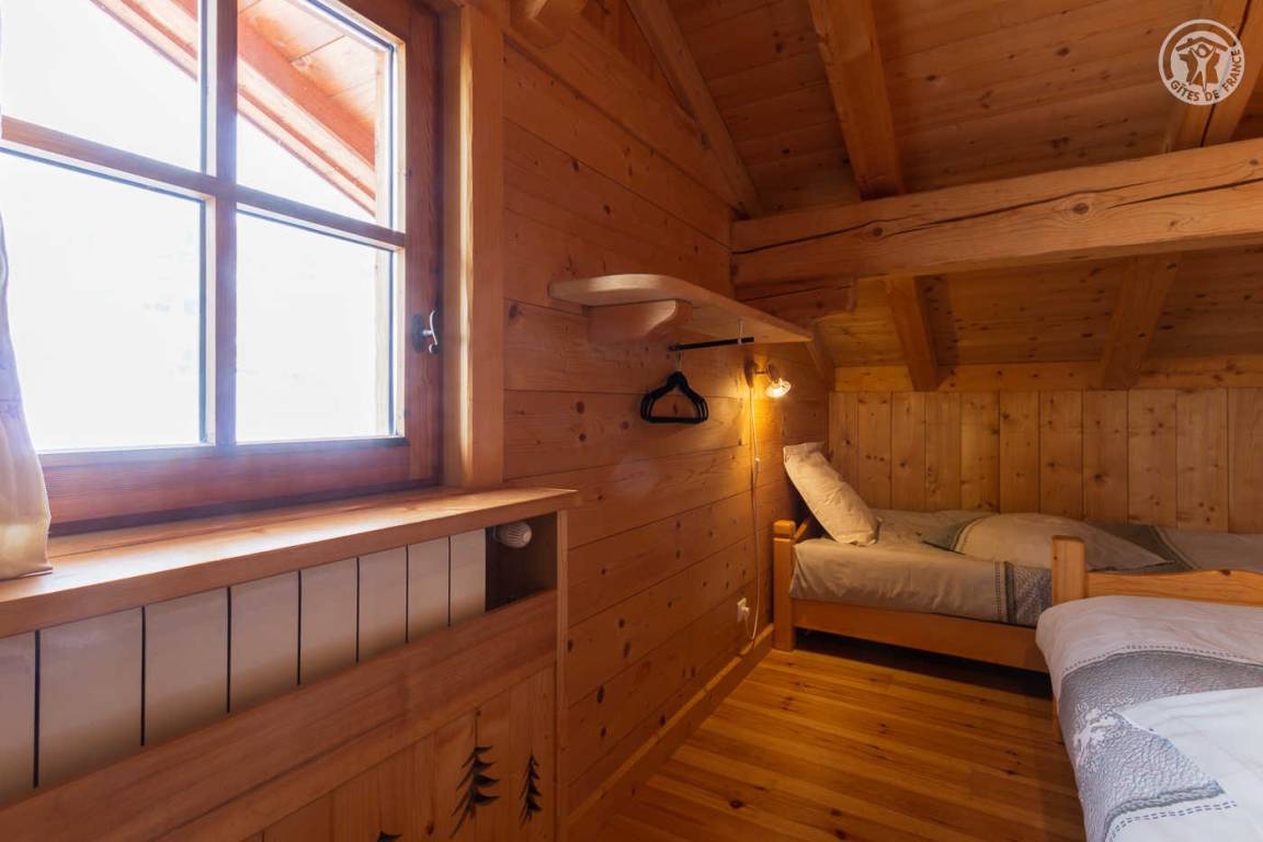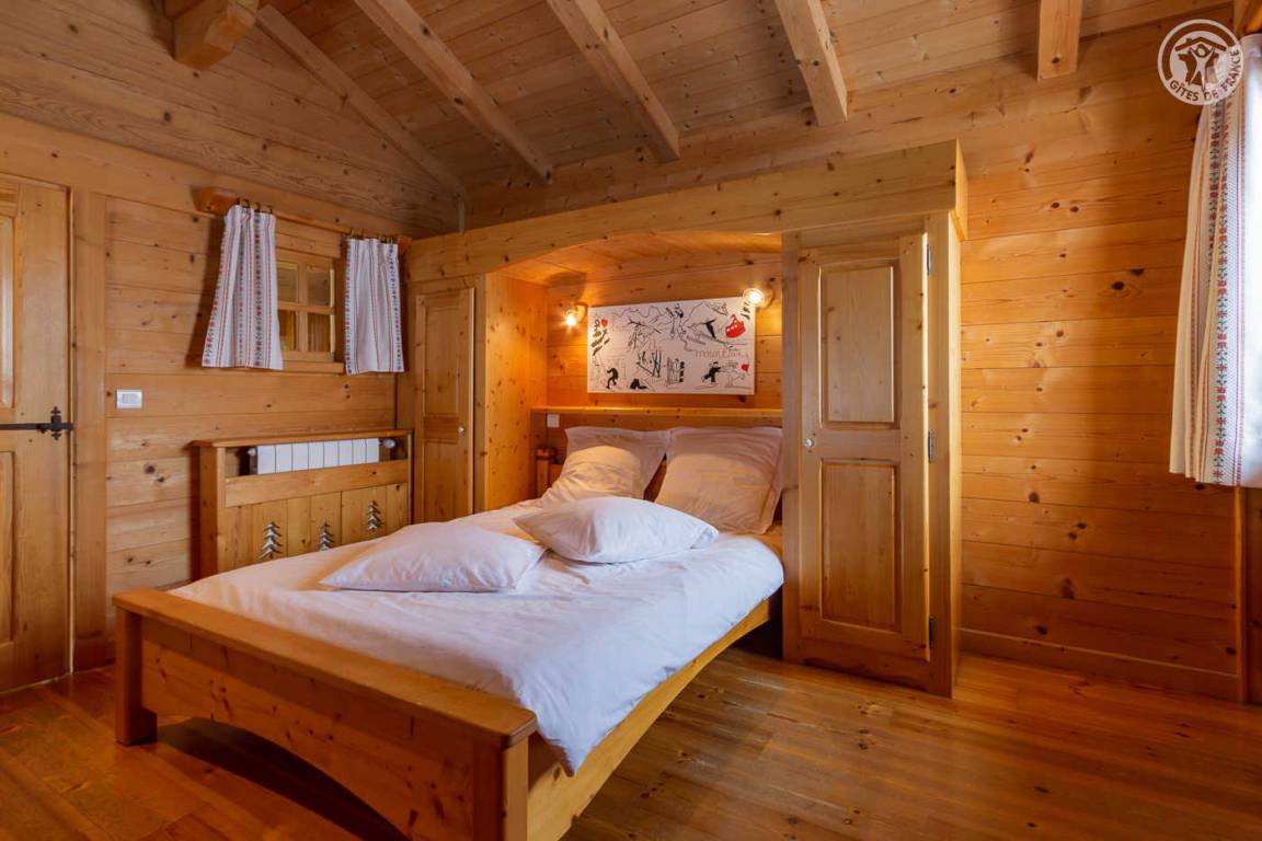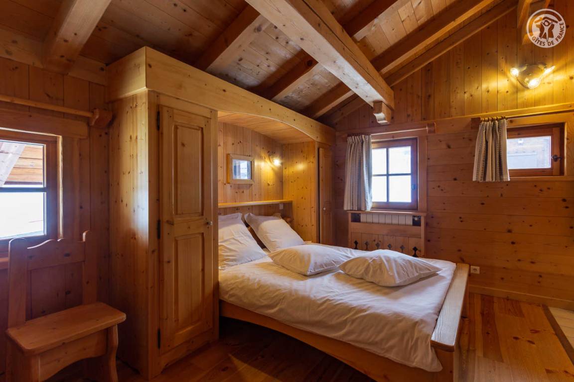 Individuelles Chalet auf 2 Ebenen, bestehend aus auf der Gartenebene: Eingang, Wohnzimmer-Küchenbereich, WC mit Waschbecken, Waschküche. 1. Stock: Mezzanine mit Spielbereich für Kinder, Duschbad, separates WC, 3 Schlafzimmer, davon 1 mit eigenem Duschbad (1 Einzelbett, 1 Doppelbett / 1 Doppelbett / 1 2 Personen), eine Suite mit 2 kleinen Schlafzimmern im Dachgeschoss (2 Einzelbetten / 3 Einzelbetten davon 2 Etagenbetten), einem Duschbad und WC. Balkon. Boden